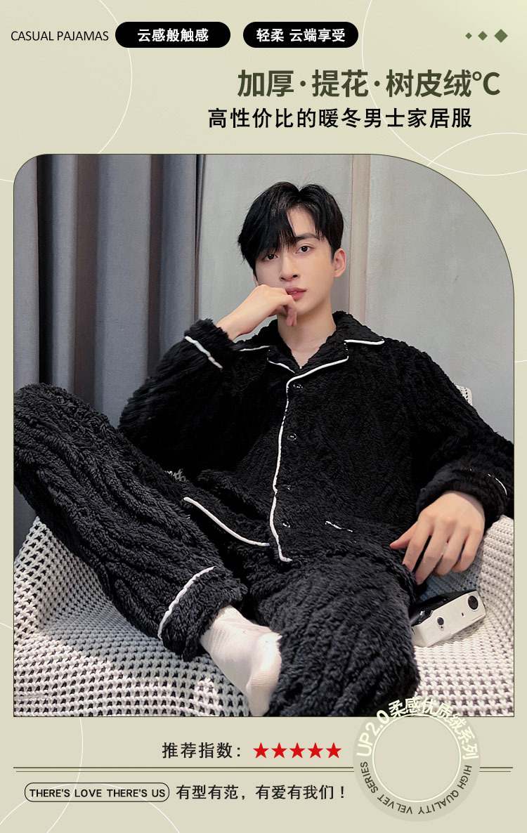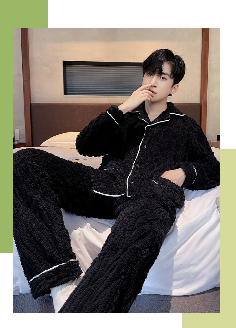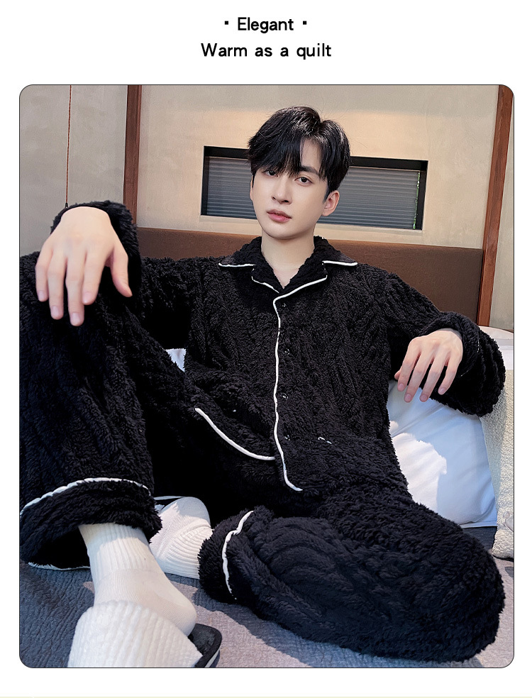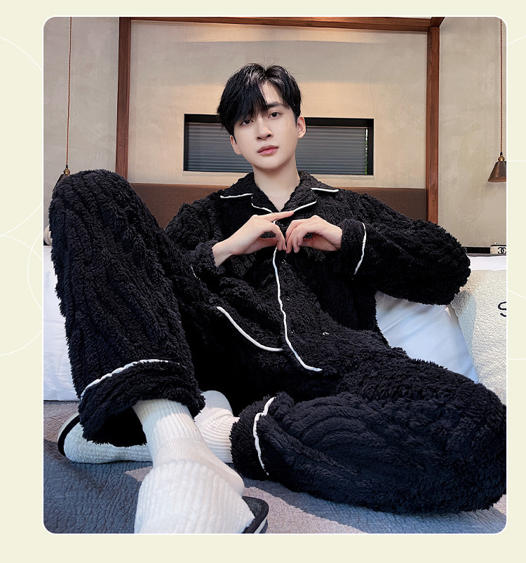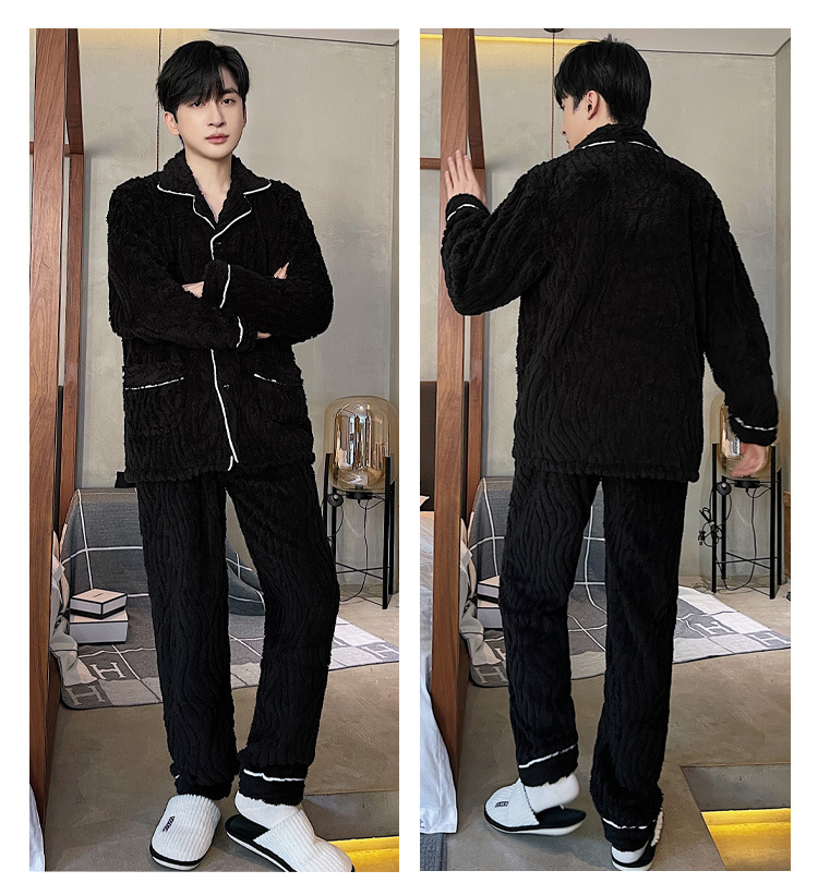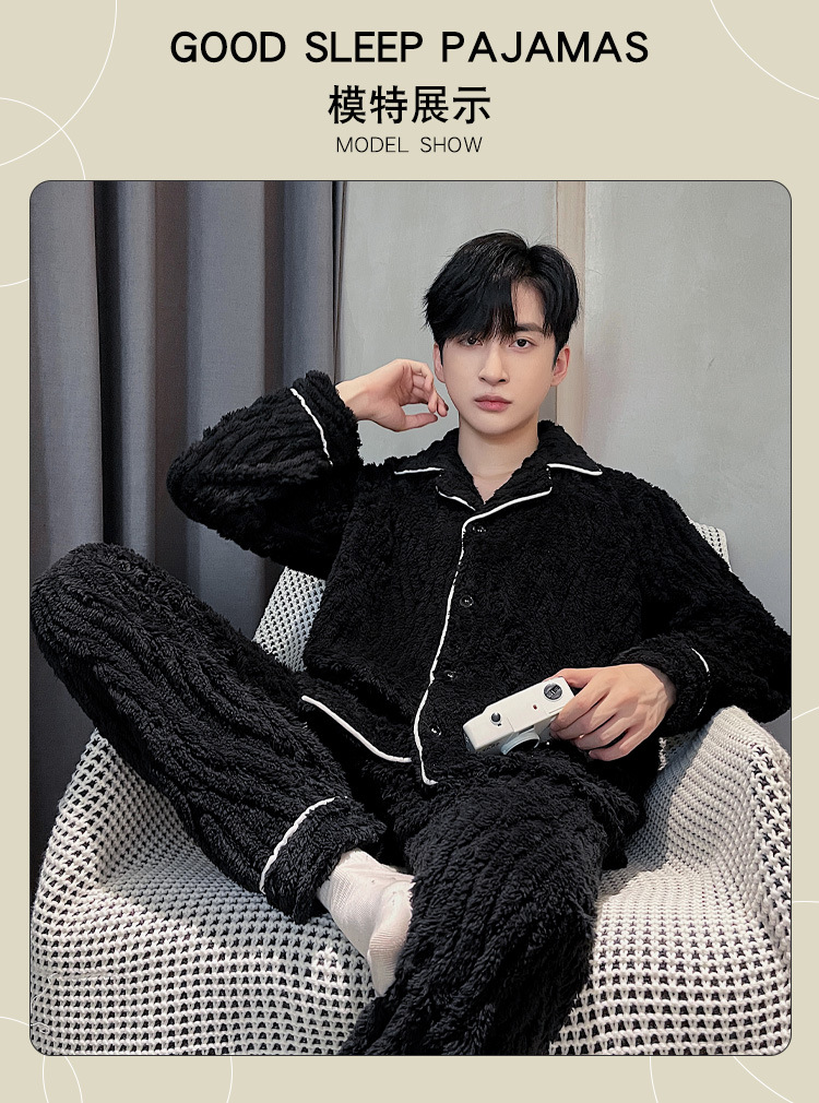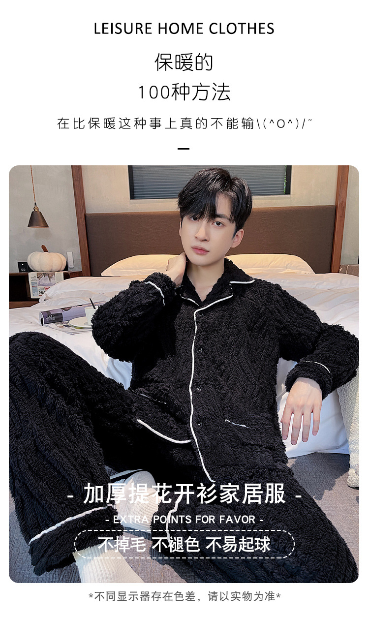 冬季新款珊瑚绒睡衣男士青年保暖加厚法兰绒开衫家居服可外穿套装