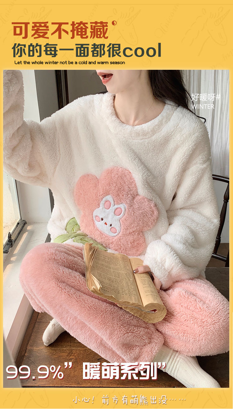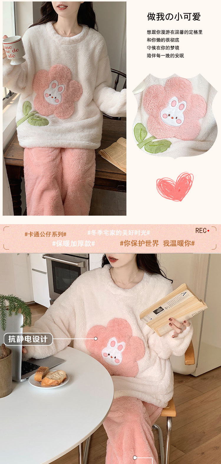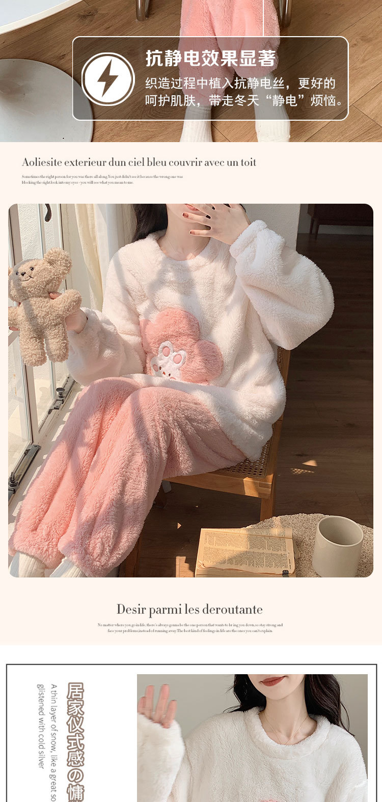 冬季新款珊瑚绒睡衣可爱舒适保暖甜美花朵法兰绒家居服可外穿套装