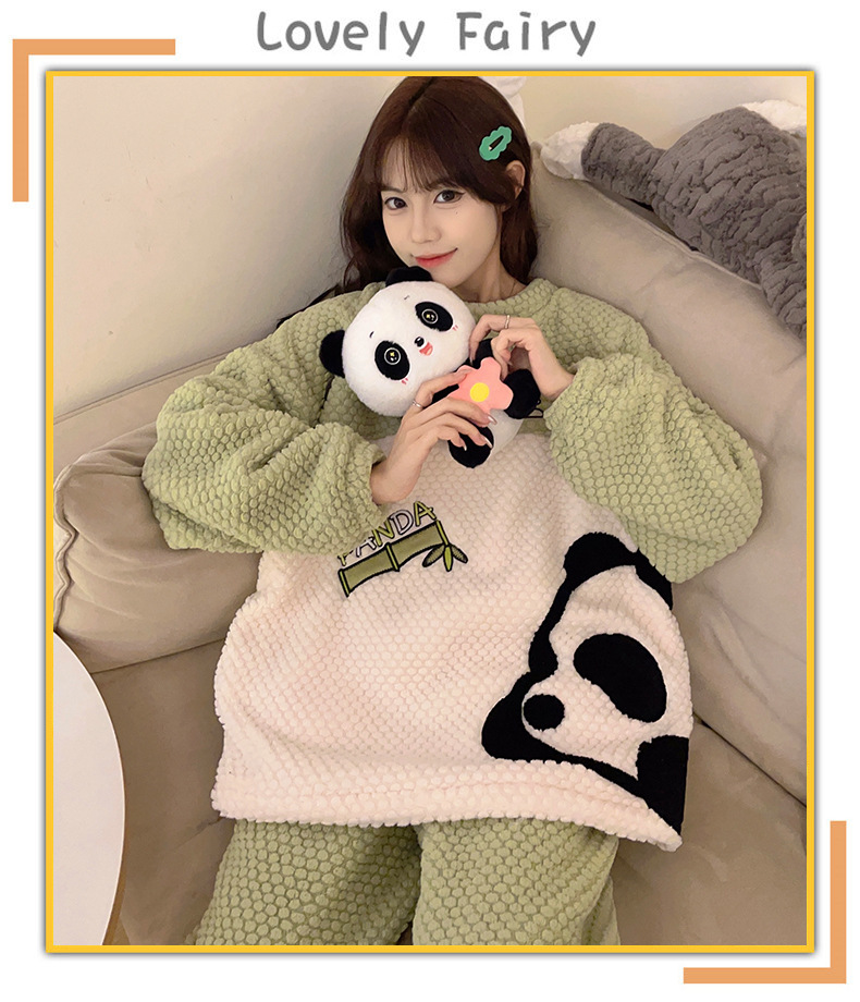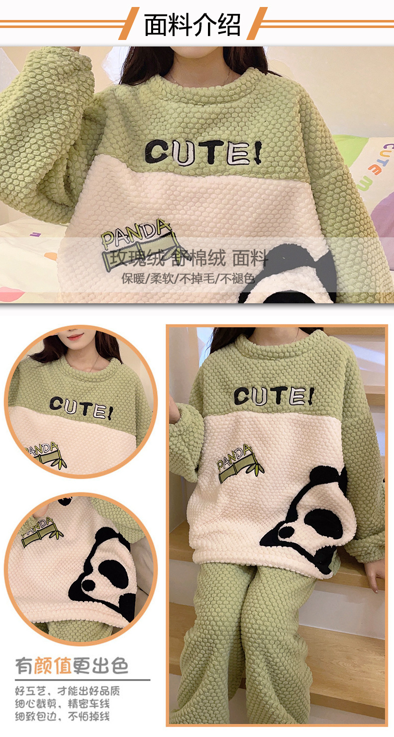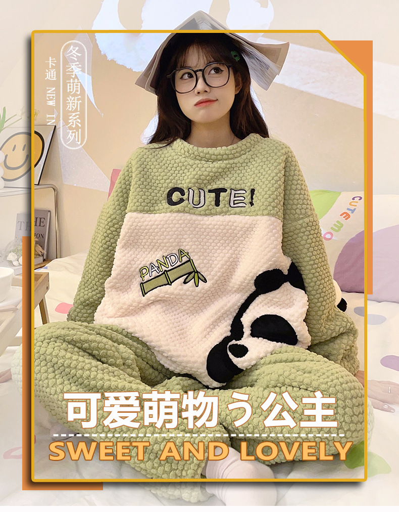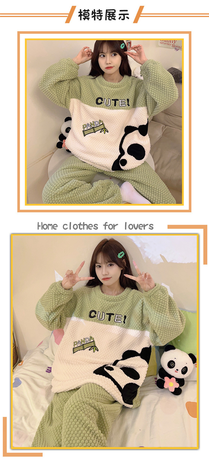 冬季新款可爱熊猫卡通珊瑚绒睡衣女加厚保暖法兰绒家居服套装