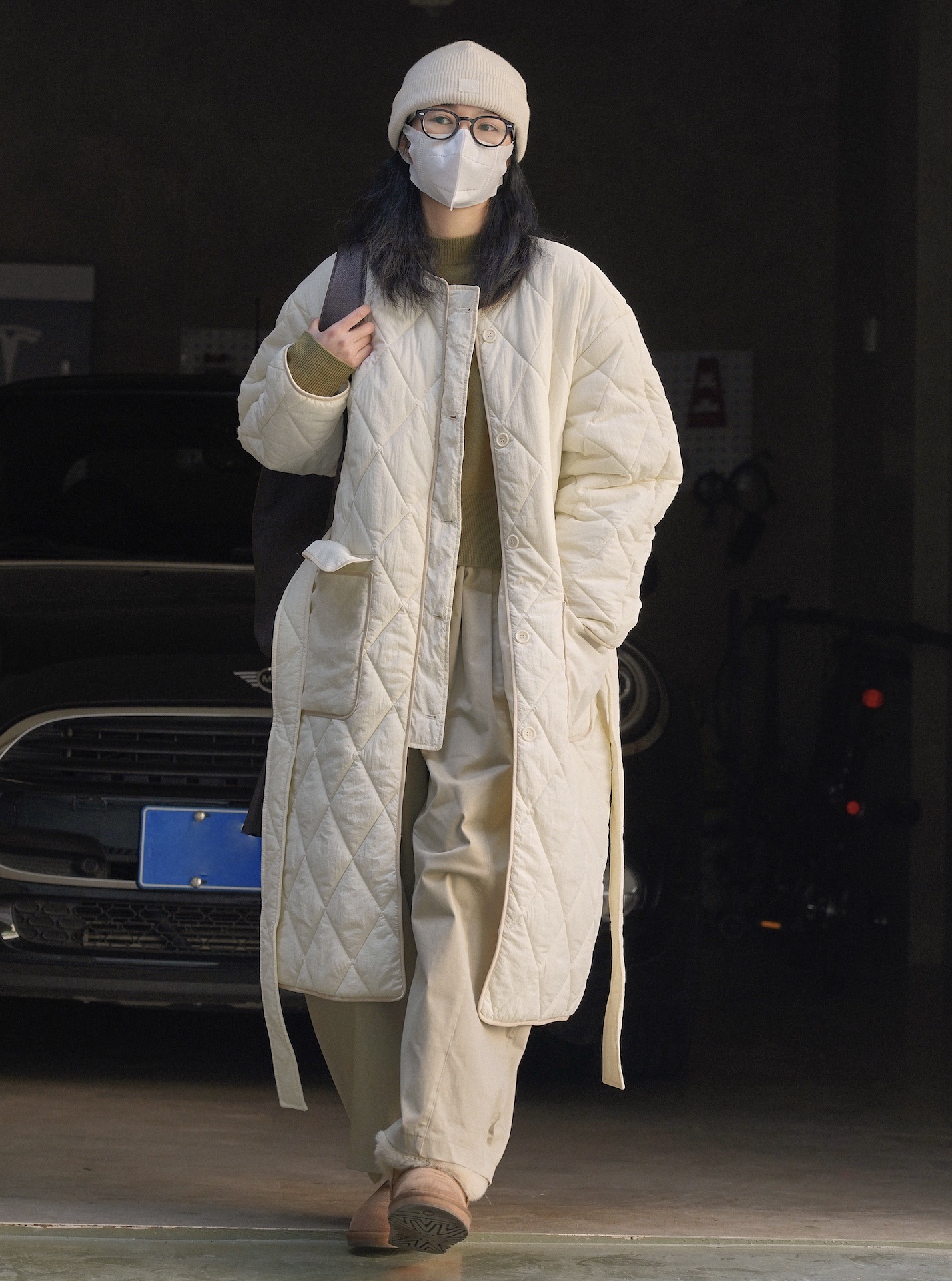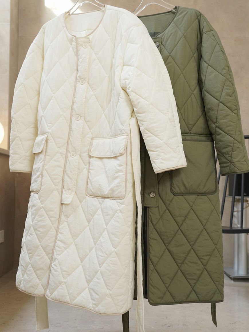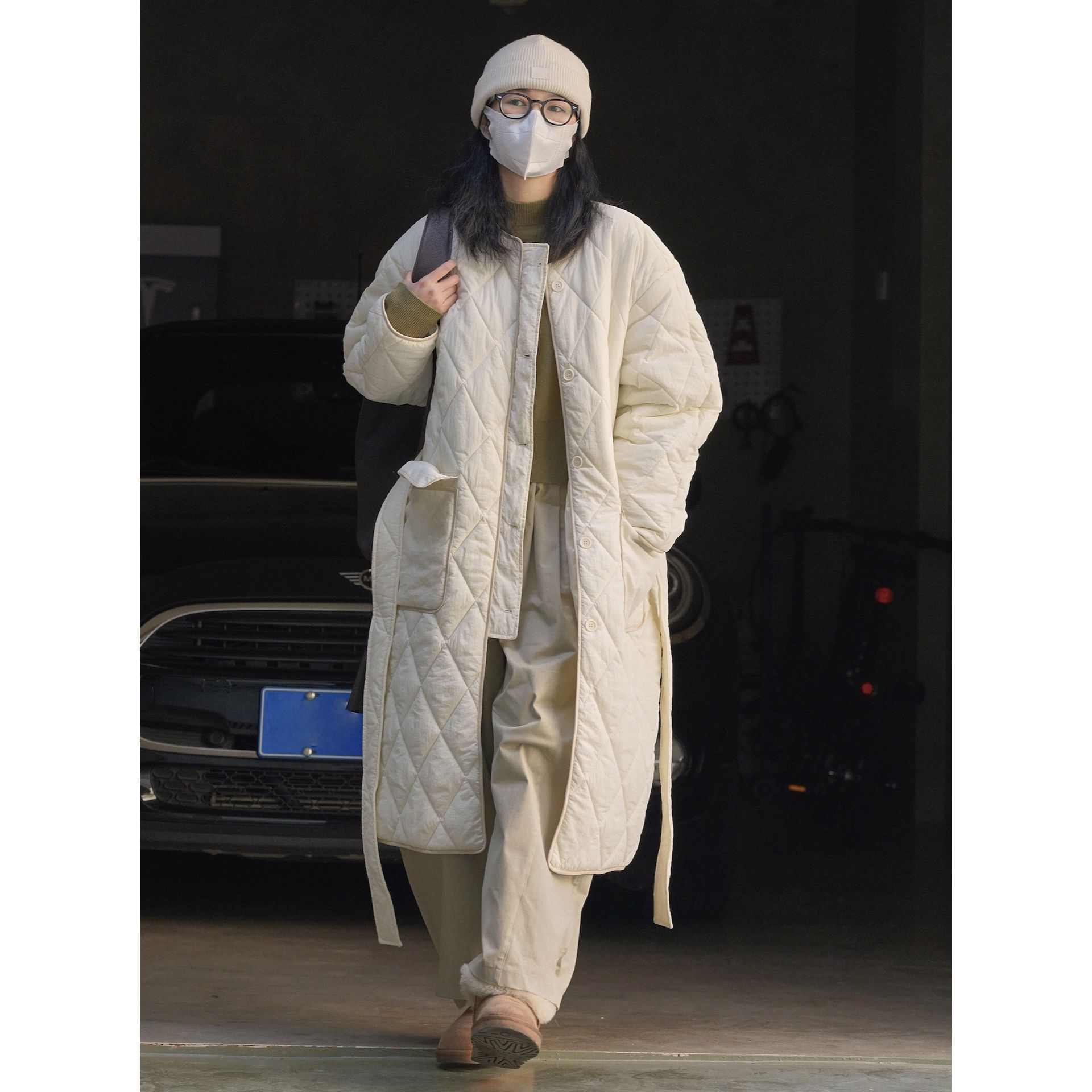 卢浮冬季新款日系复古街头圆领菱格棉服宽松廓形保暖长款外套女厚