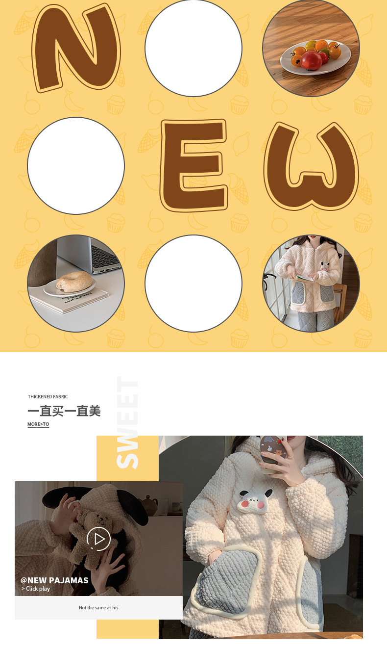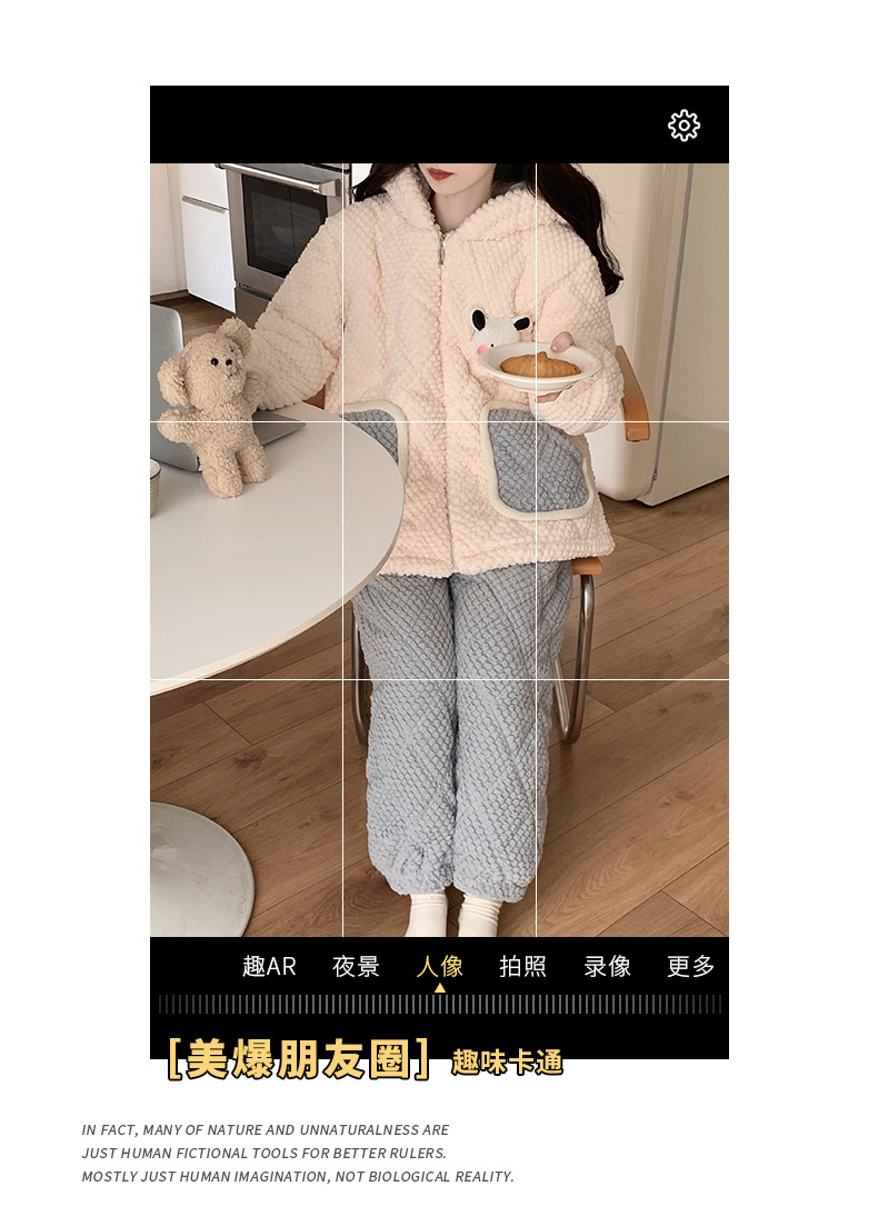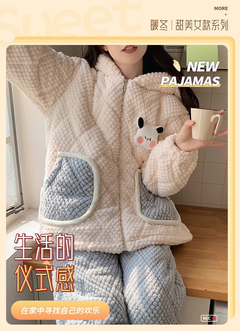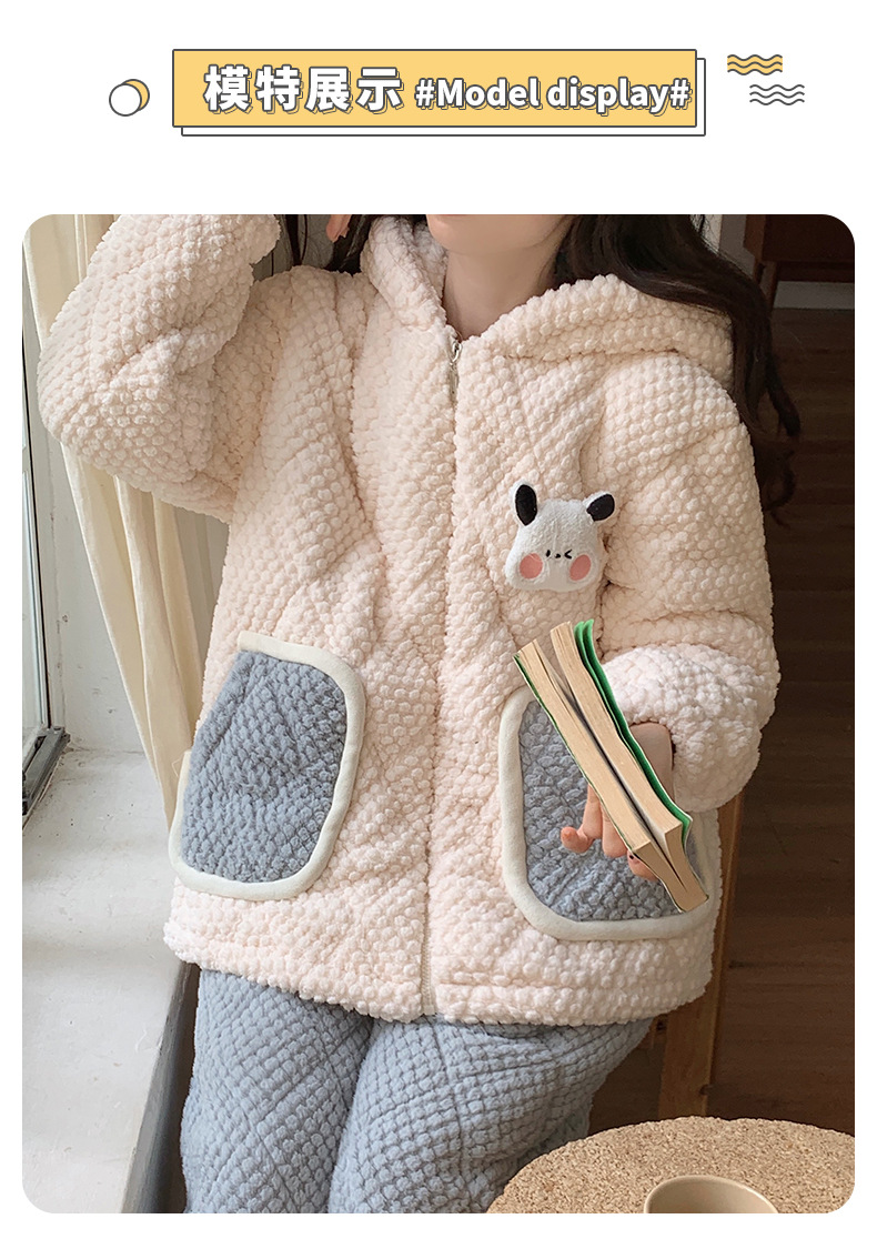 珊瑚绒三层夹棉睡衣女秋冬季加厚加绒新款卡通少女连帽家居服套装
