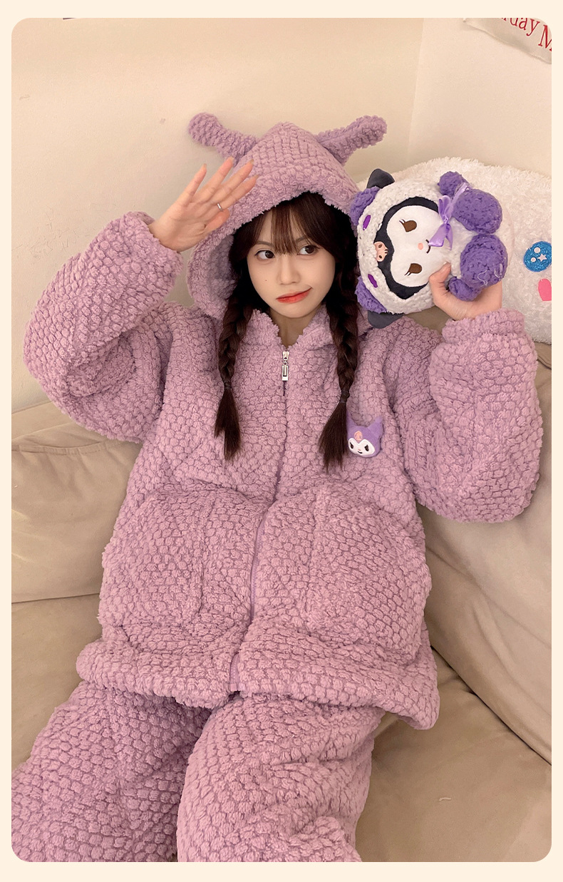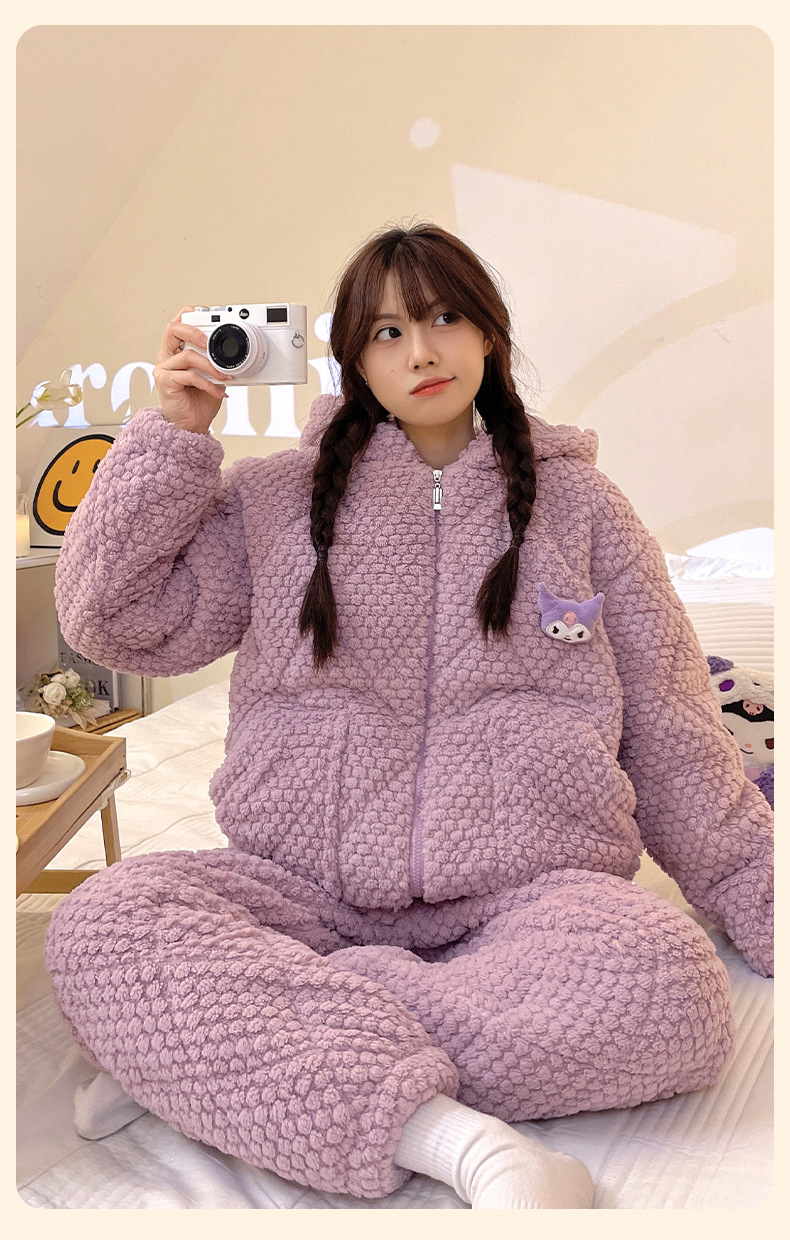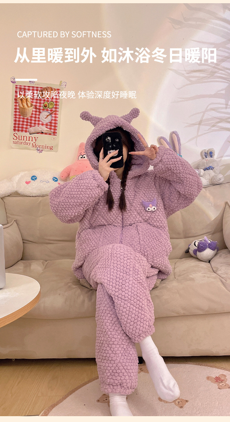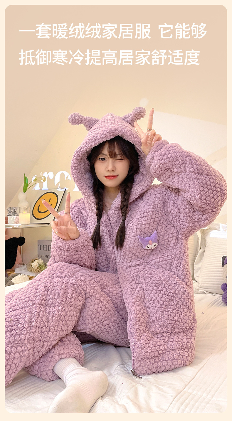 2023年冬季珊瑚绒三层夹棉可爱卡通保暖睡衣女士连帽家居服两件套