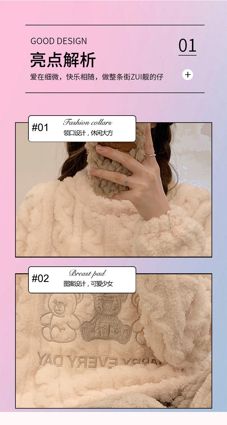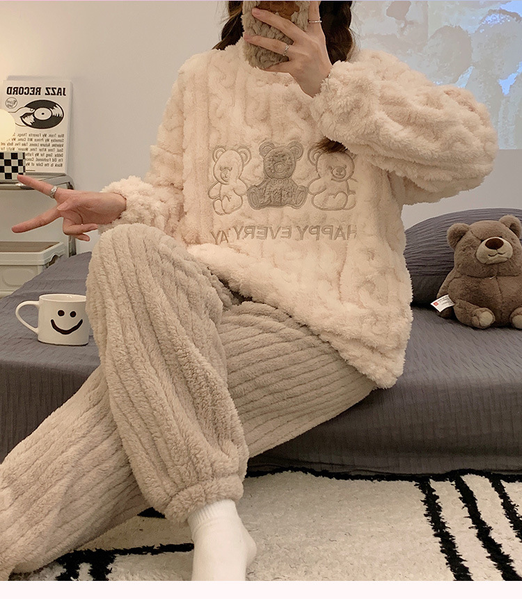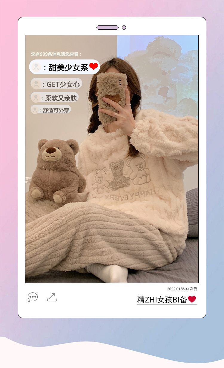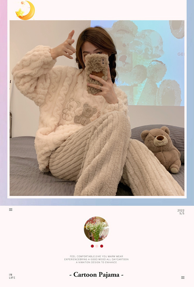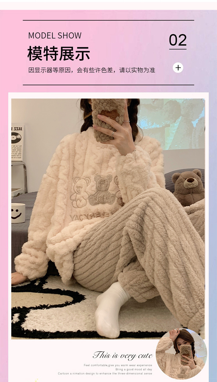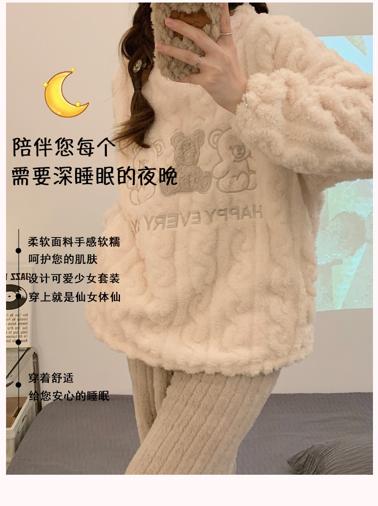 2023年睡衣女新款法兰绒可爱提花加厚休闲珊瑚绒家居服套装可外穿