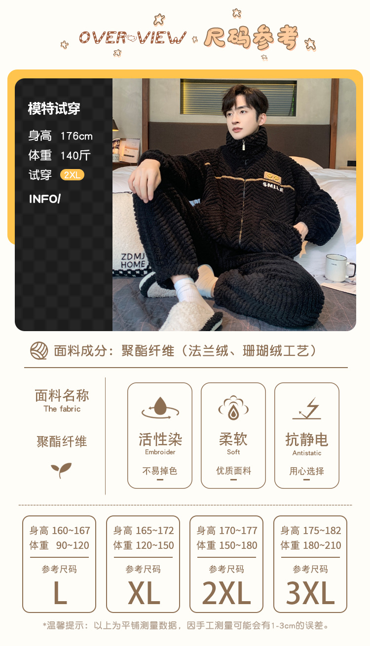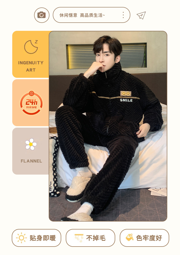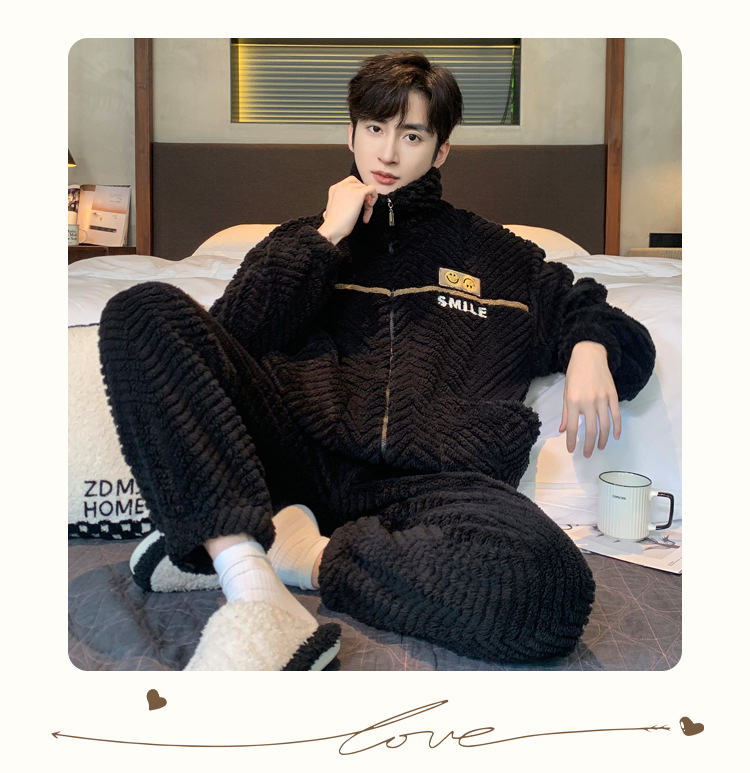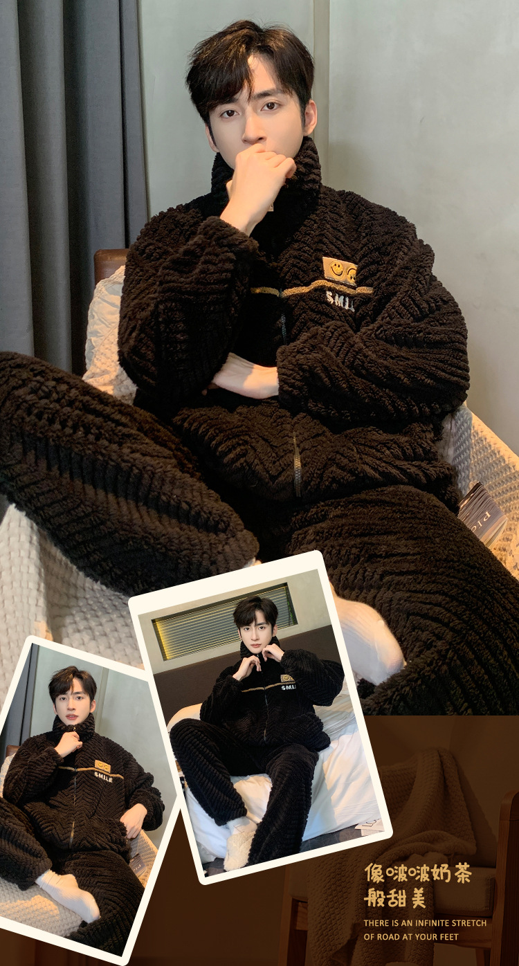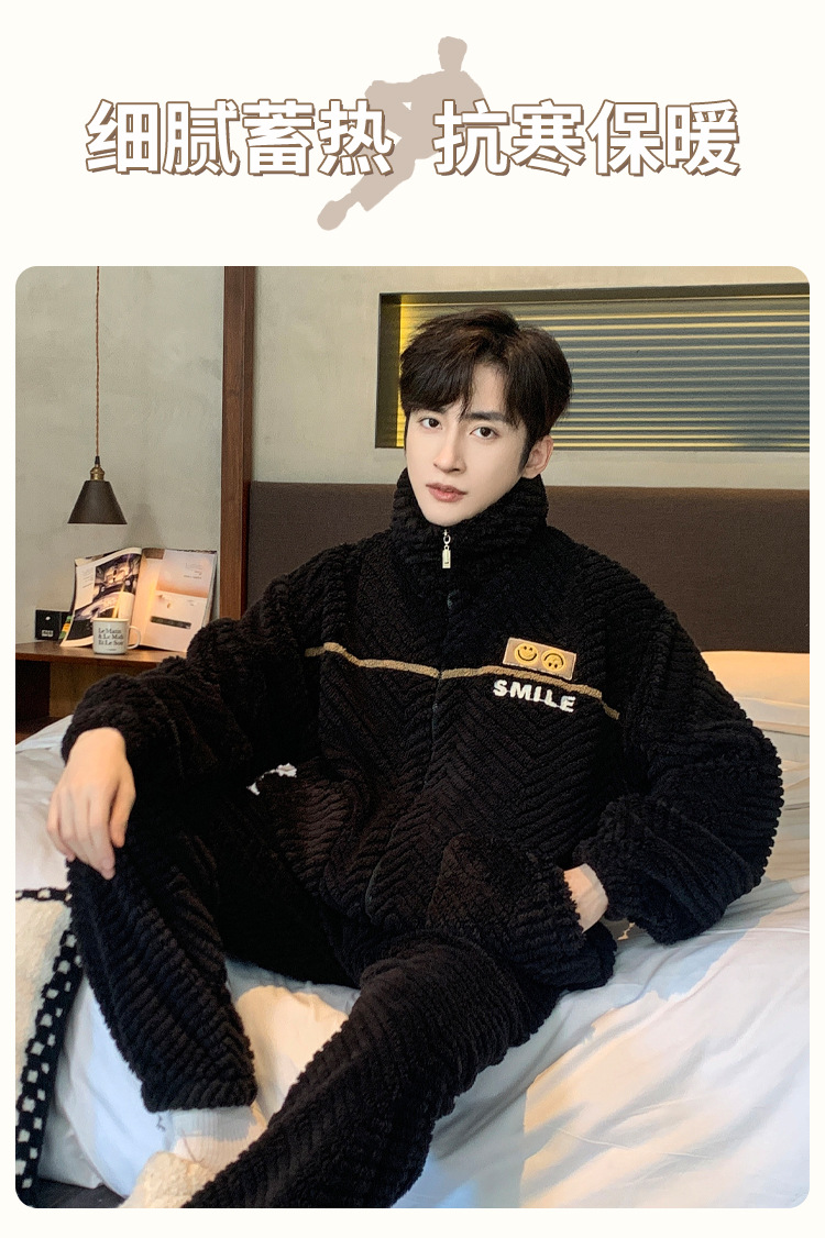 冬季法兰绒睡衣男感时尚保暖珊瑚绒提花家居服可外穿套装