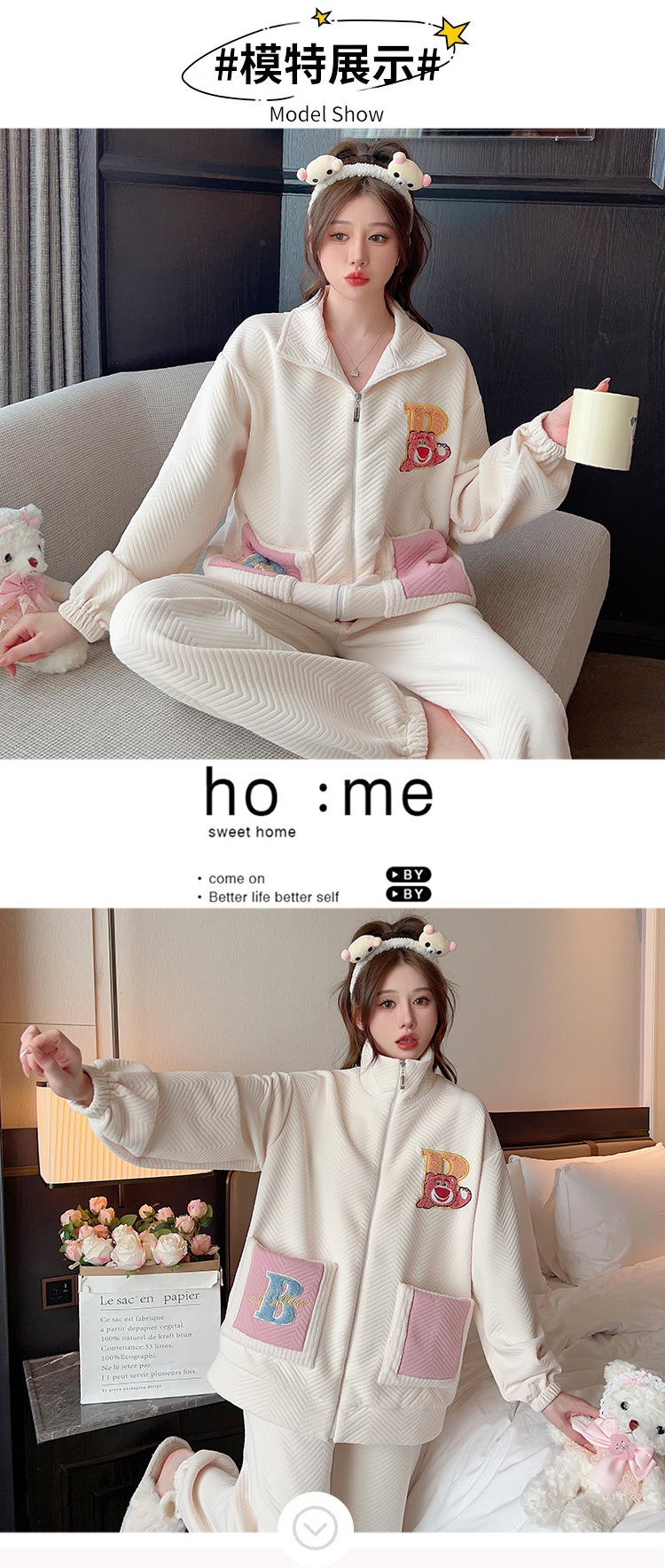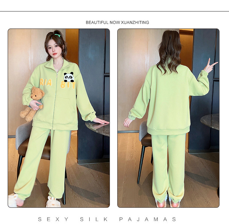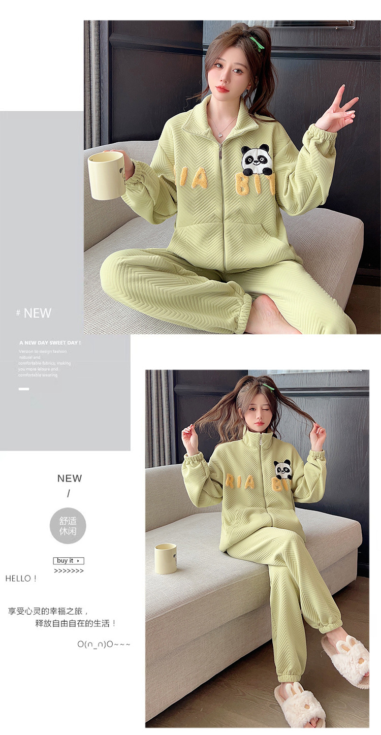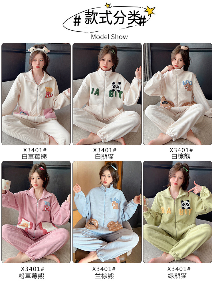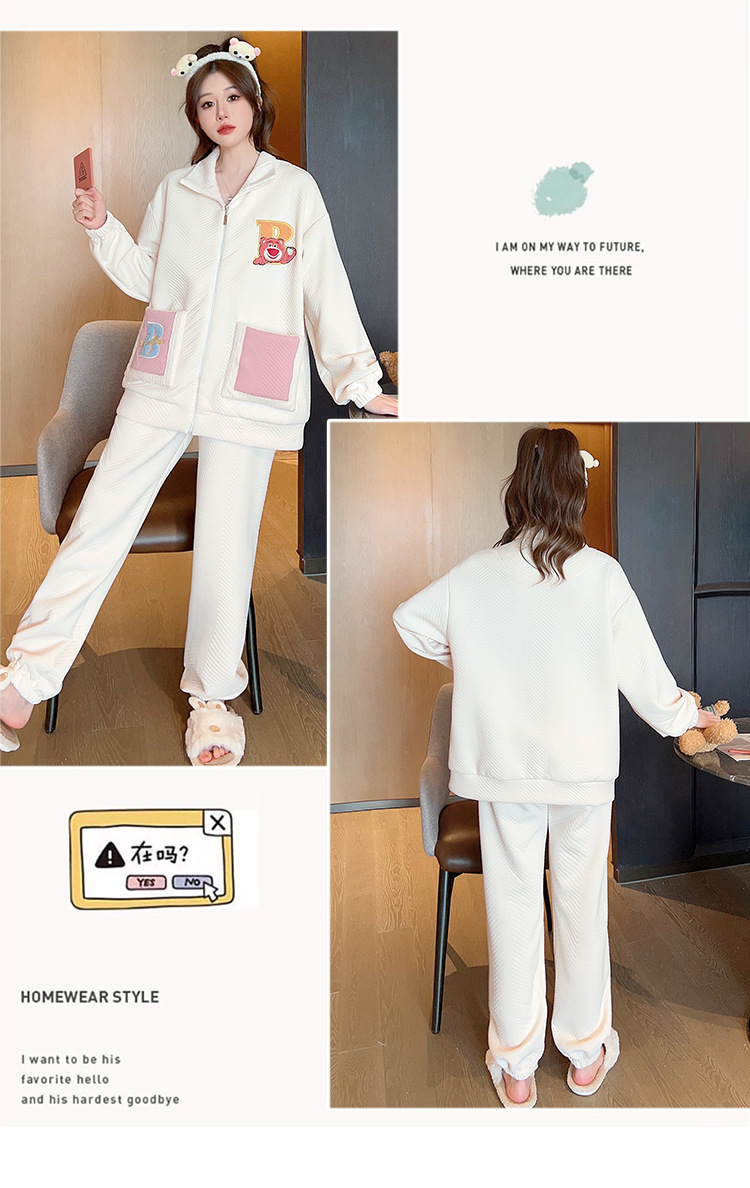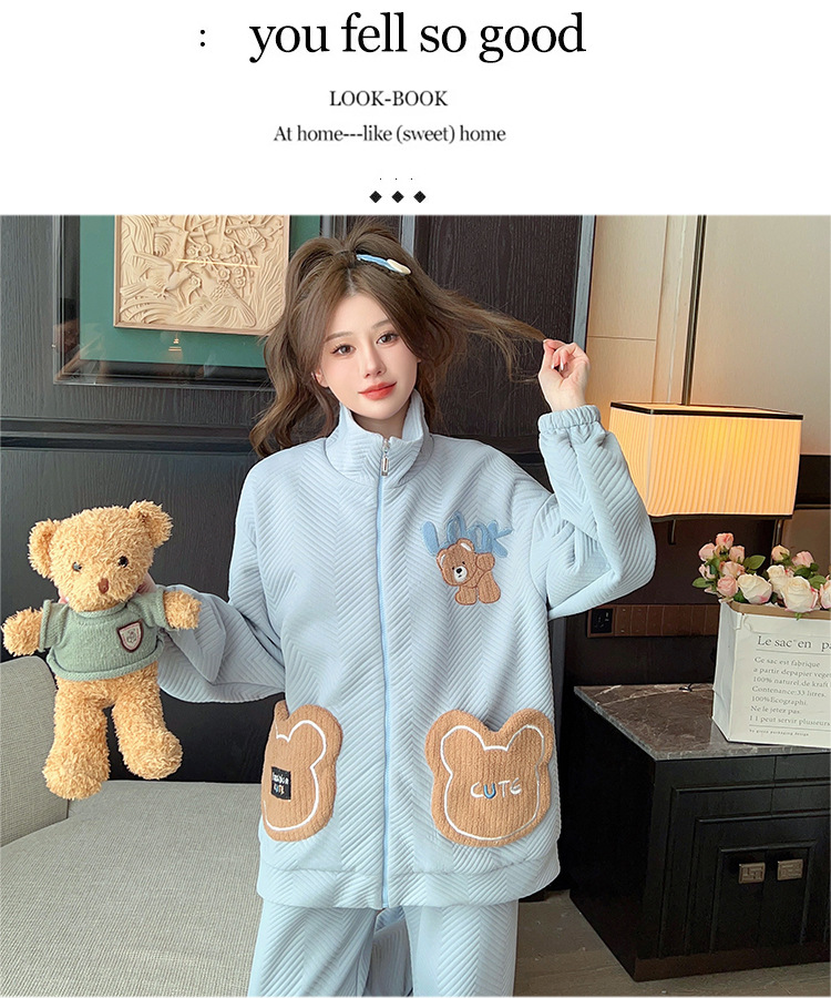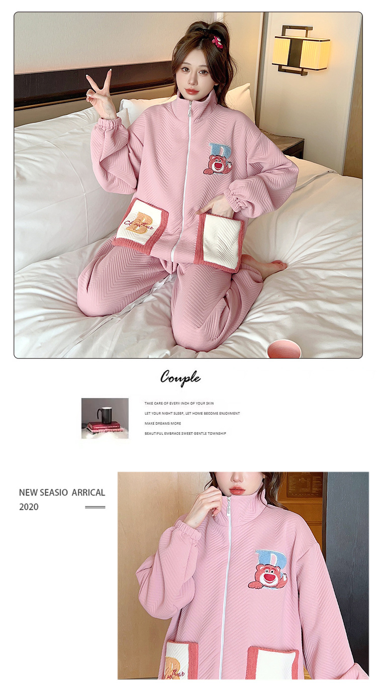 秋冬新款季夹层空气棉睡衣女卡通甜美风开衫拉链家居服套装可外穿