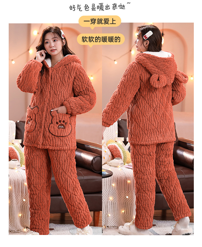 可爱卡通睡衣女冬季三层夹棉冬季新款加厚感保暖家居服两件套