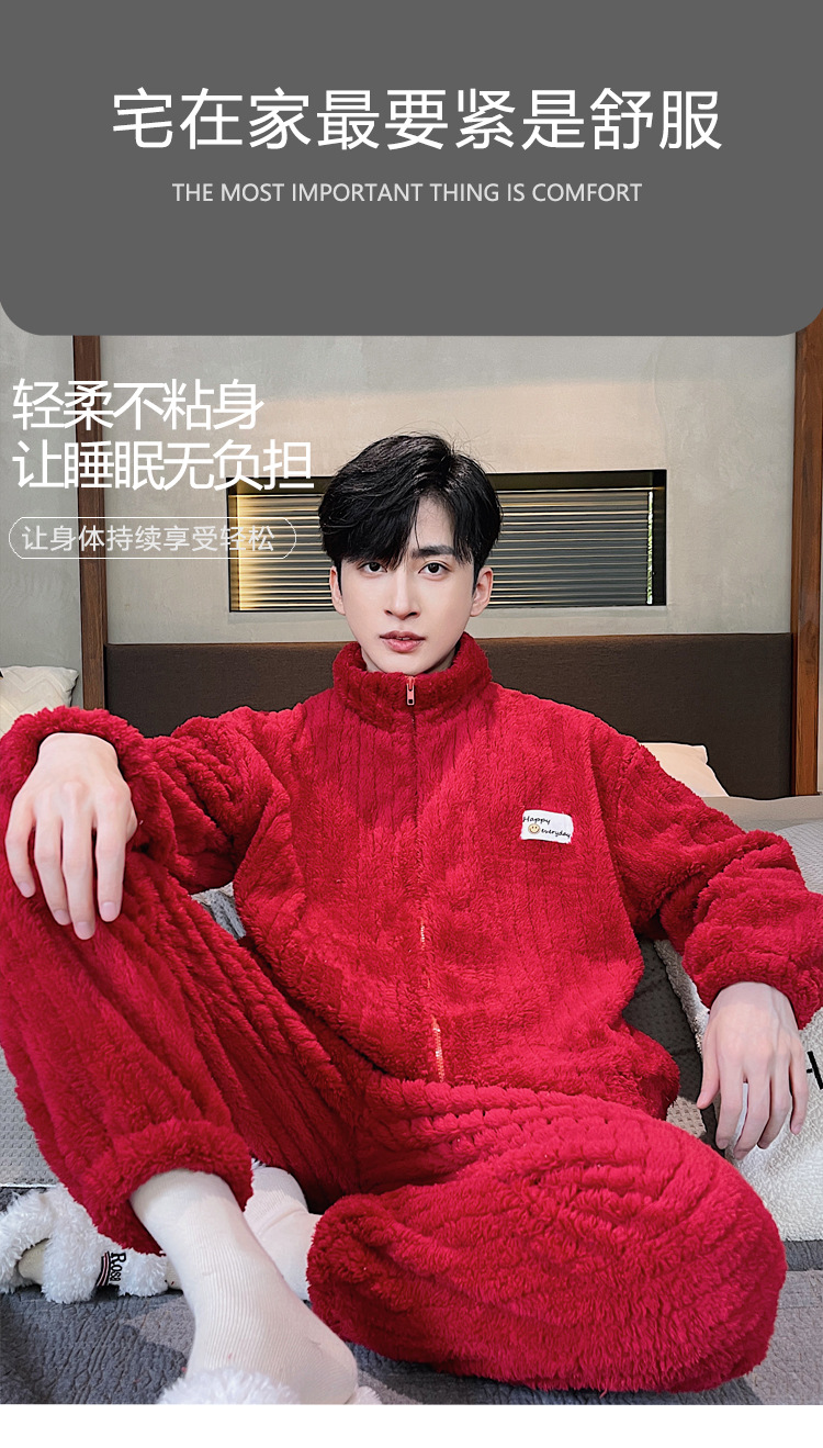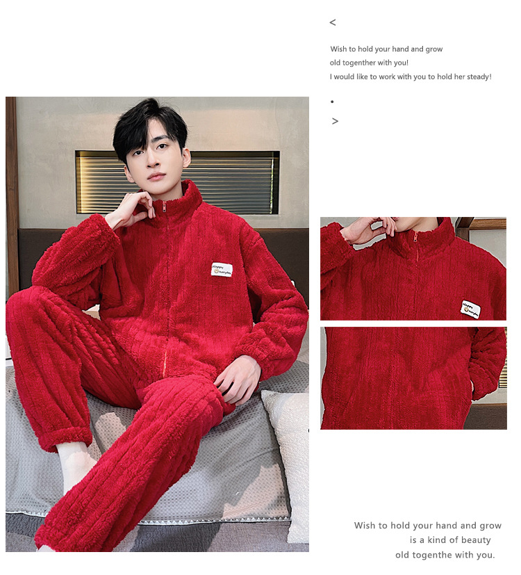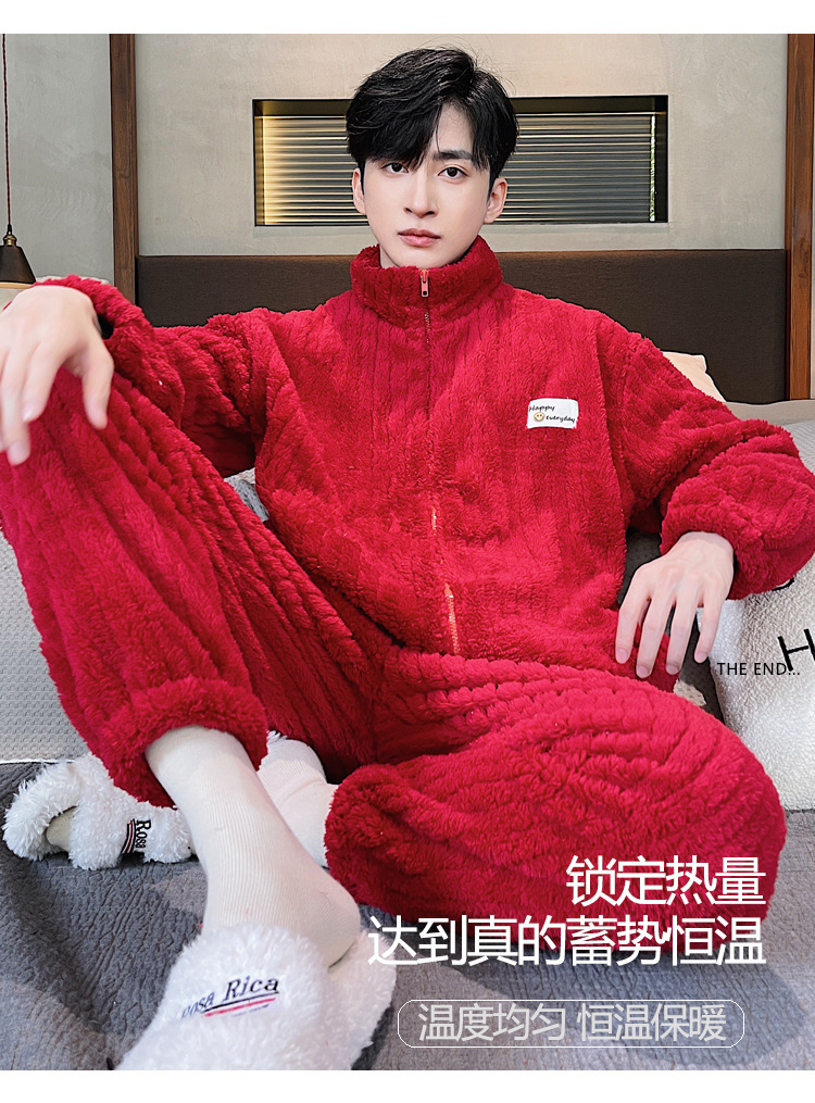 新款冬天睡衣青年男士法兰绒大红加厚珊瑚绒家居服可外穿套装