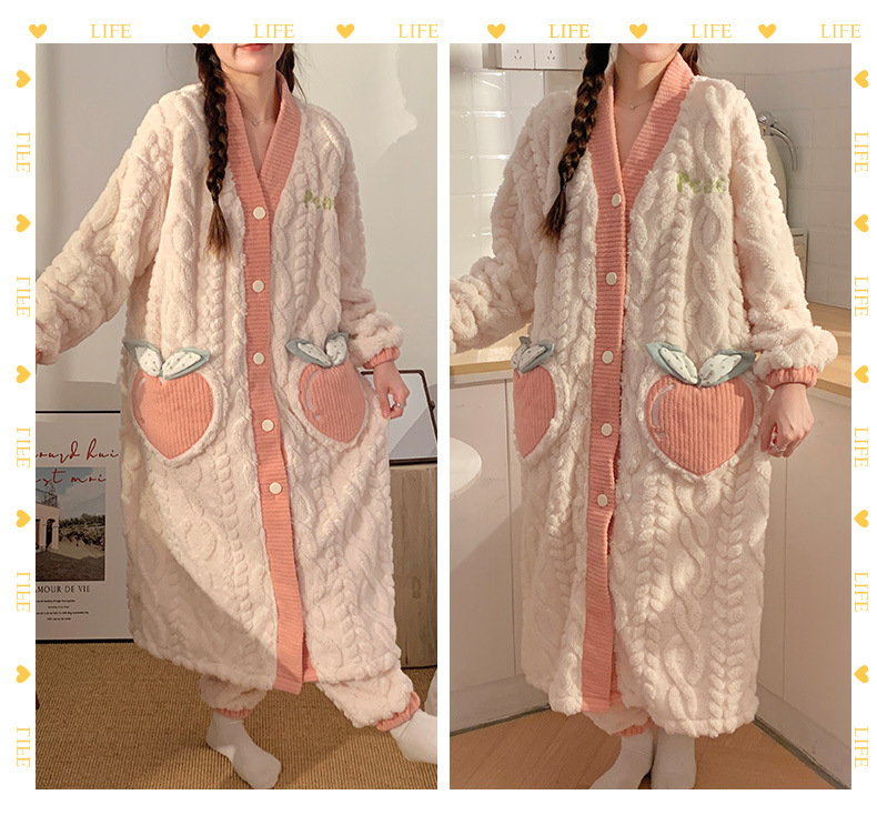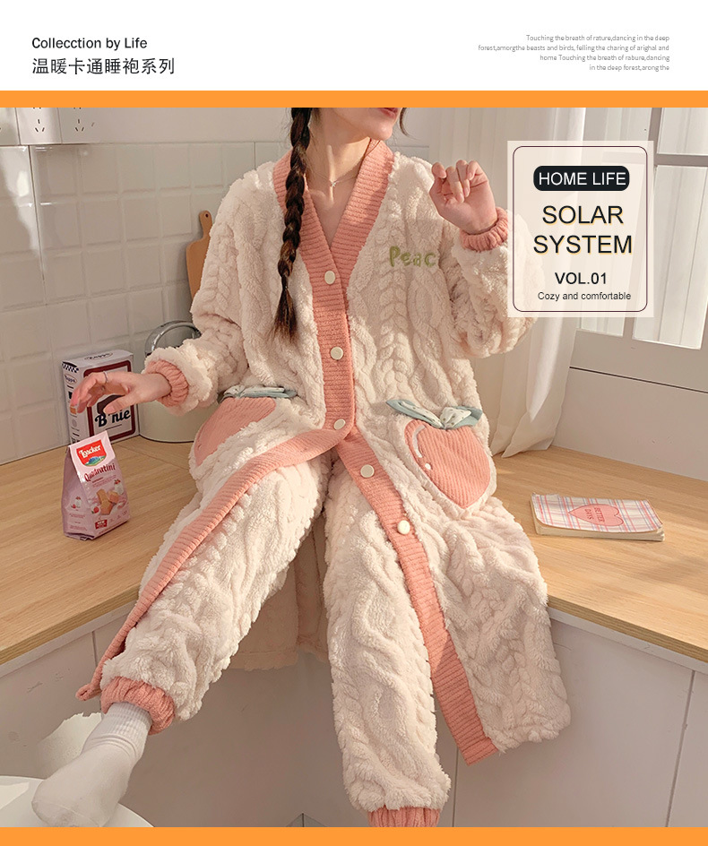 珊瑚绒睡袍女士冬季新款卡通清新中长款开衫提花保暖家居服两件套