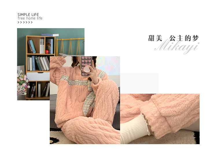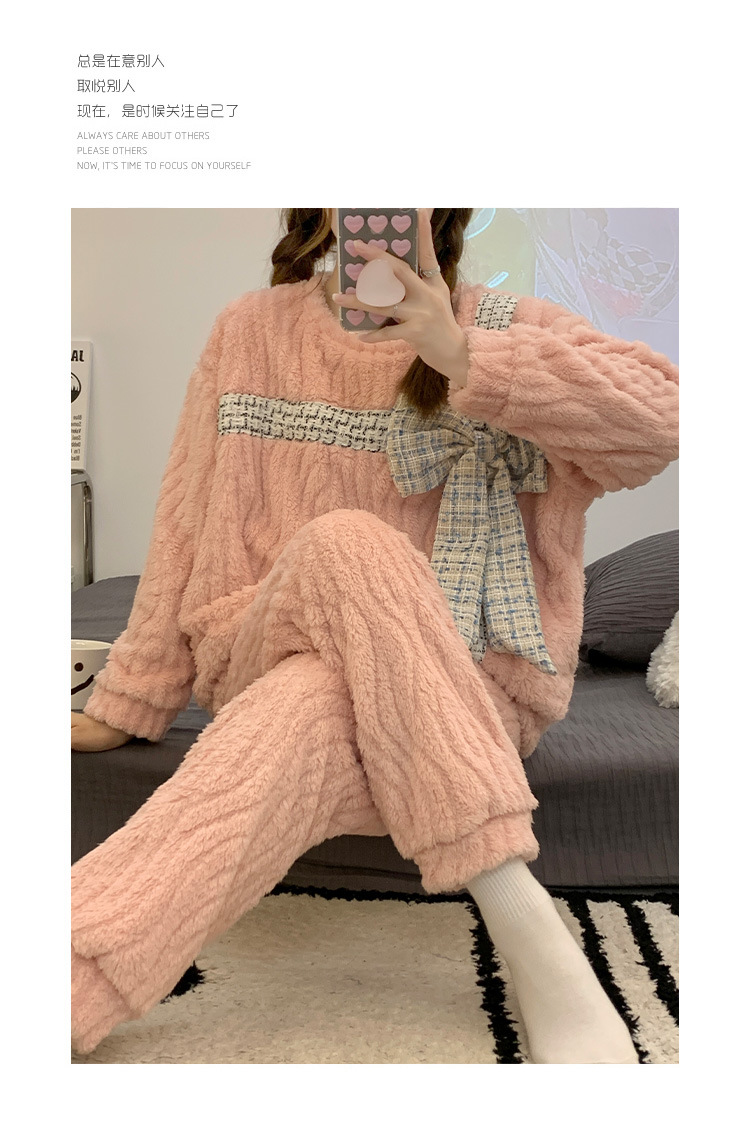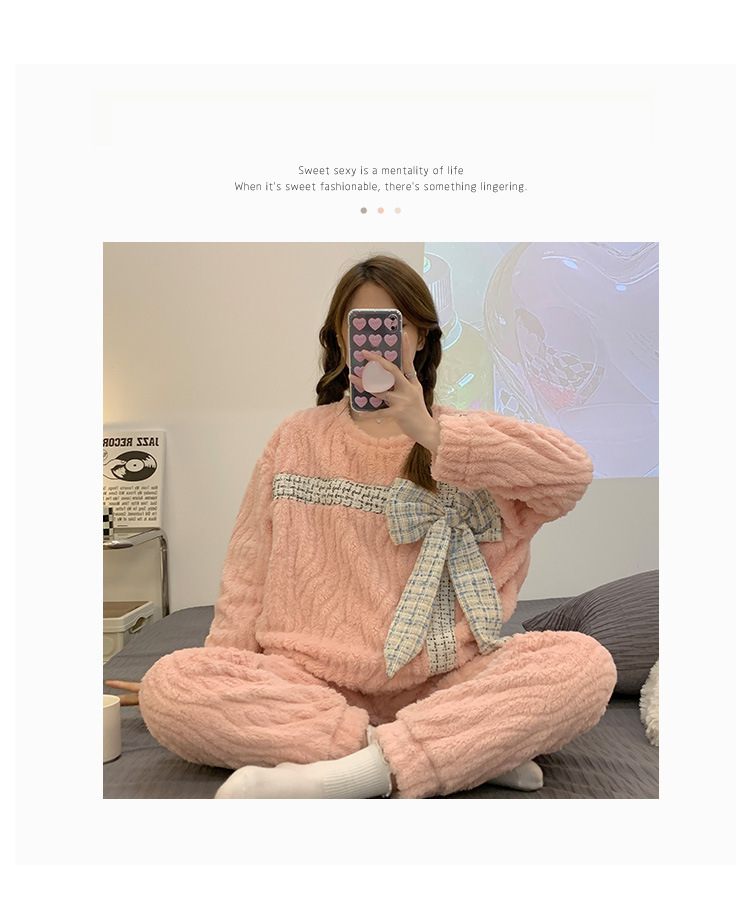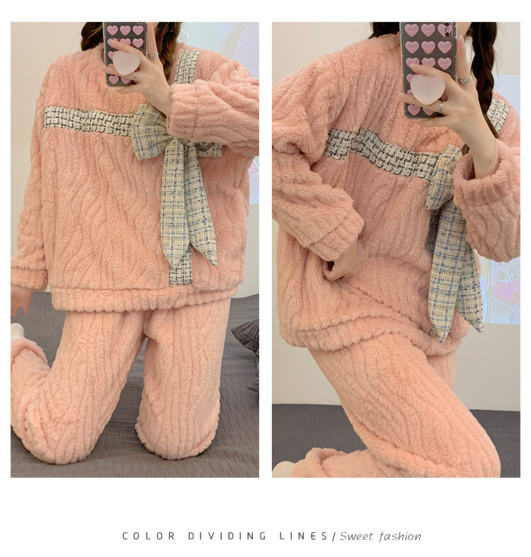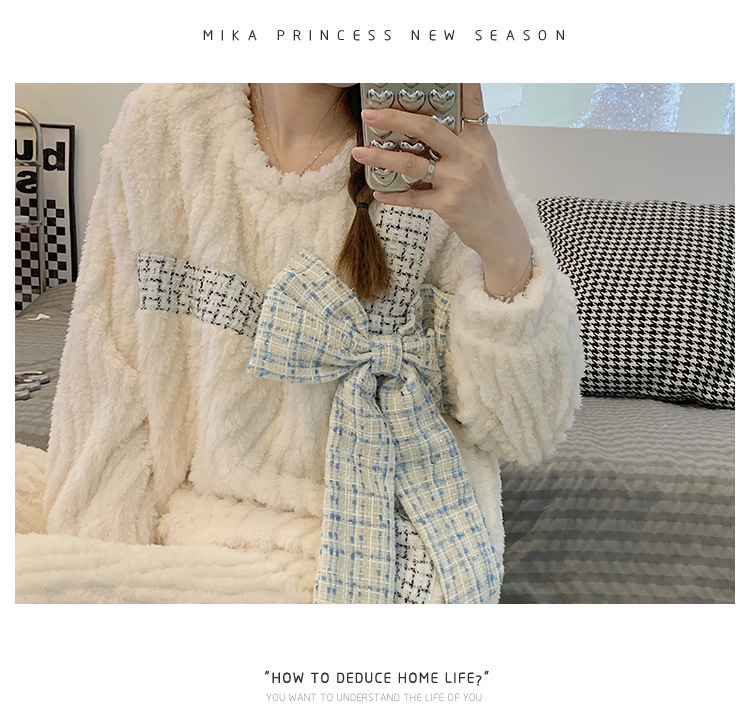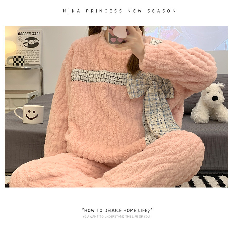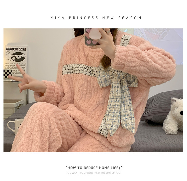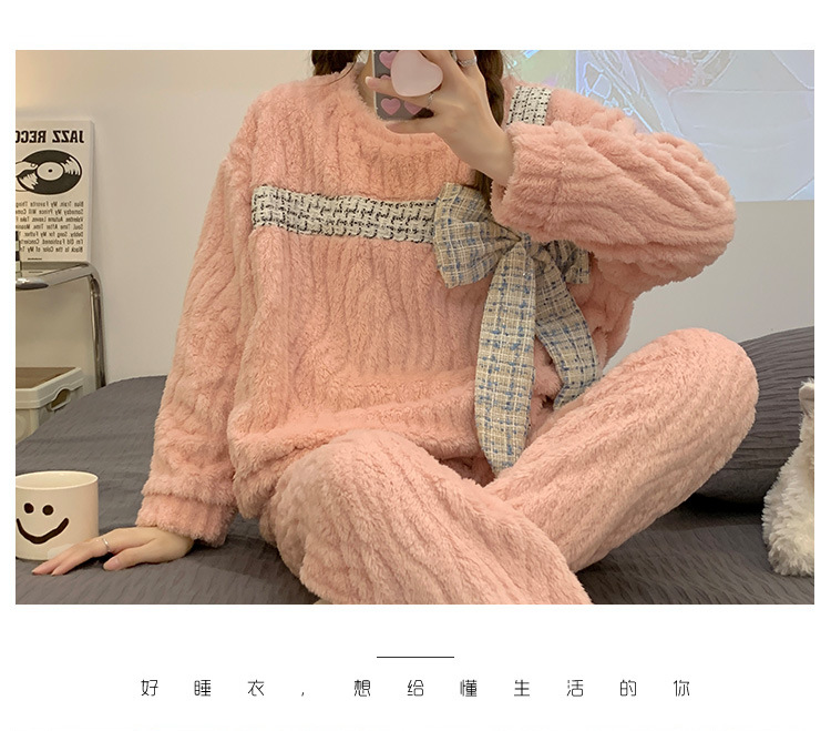 提花绒睡衣女冬季2023年新款可爱甜美大蝴蝶结加厚保暖家居服套装