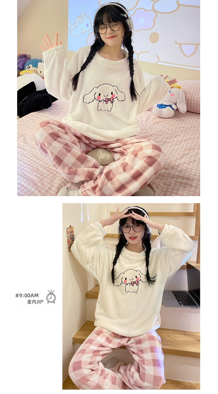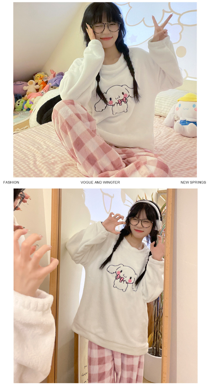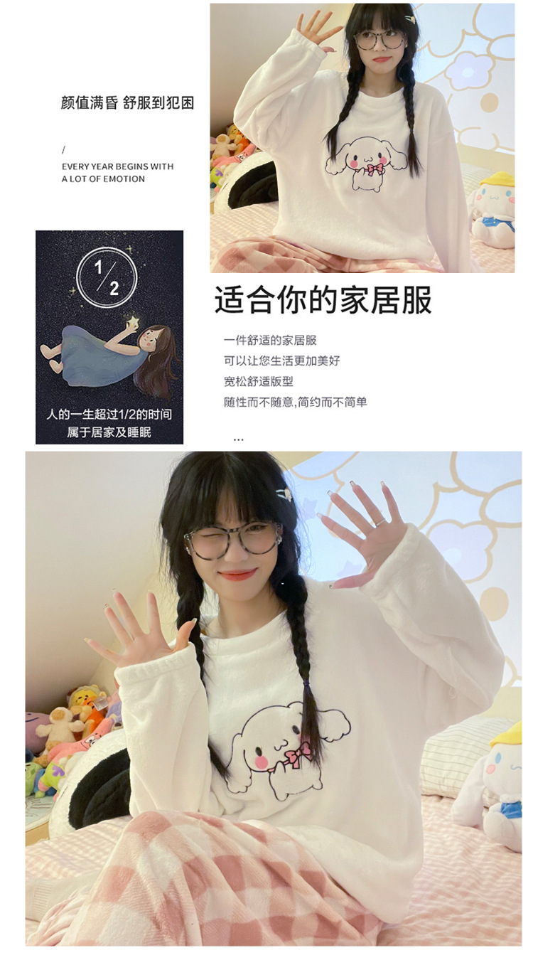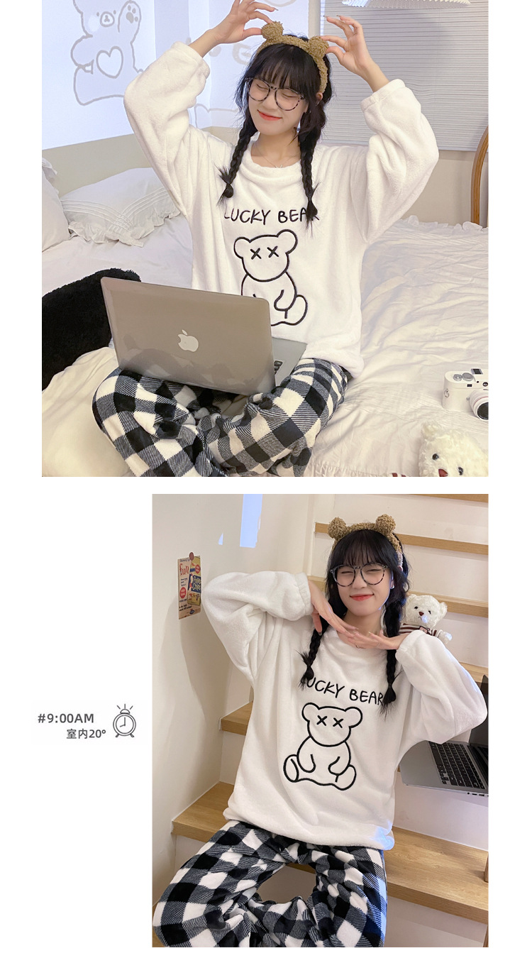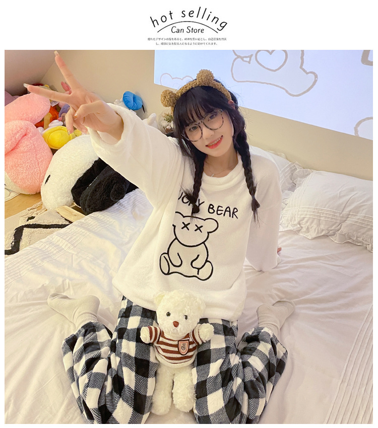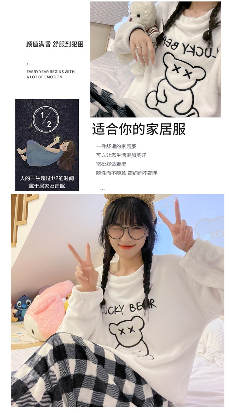 可爱甜美法兰绒睡衣女2023冬季新款少女风格子裤舒适家居服可外穿