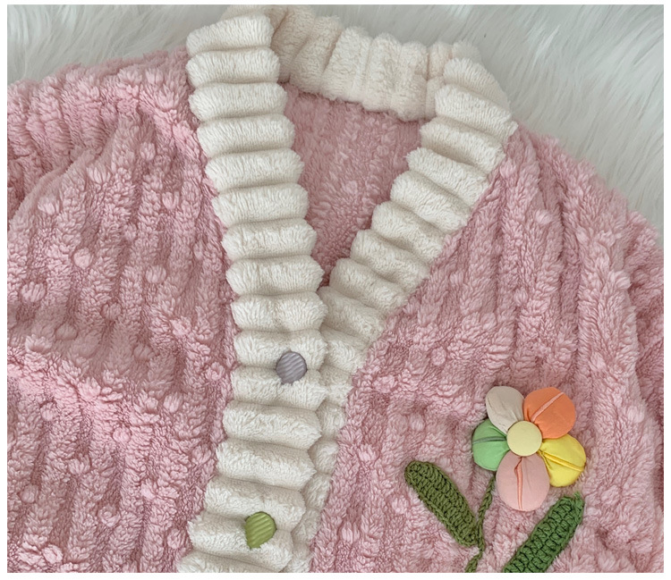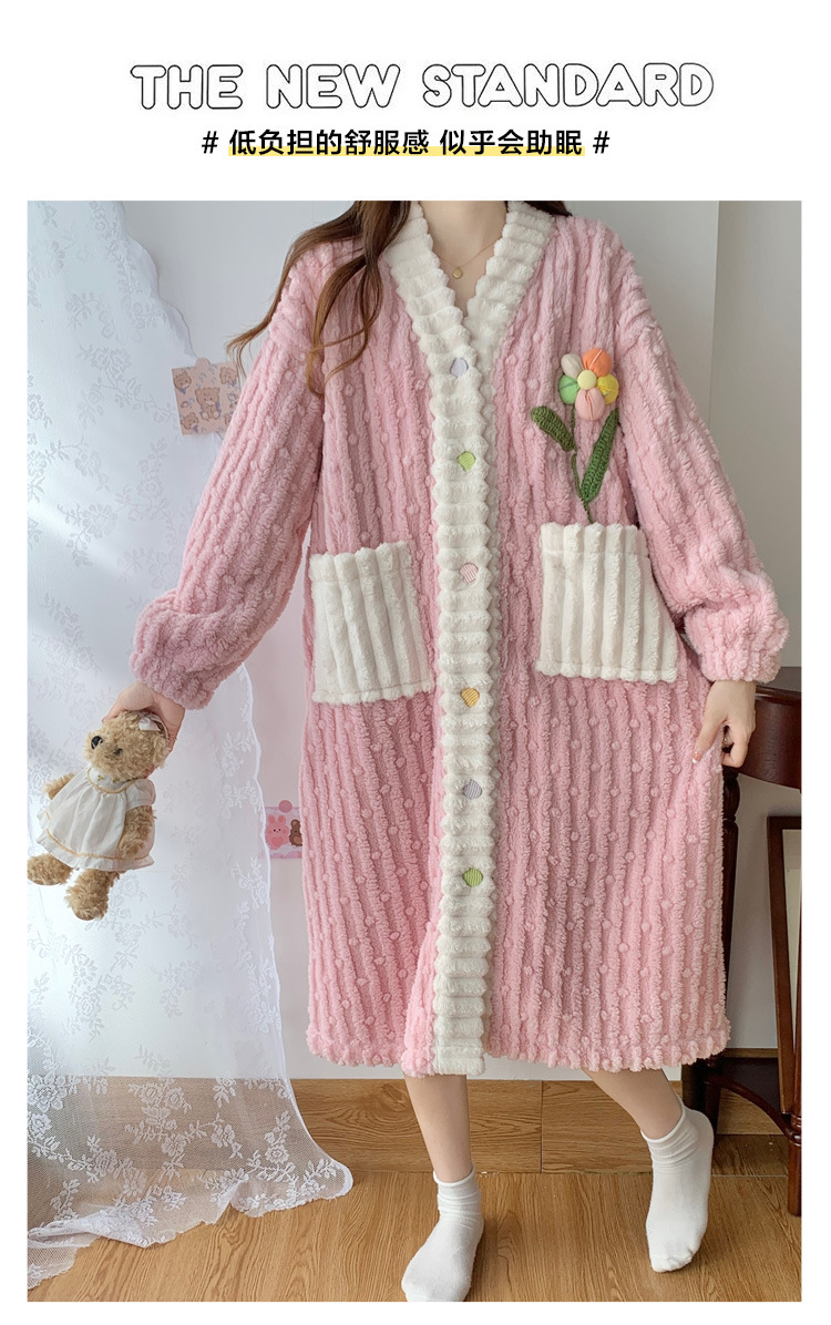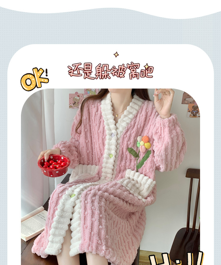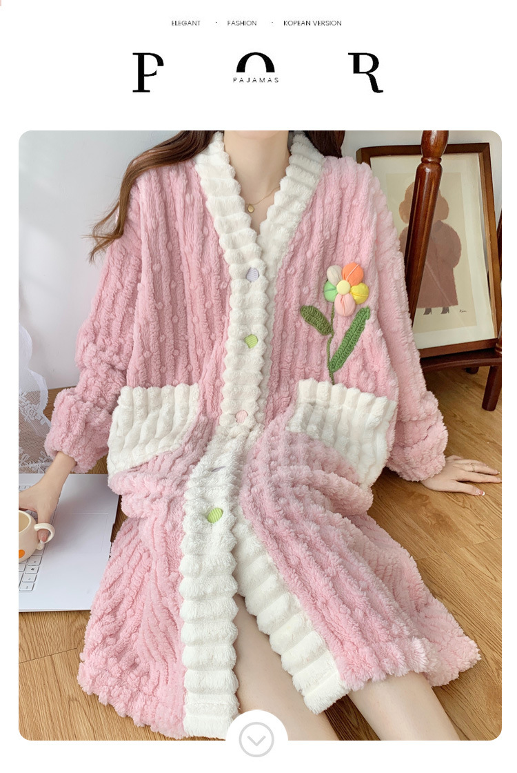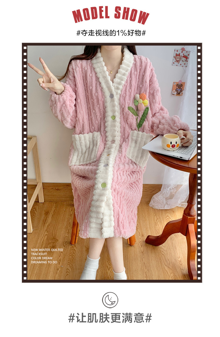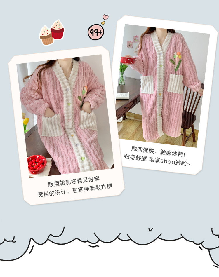 珊瑚绒睡袍女2023年冬季新款可爱甜美风提花绒舒适保暖开衫家居服