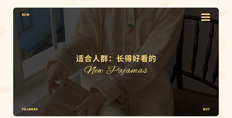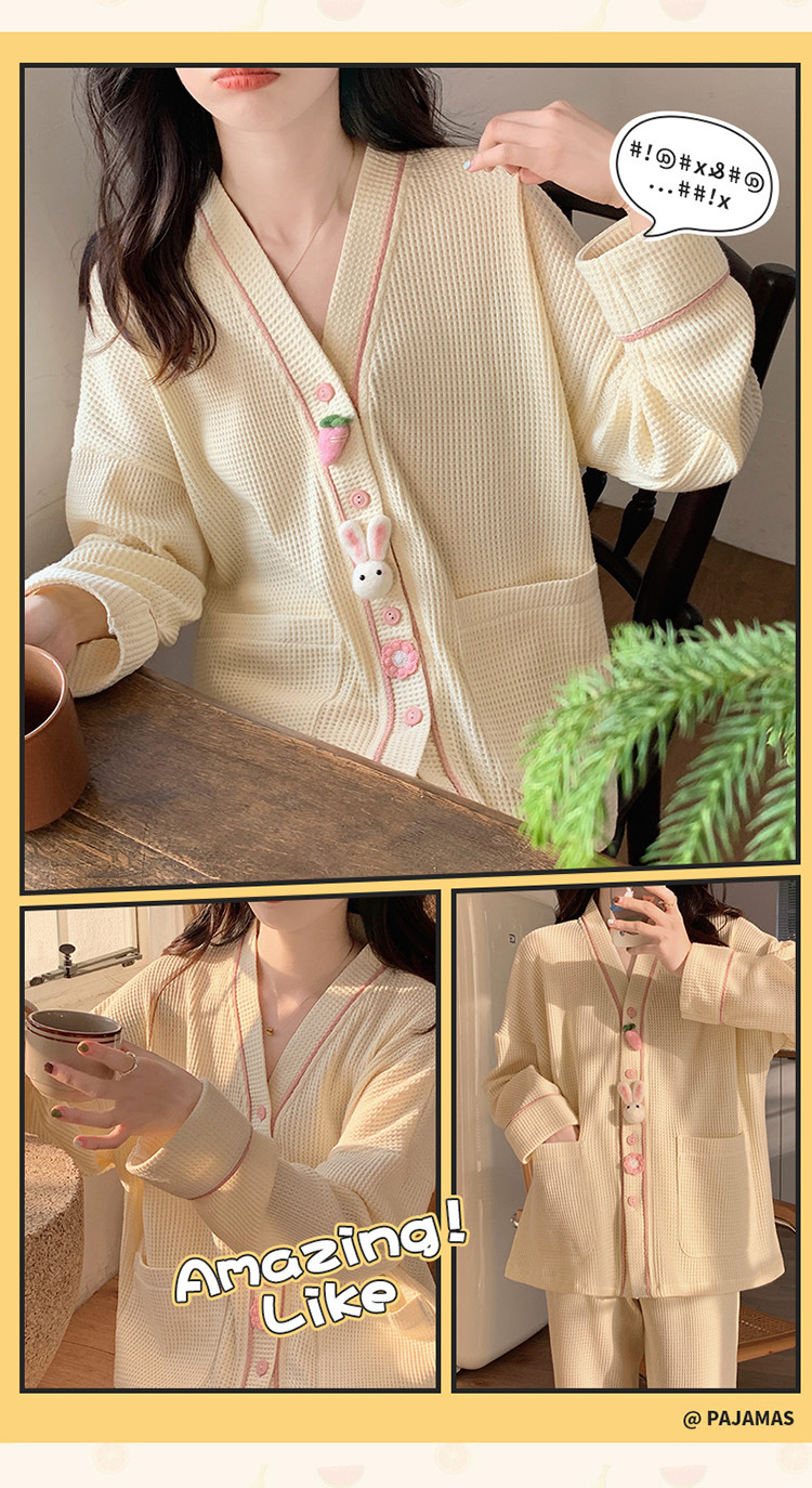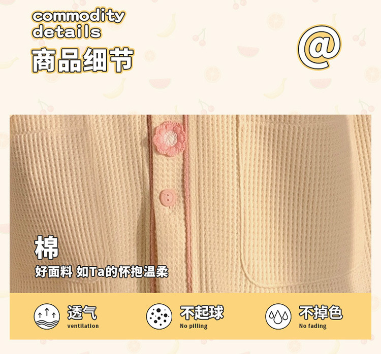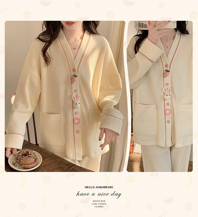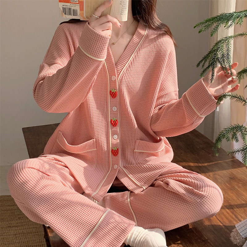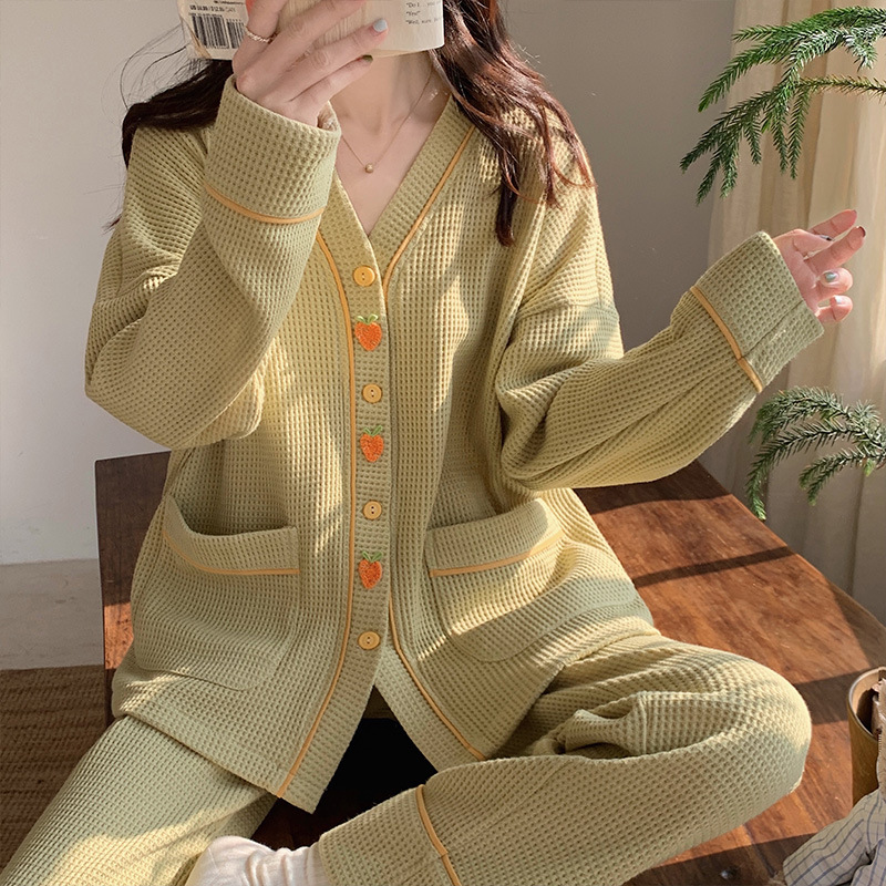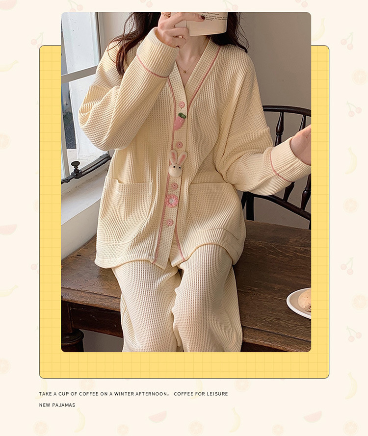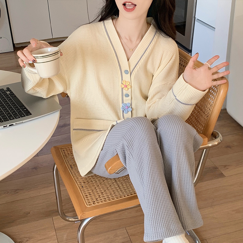 秋天可外穿睡衣女新款华夫格甜美可爱清新风两件套舒适开衫家居服