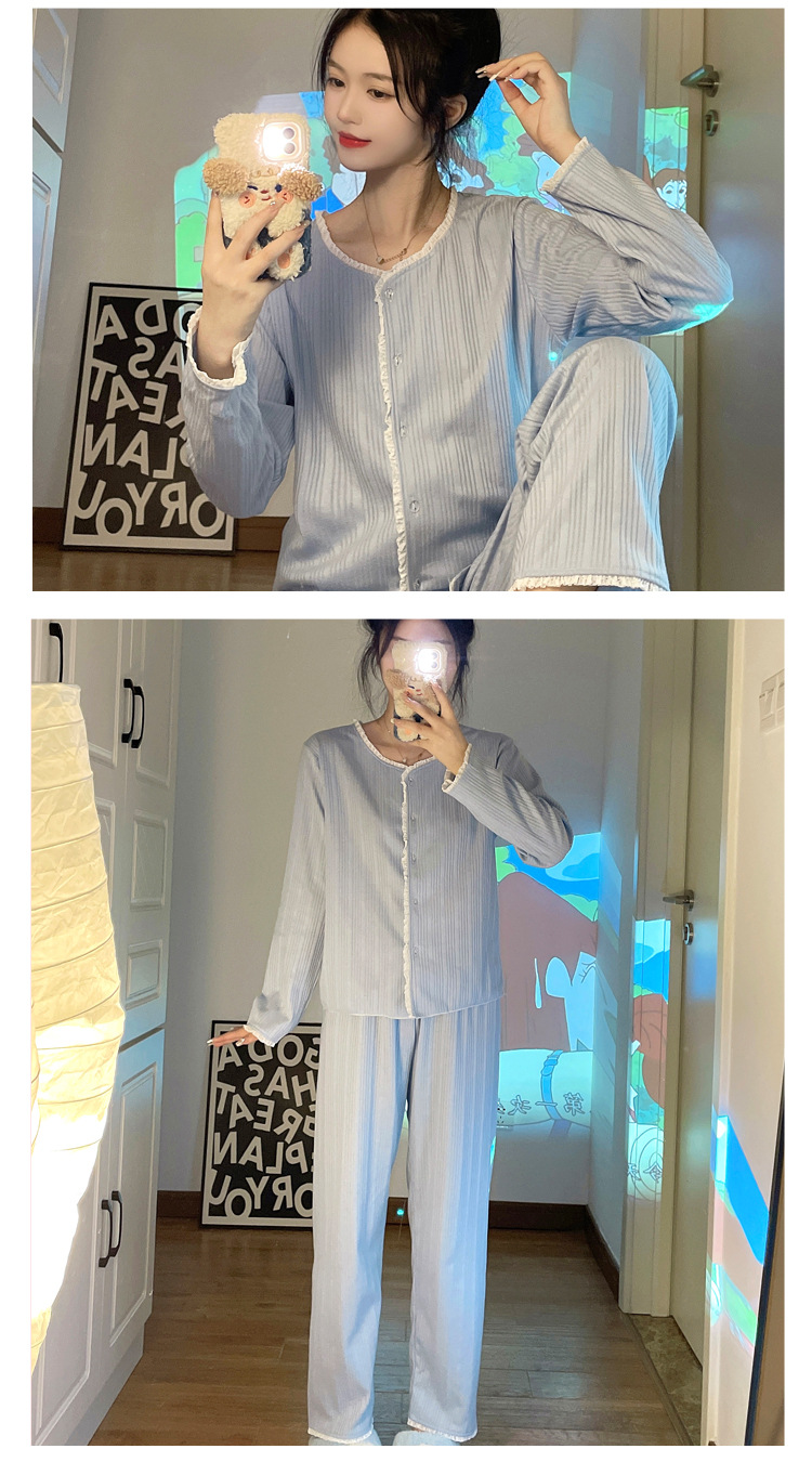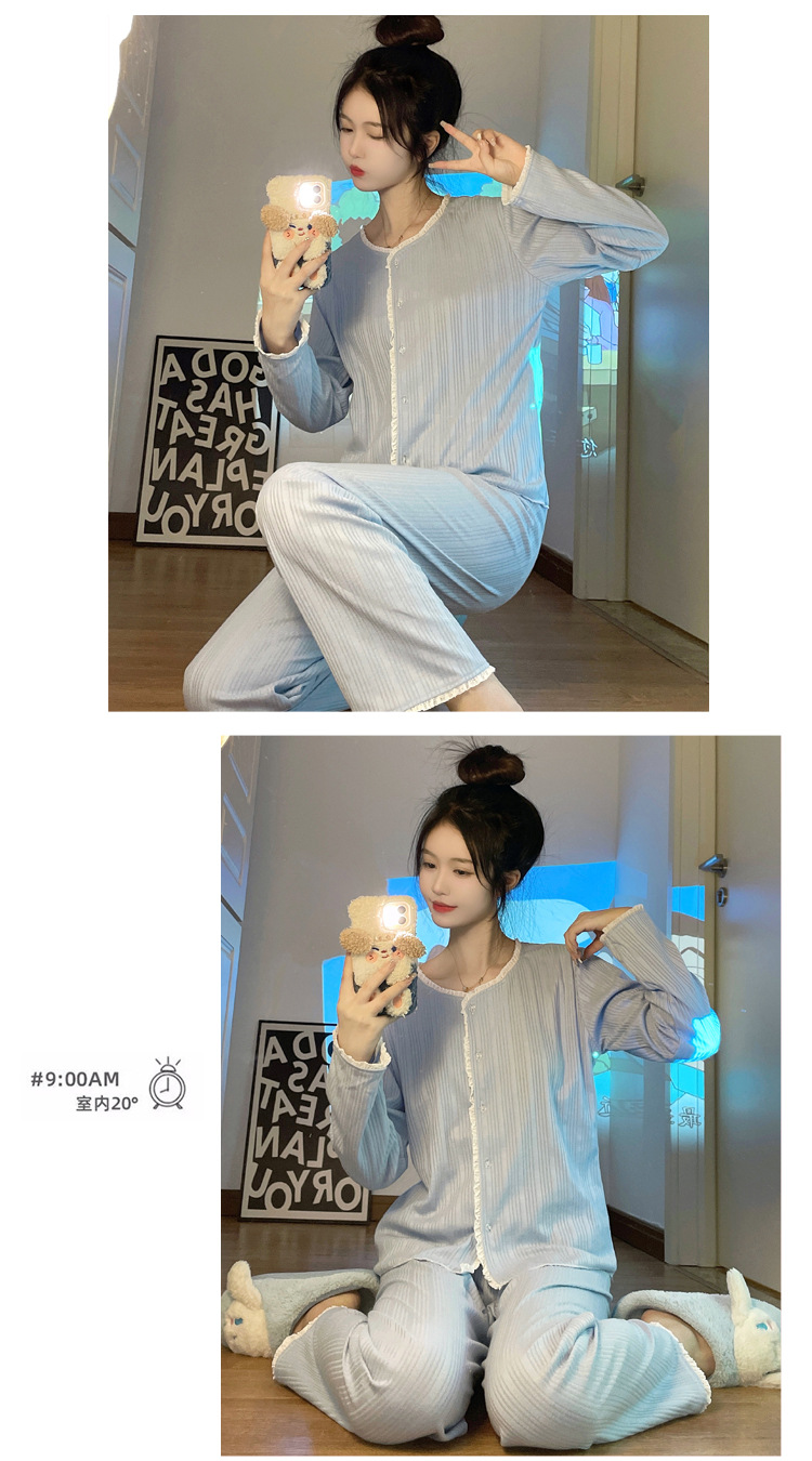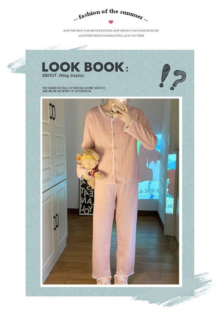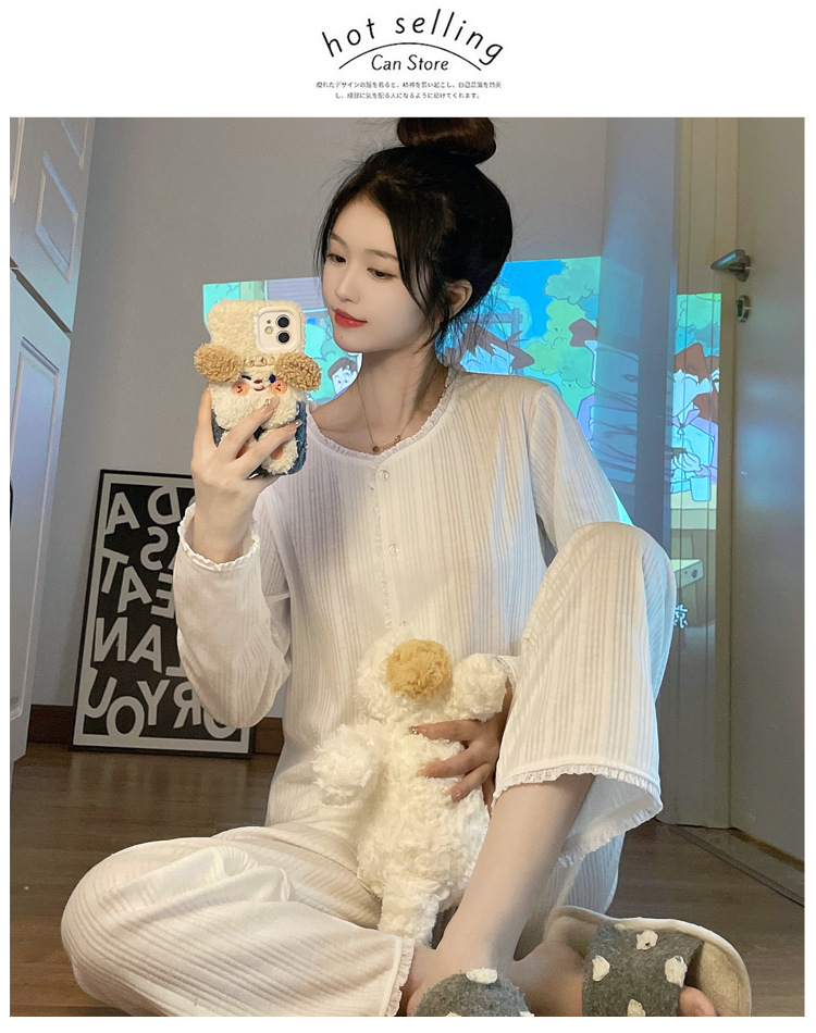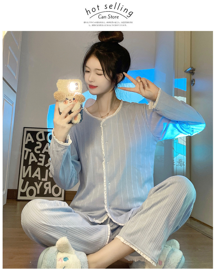 纯色睡衣女秋季新款可爱休闲小清新长袖长裤套装舒适家居服可外穿