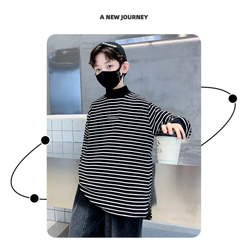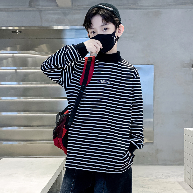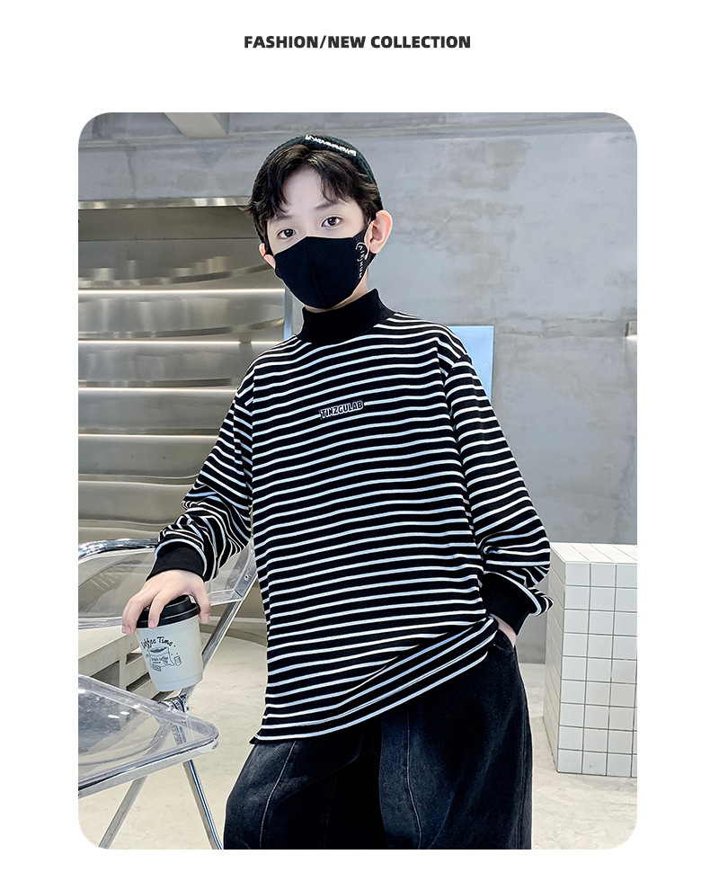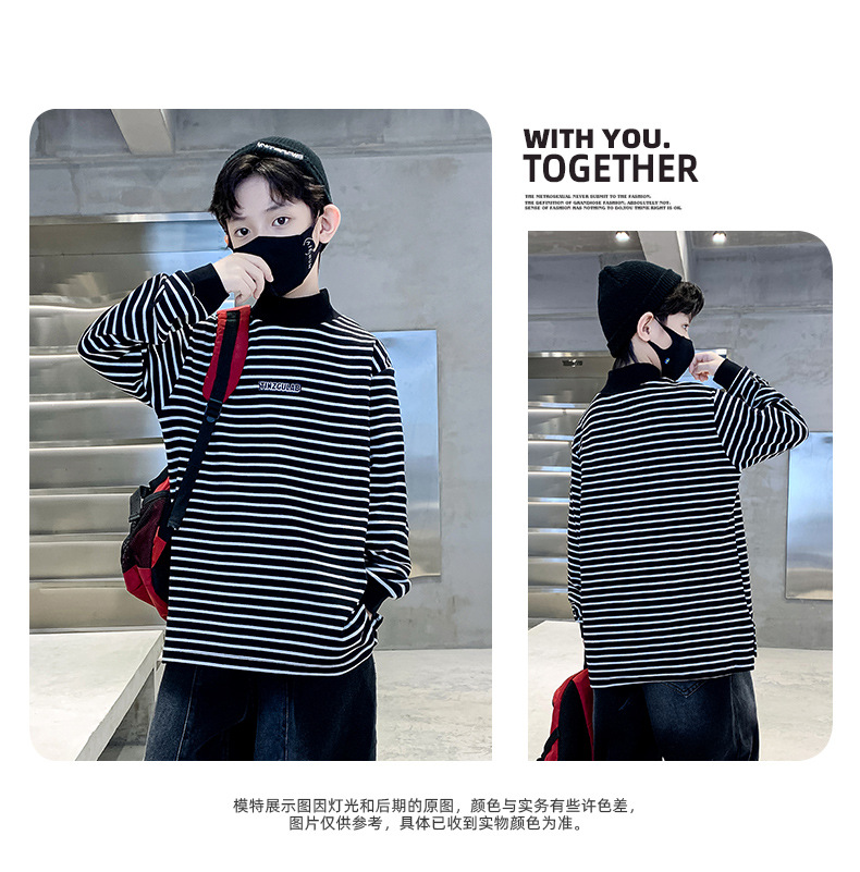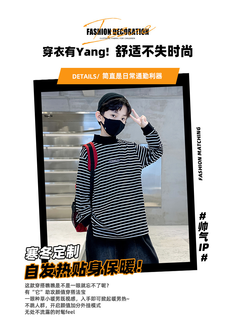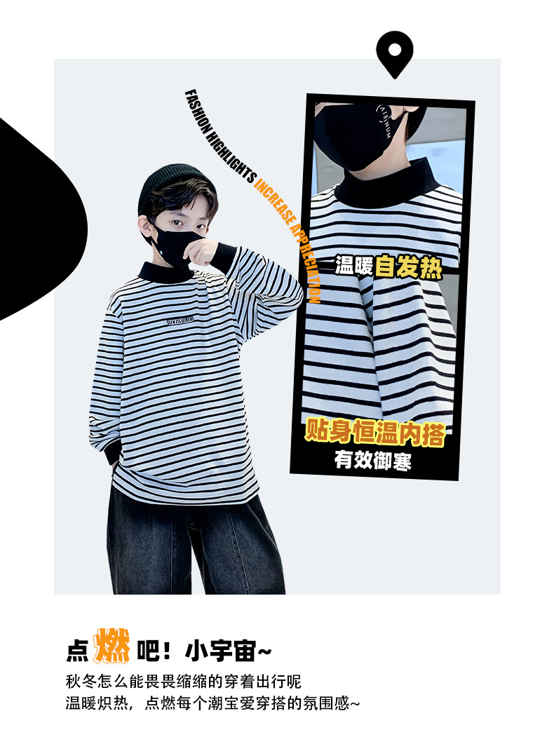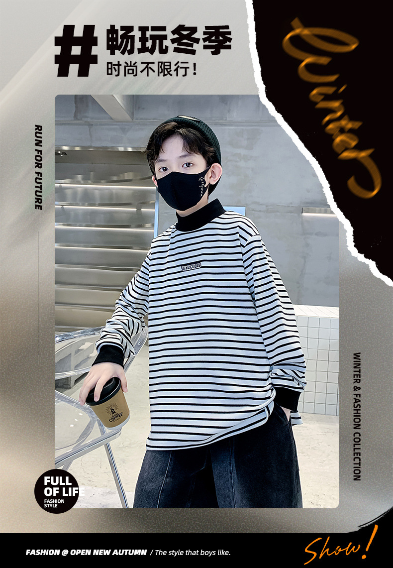 冬季男童德绒打底衫23新品大男孩条纹中领打底衫上衣内搭加绒百搭