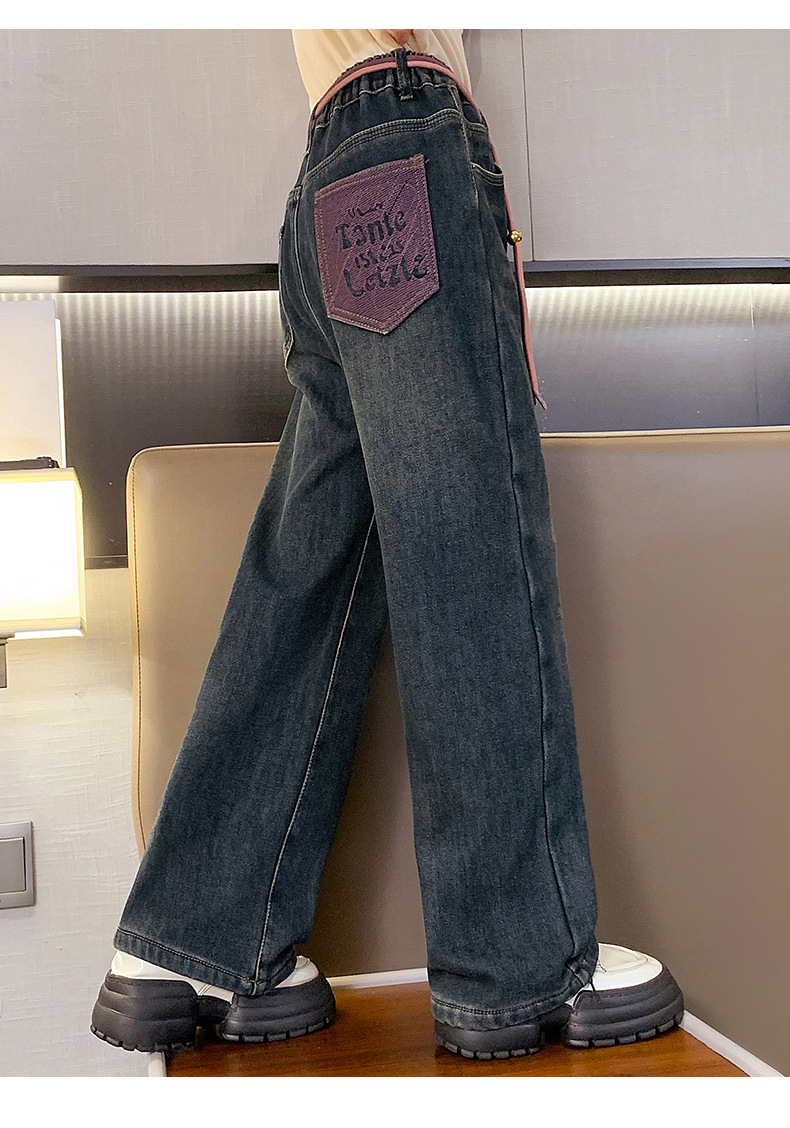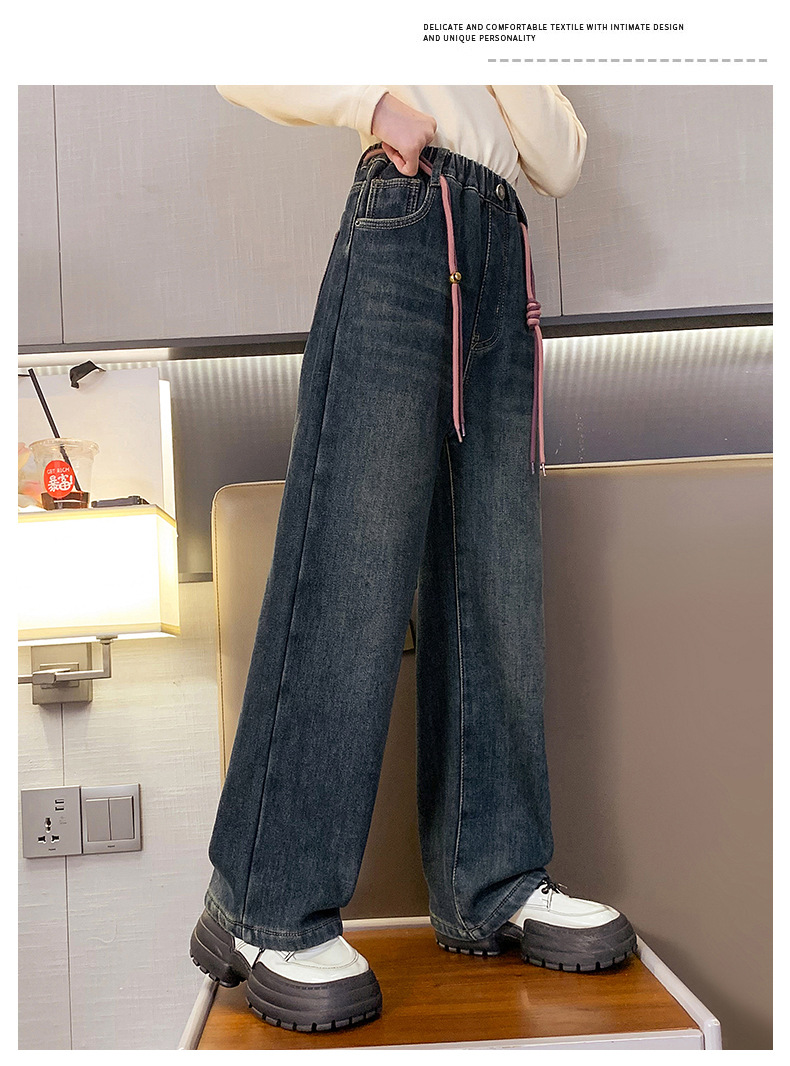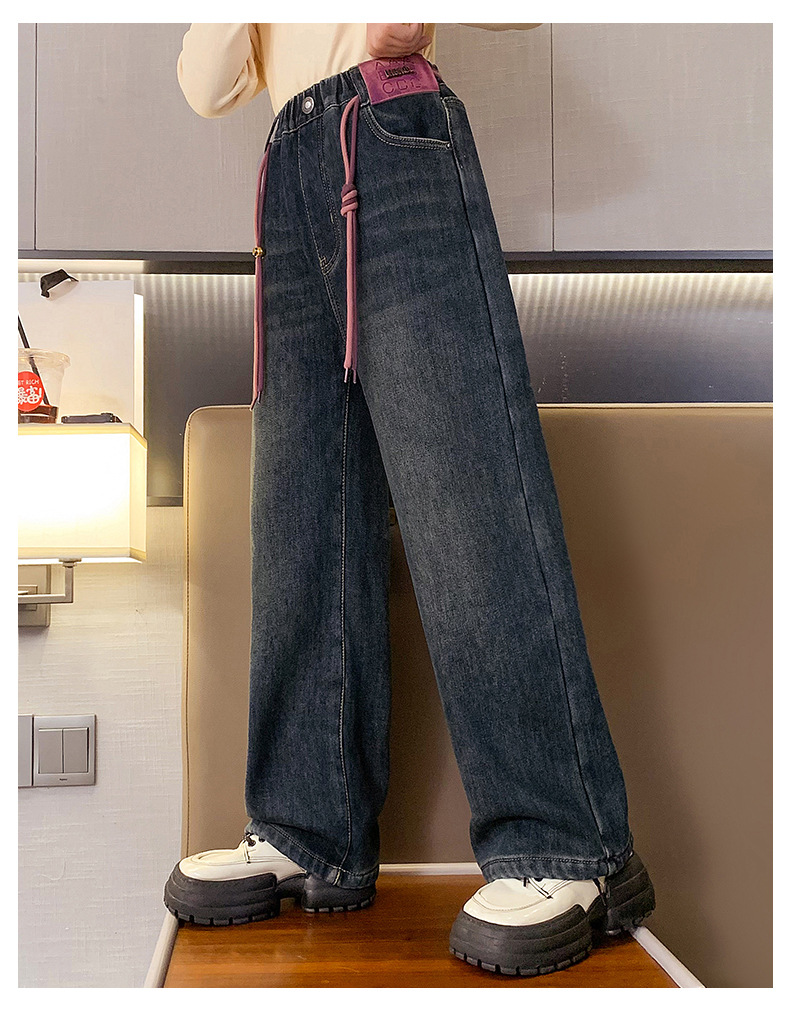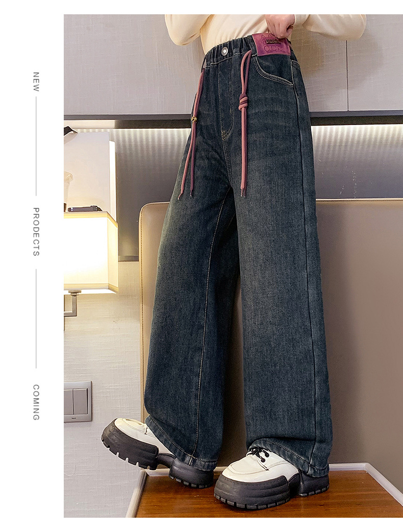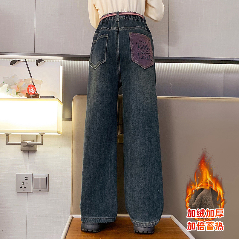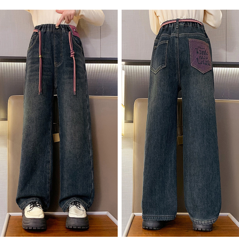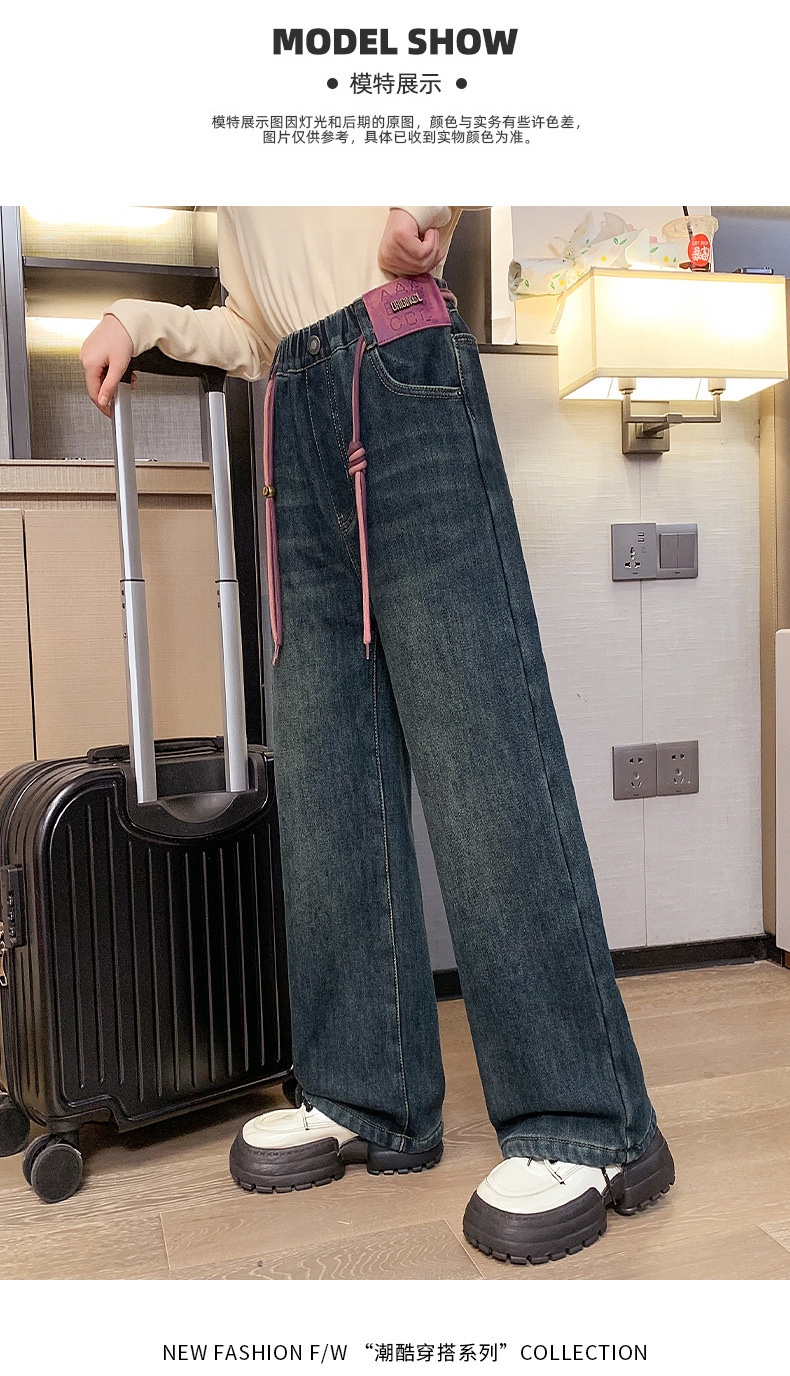 冬季女童加绒牛仔裤新款童装儿童女孩阔腿长裤潮流裤子宽松直筒韩