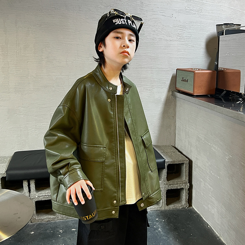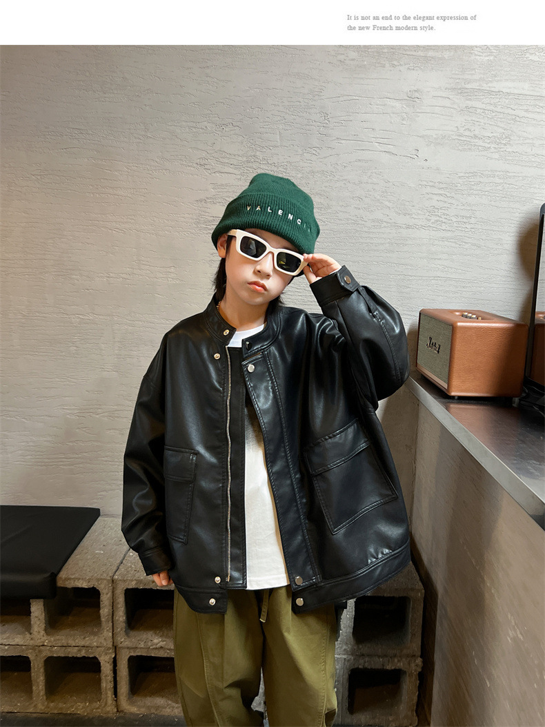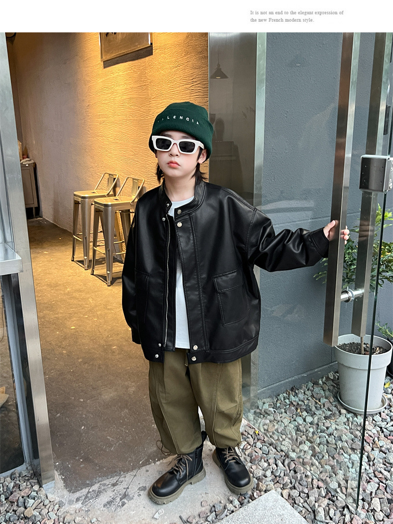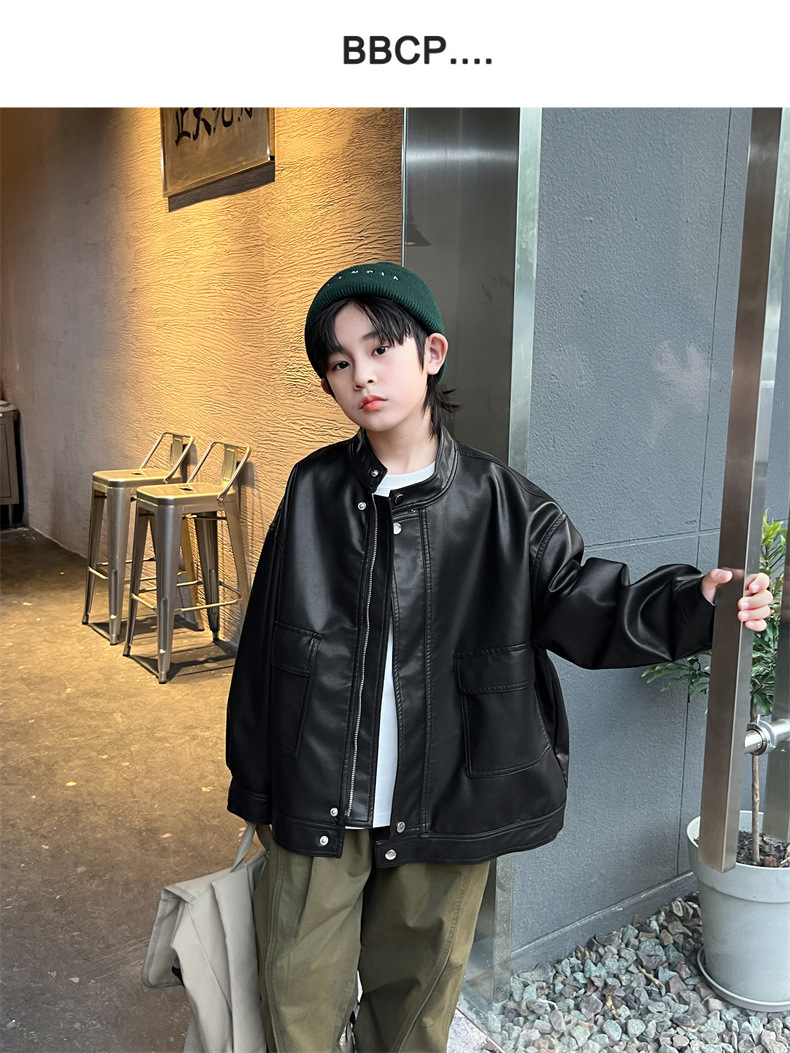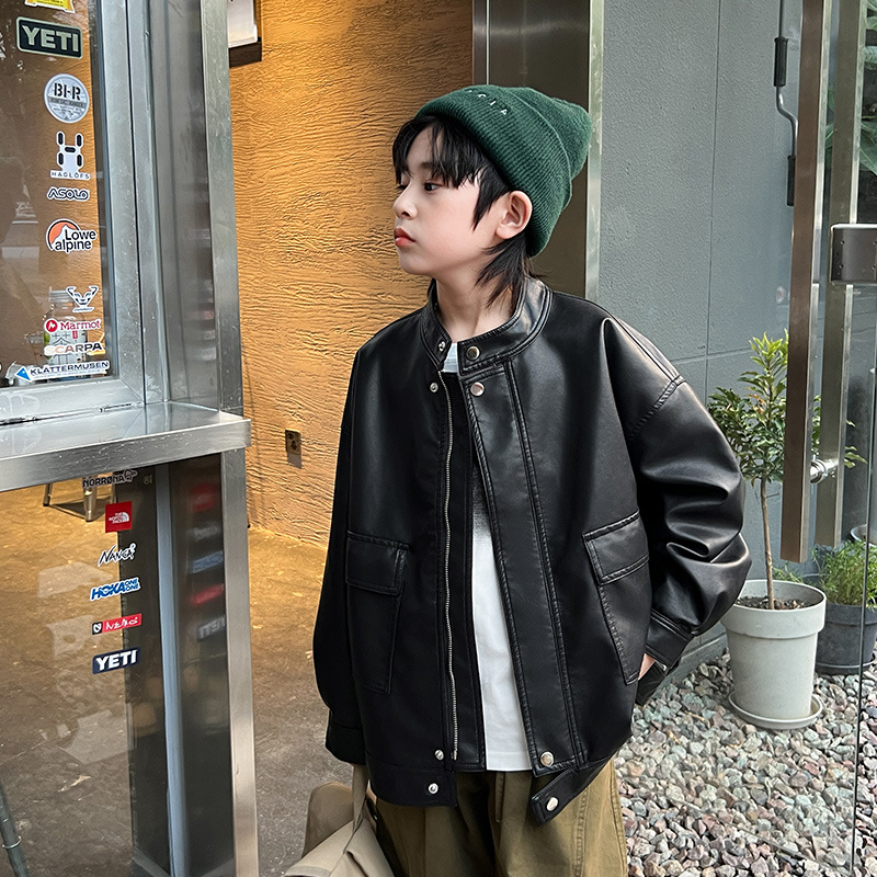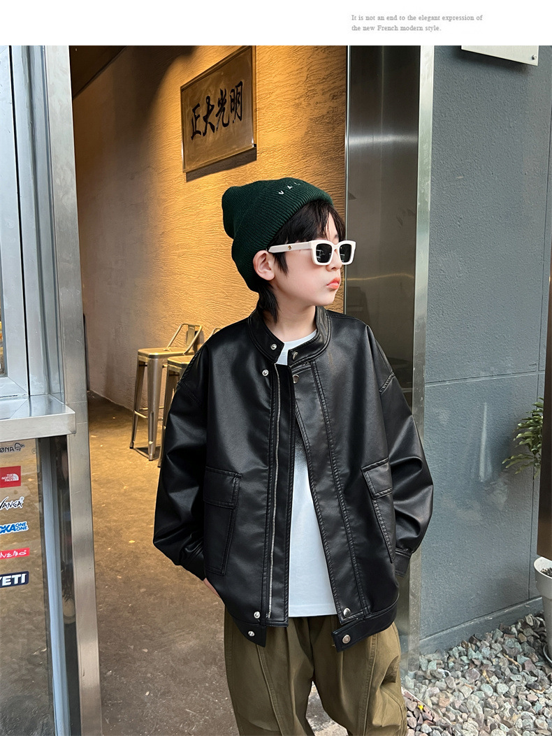 男童皮衣秋季童装儿童大男孩皮外套纯色潮酷2023新款潮装上衣个性