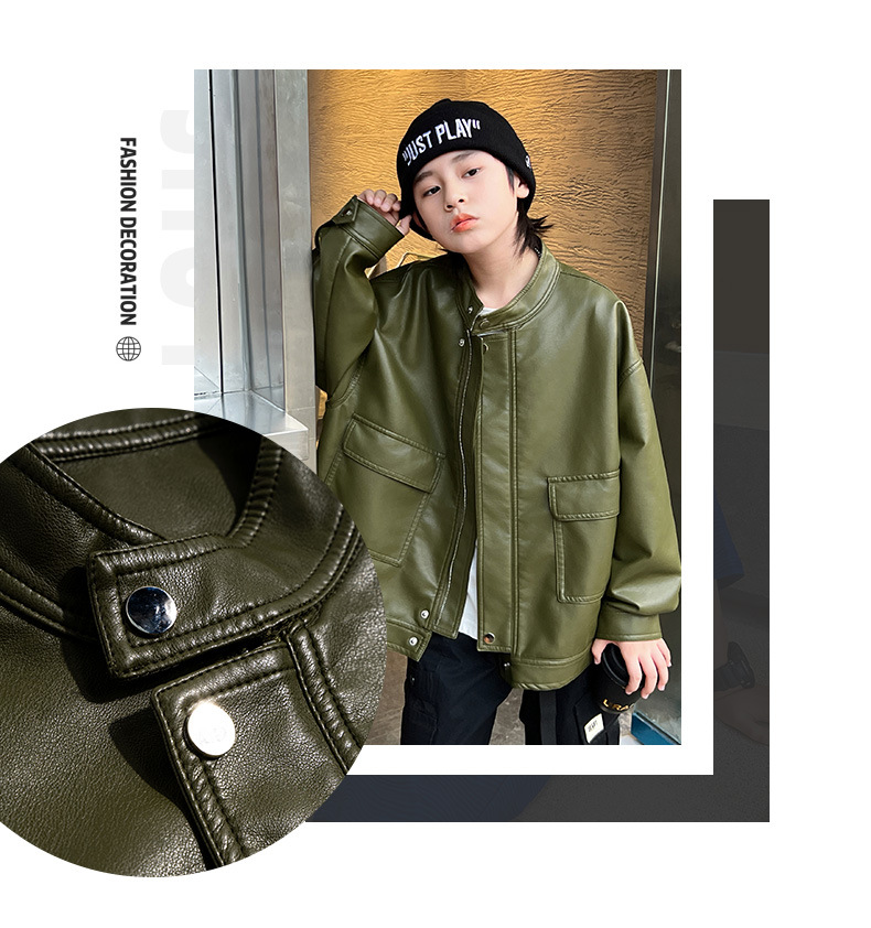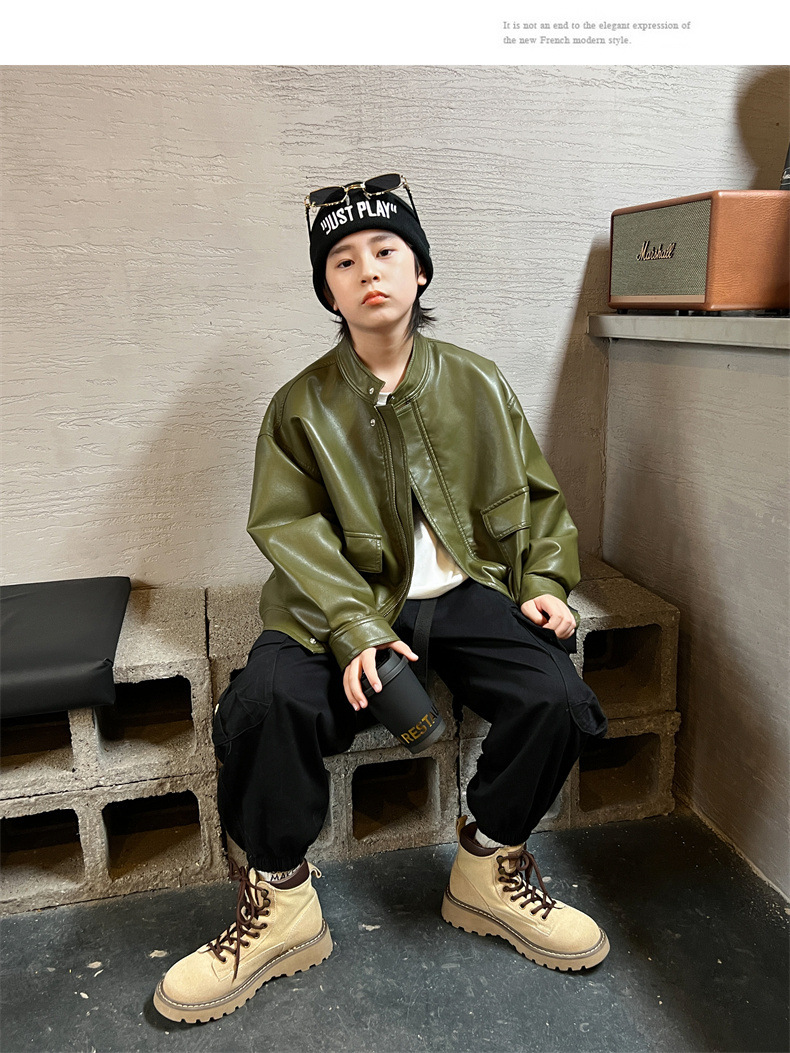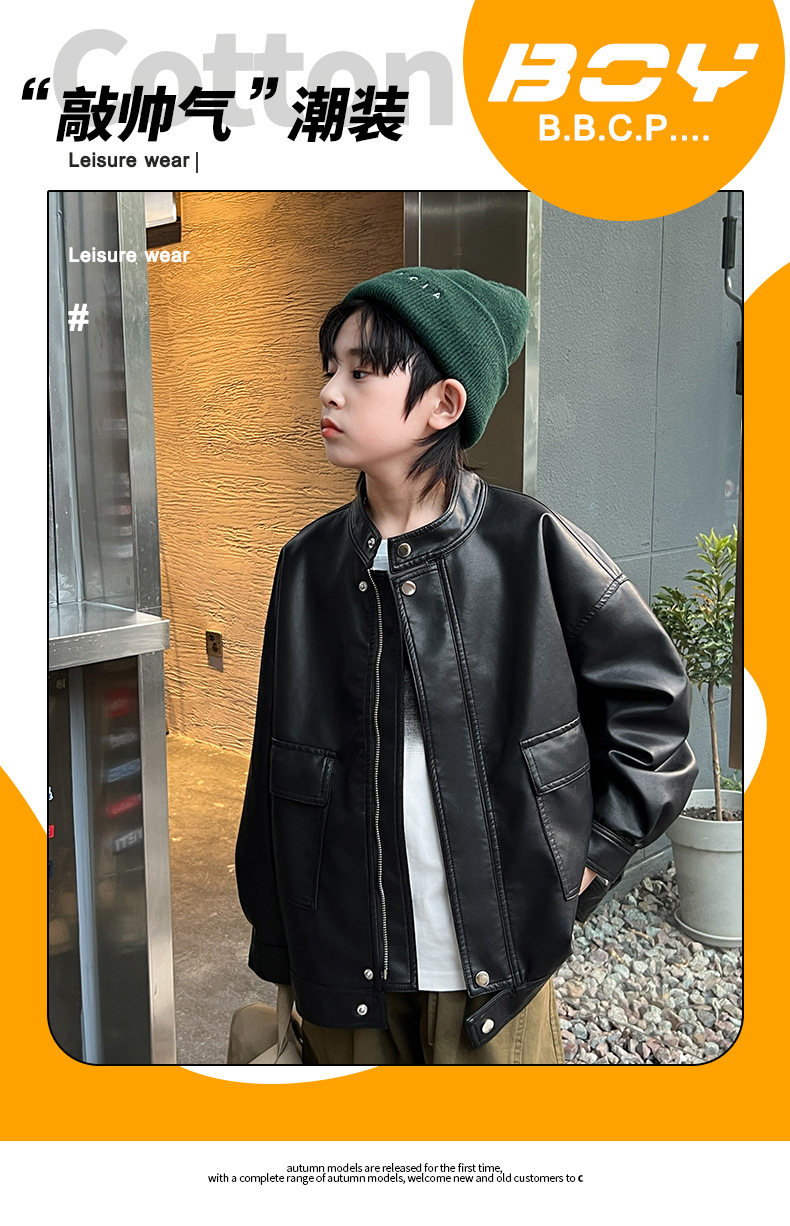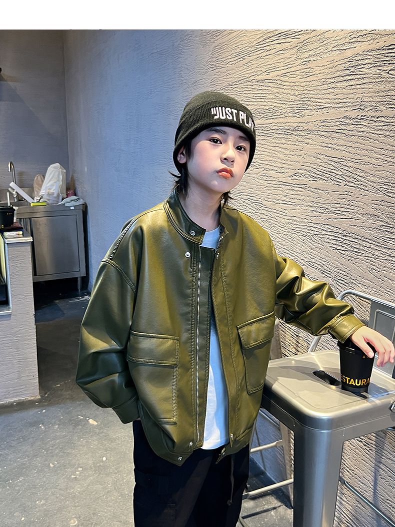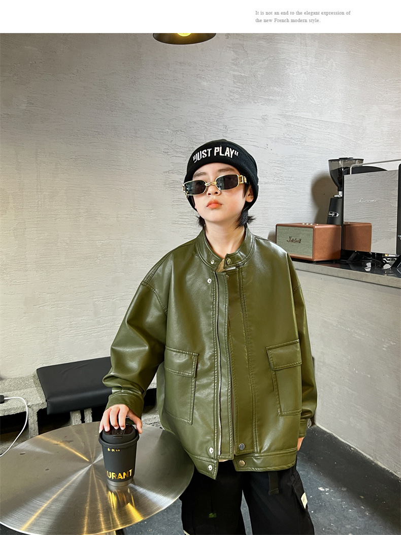 男童皮衣秋季童装儿童大男孩皮外套纯色潮酷2023新款潮装上衣个性