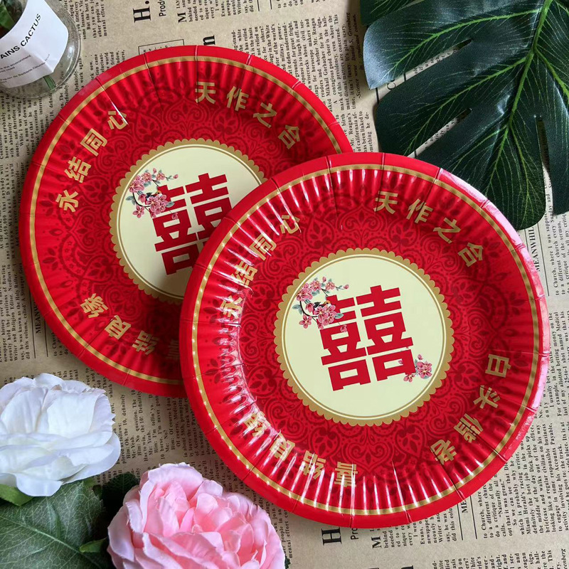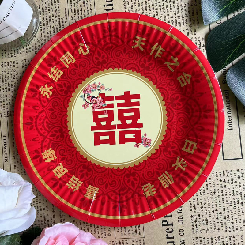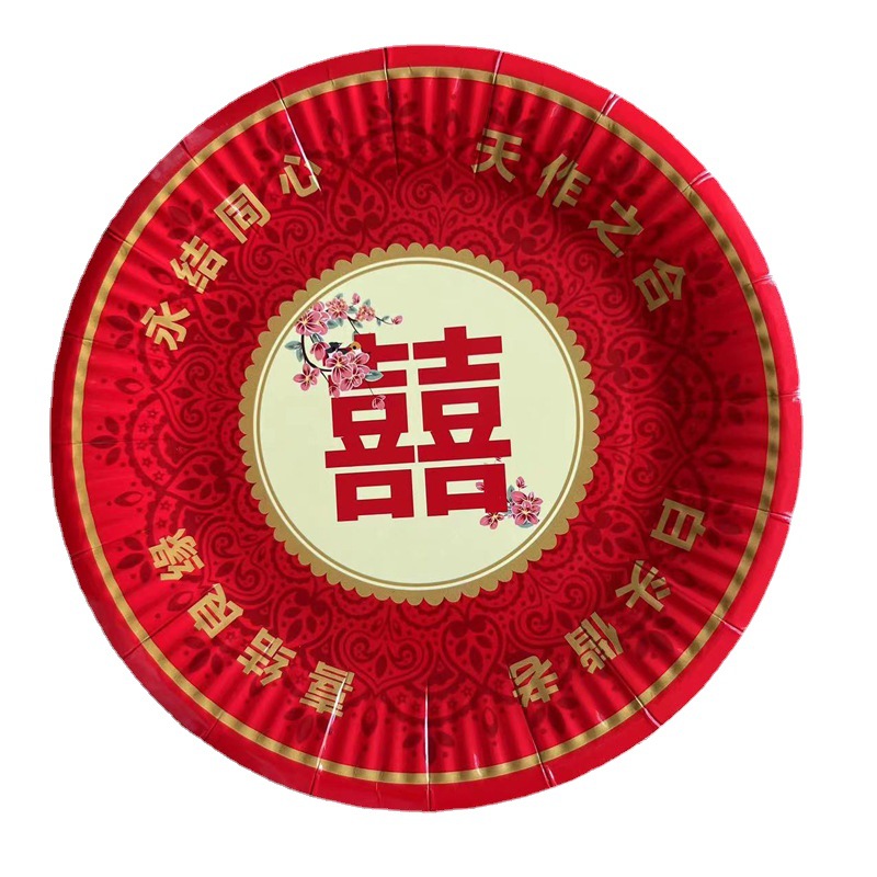 双喜印刷盘大红喜庆盘7寸盘一次性盘子白卡纸盘细纹7寸盘厂家批发