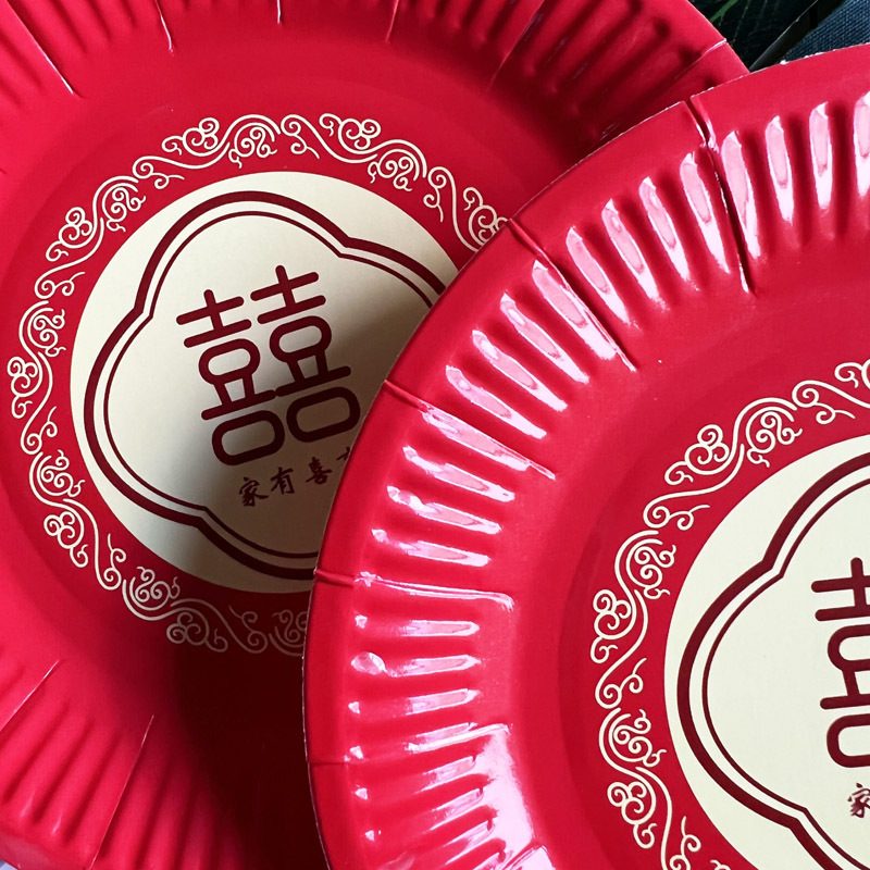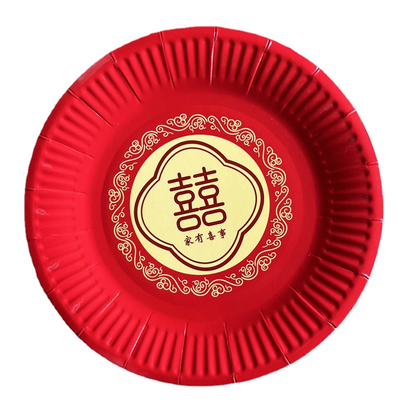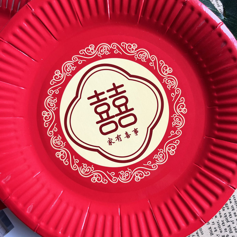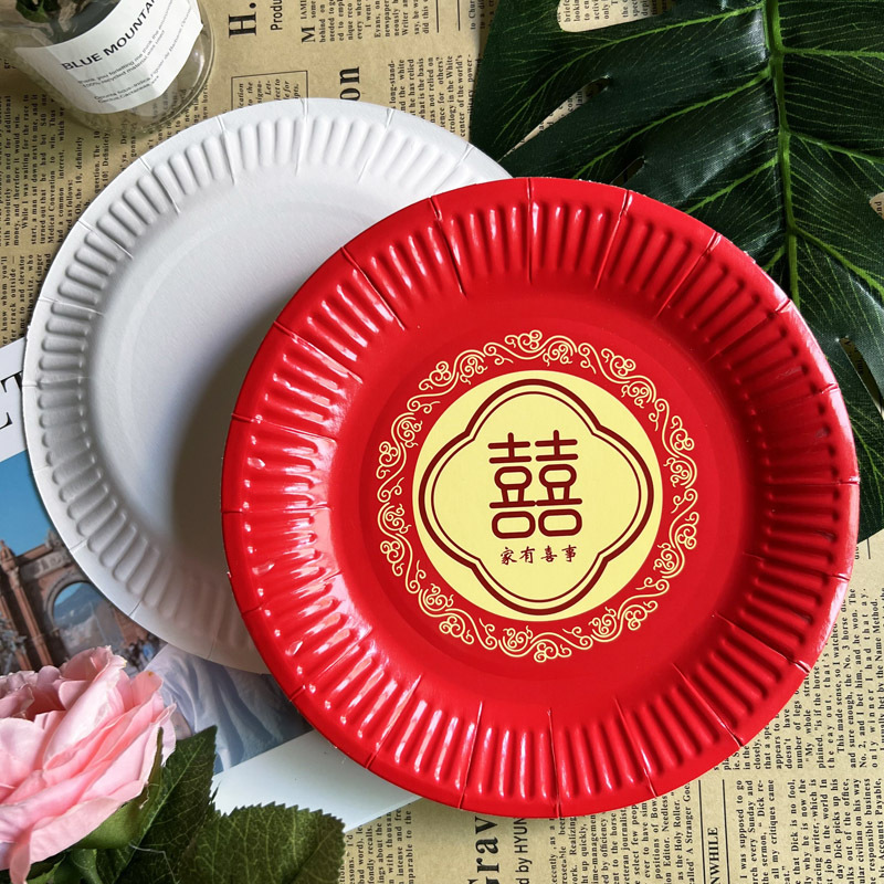 7寸盘250克大红双喜喜庆盘细纹白卡纸盘圆形盘一次性纸盘派对盘子