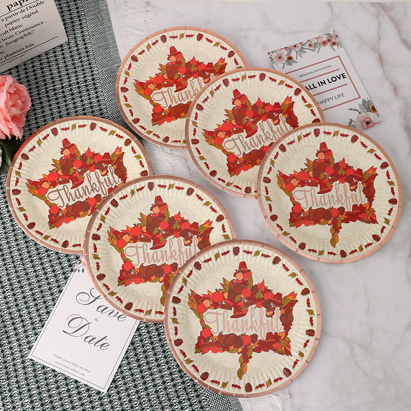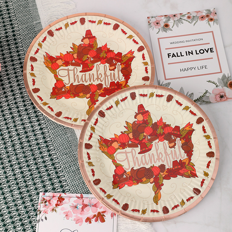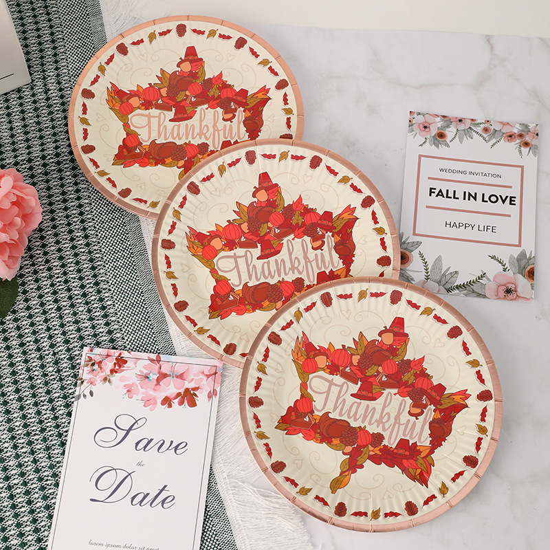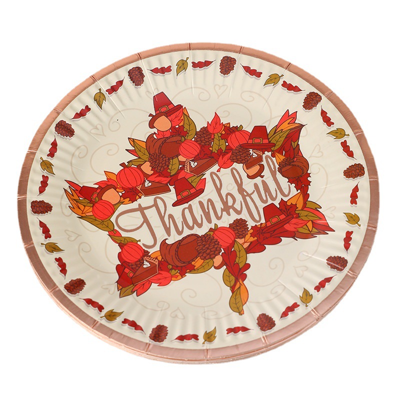 一次性纸盘烫金字母枫叶细纹圆形纸盘7寸白卡纸盘派对盘厂家批发