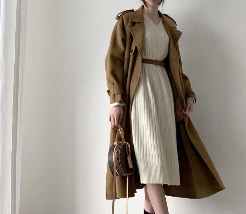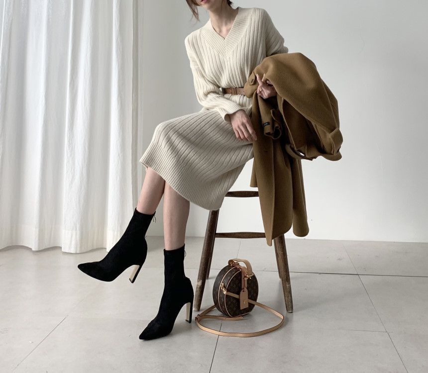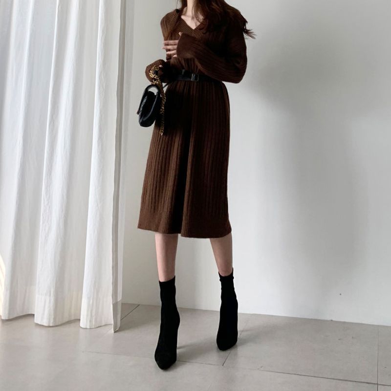 针织连衣裙秋冬新款慵懒风中长款V领针织衫女韩版宽松套头毛衣裙