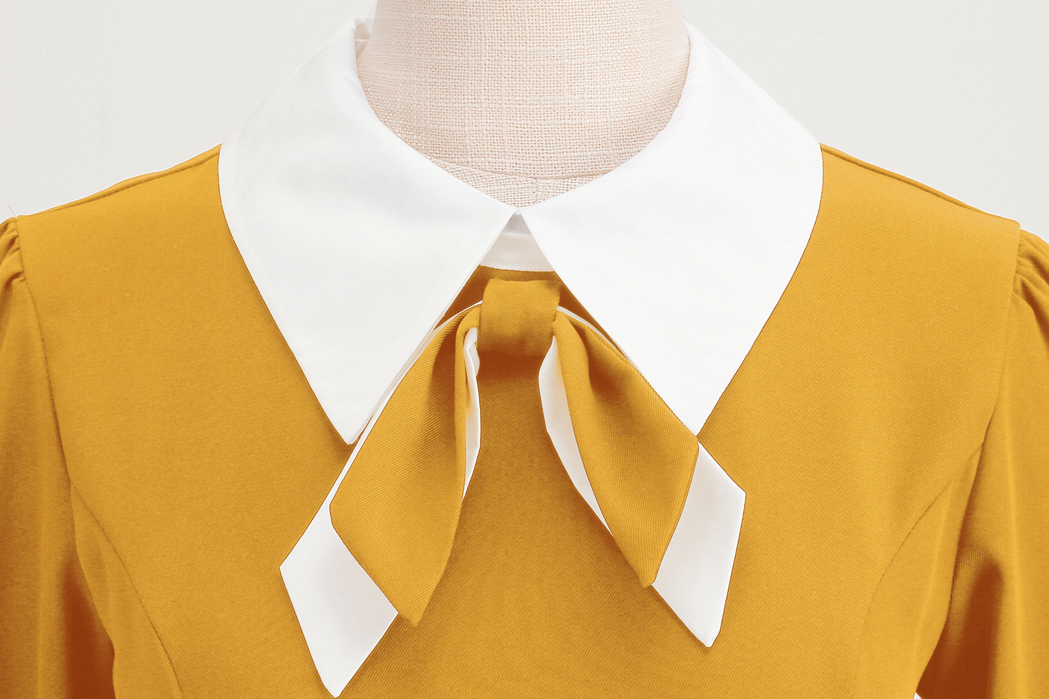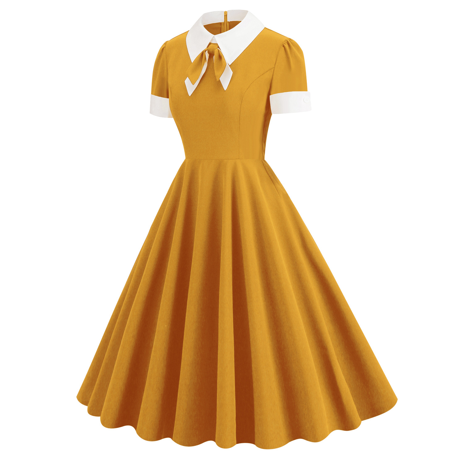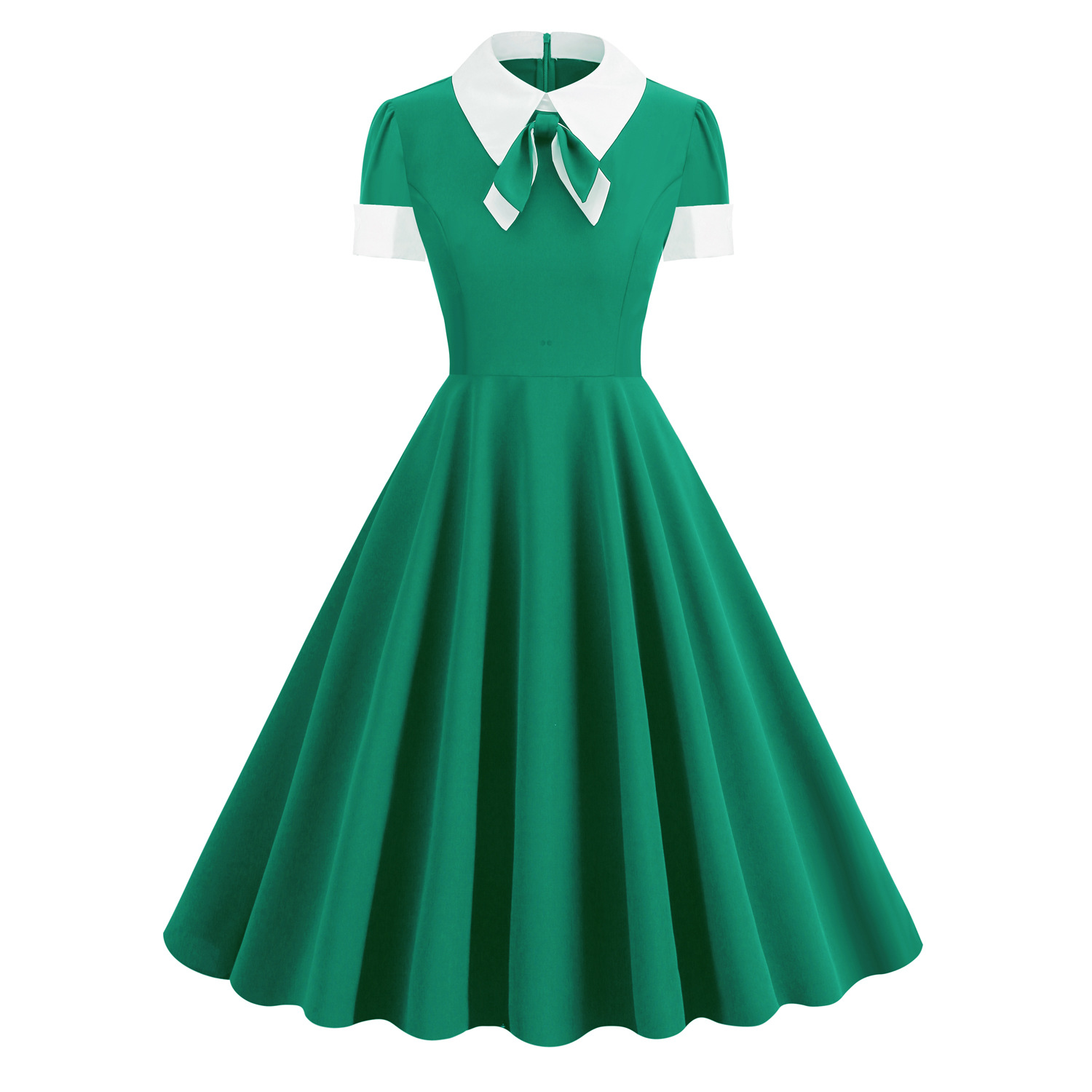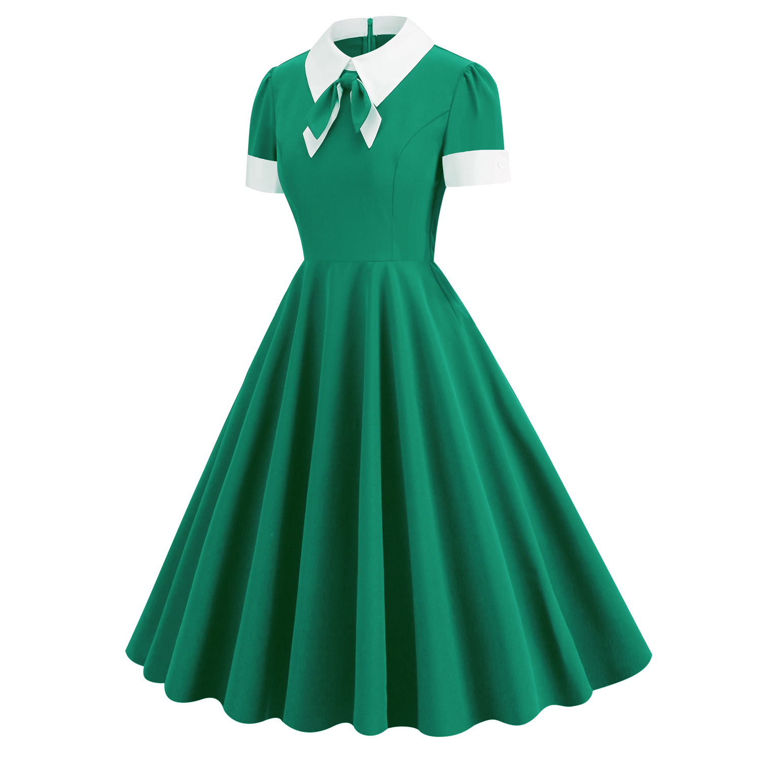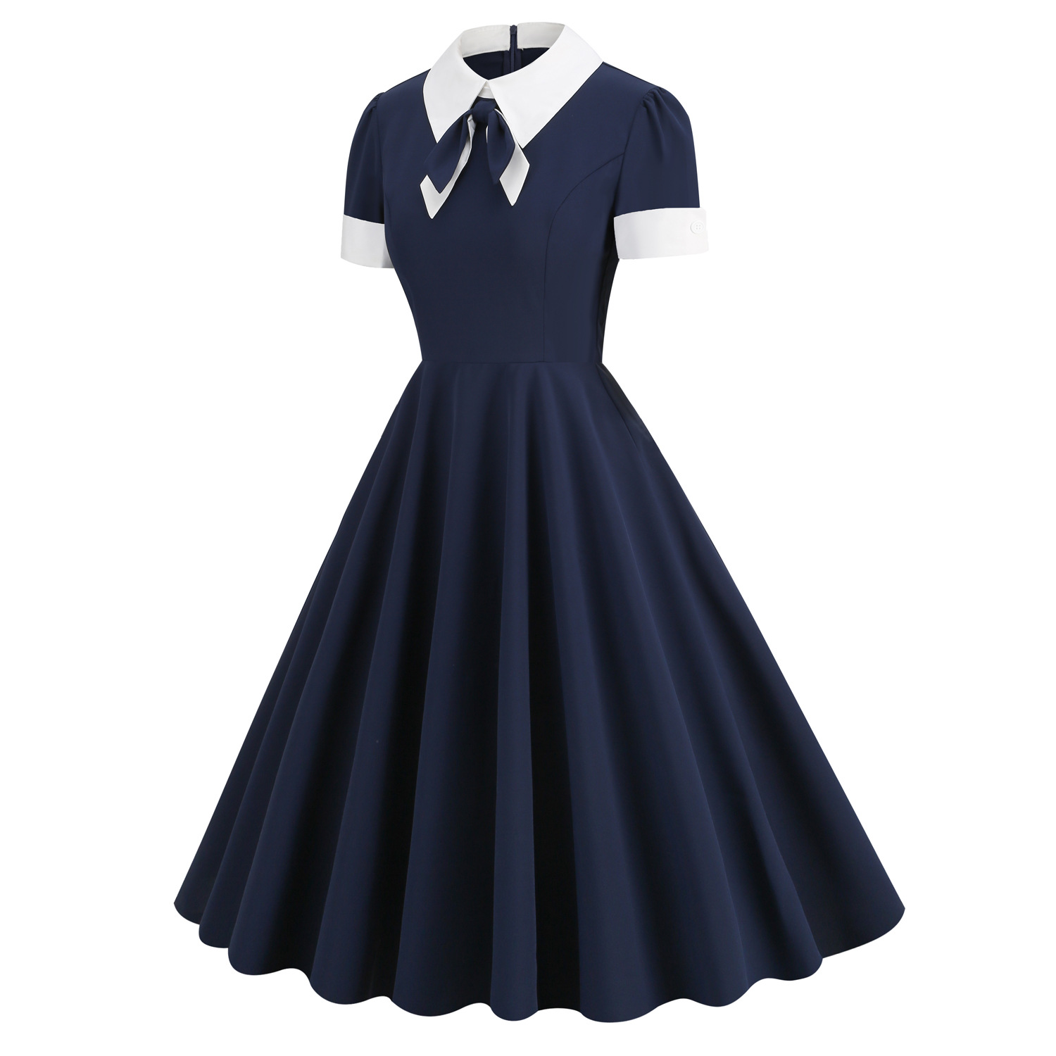 1950'S衬衣领蝴蝶结撞色复古大摆连衣裙白领通勤连衣裙约会小礼服