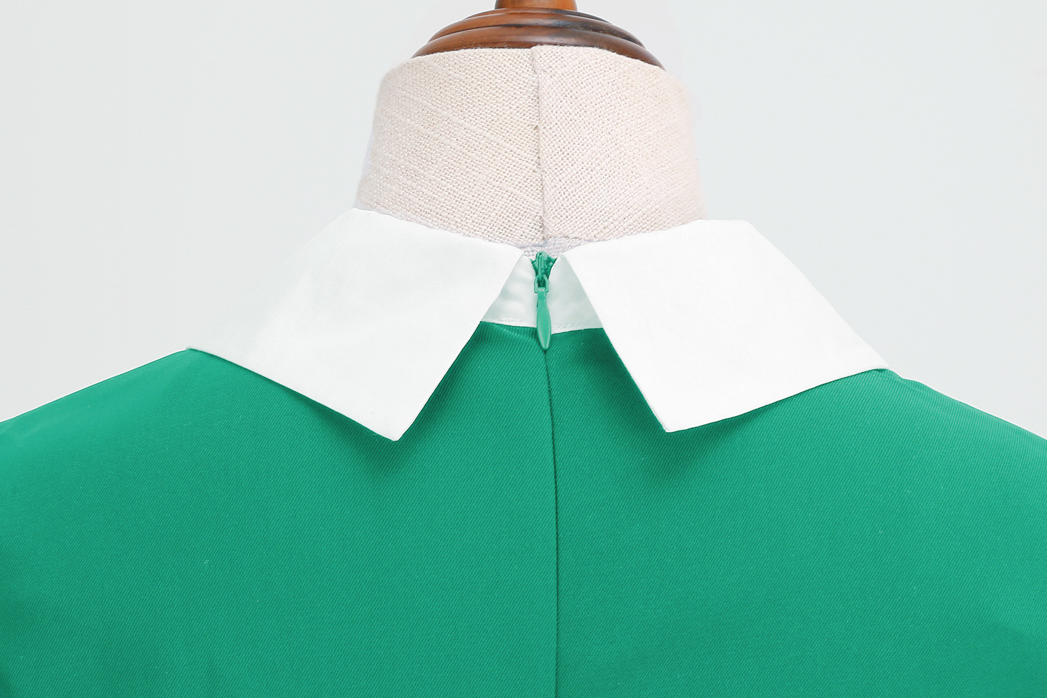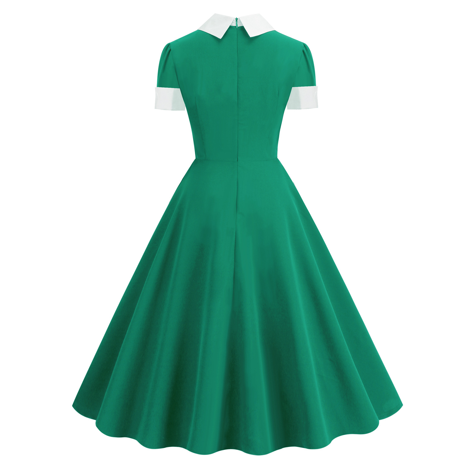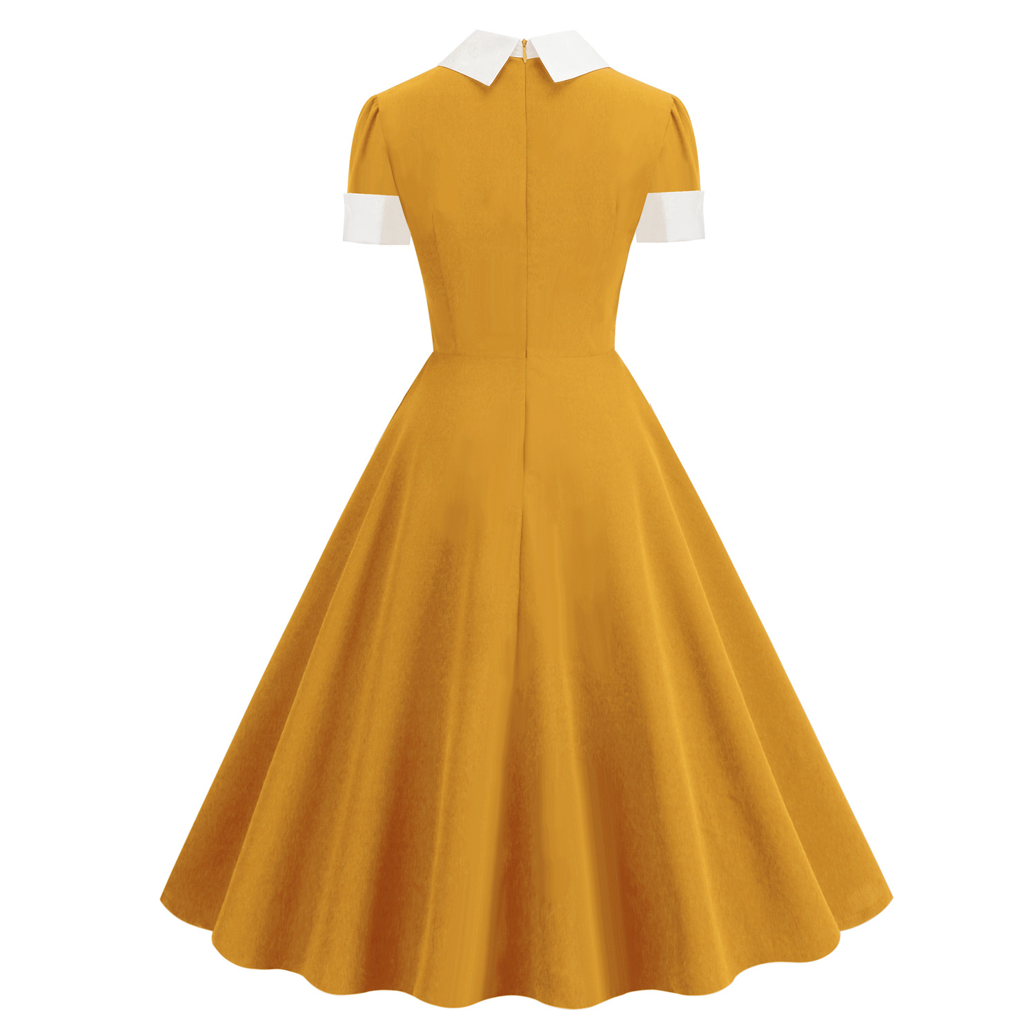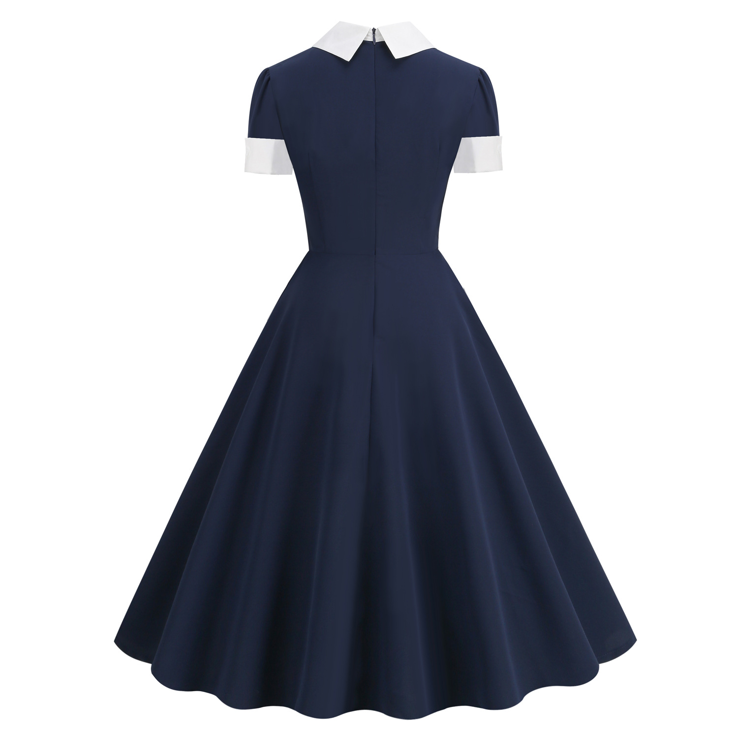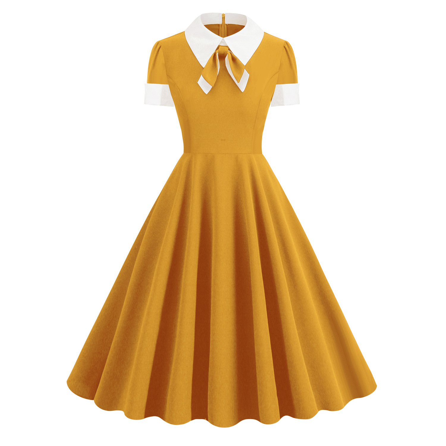 1950'S衬衣领蝴蝶结撞色复古大摆连衣裙白领通勤连衣裙约会小礼服