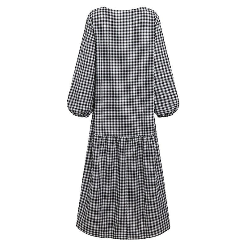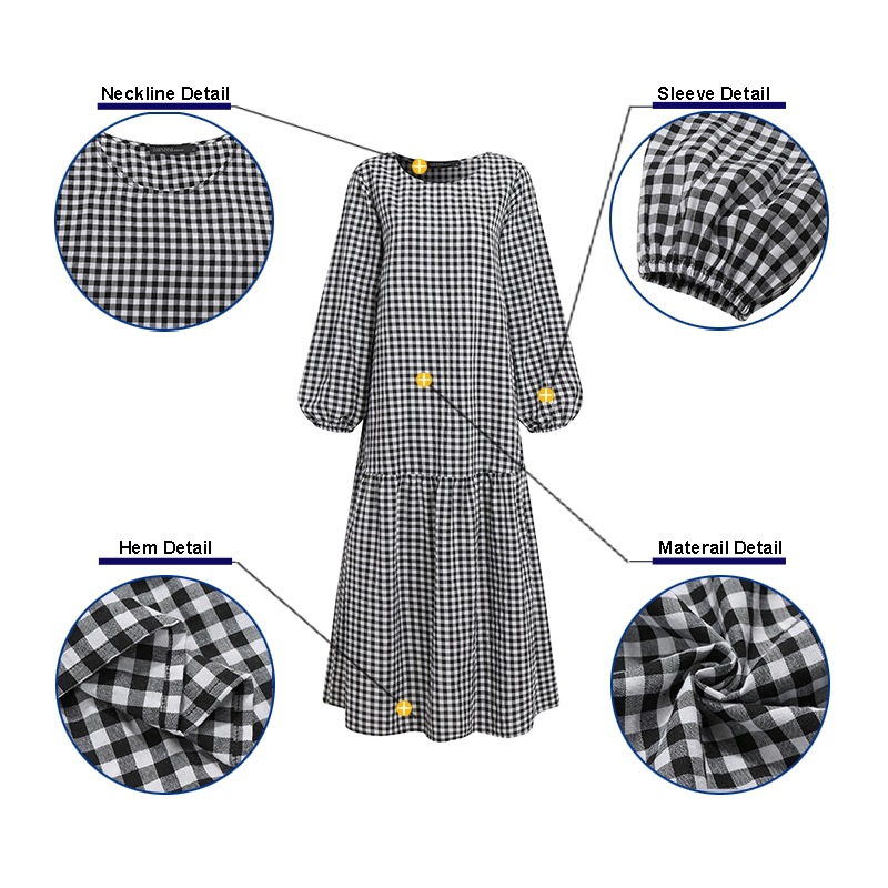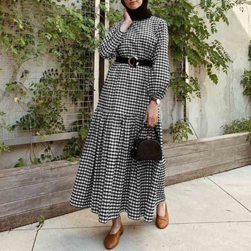 阿拉伯民族服装格子长袖中长款穆斯林女性服装S-5XL大码夏连衣裙