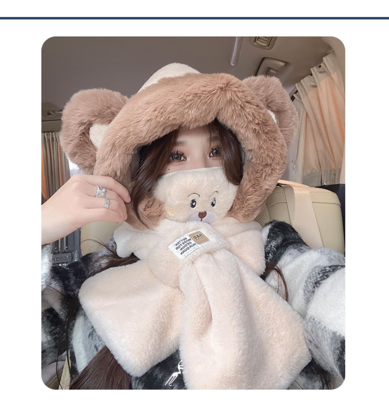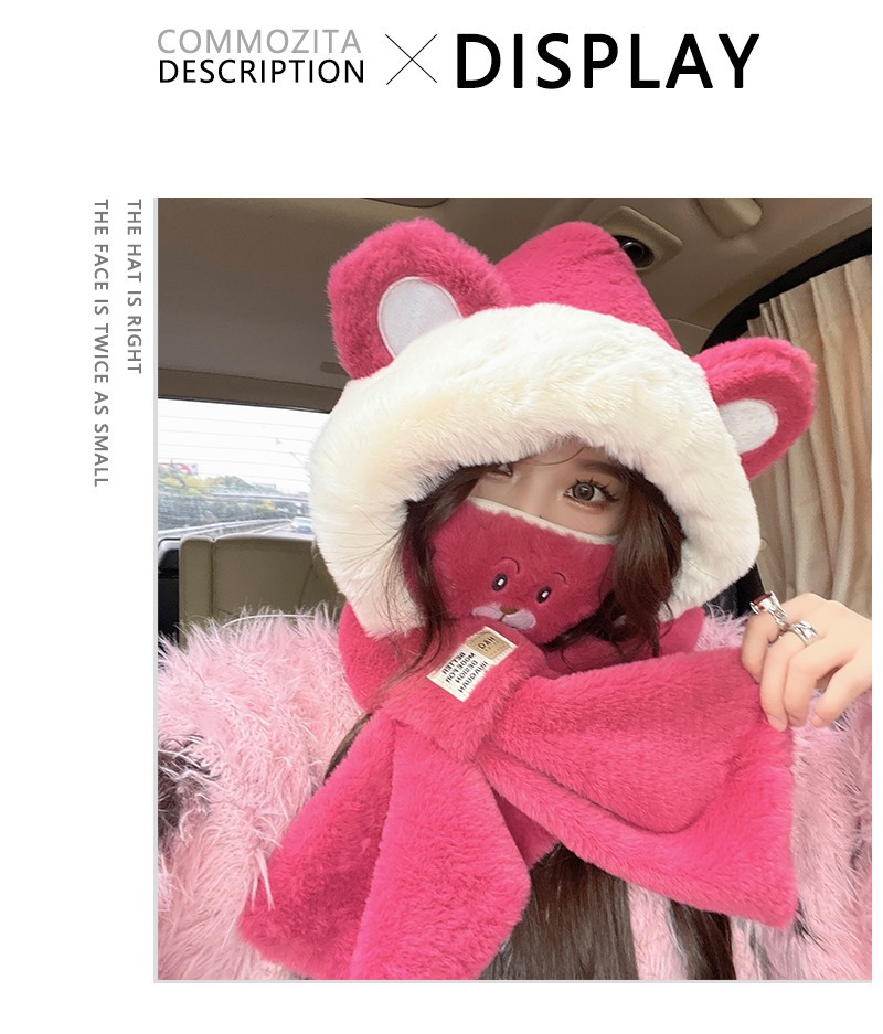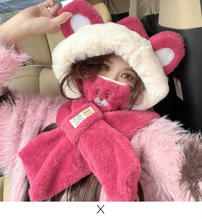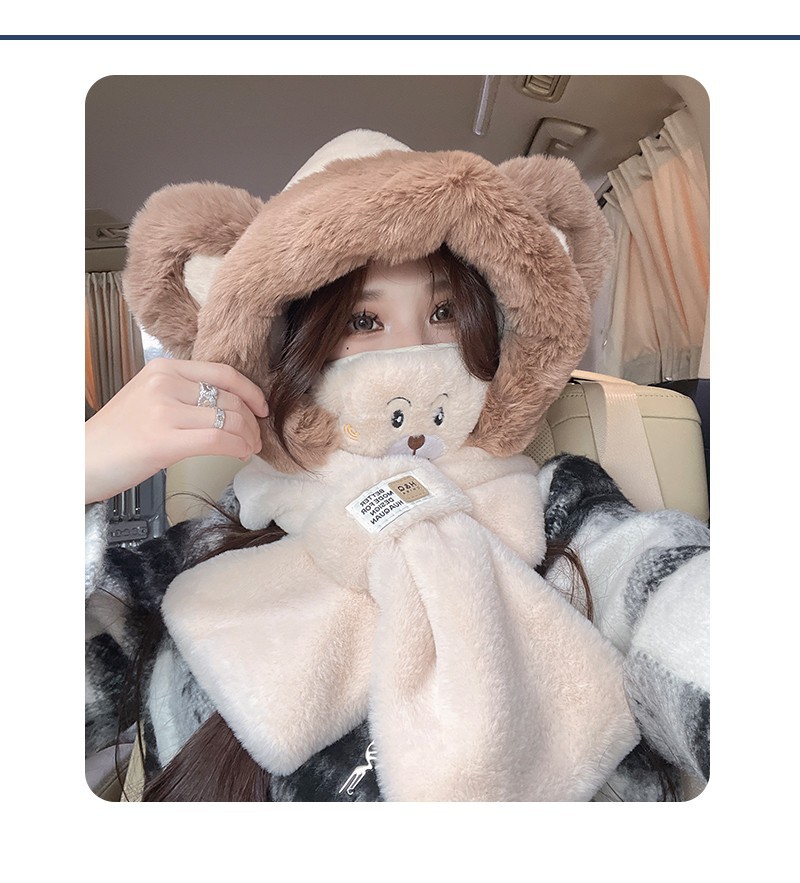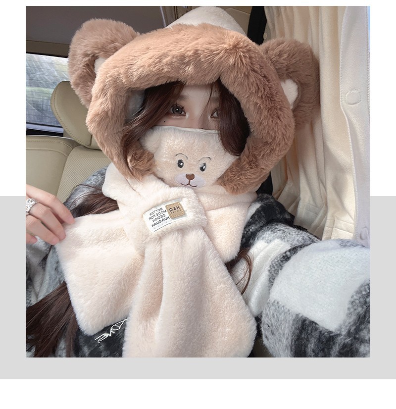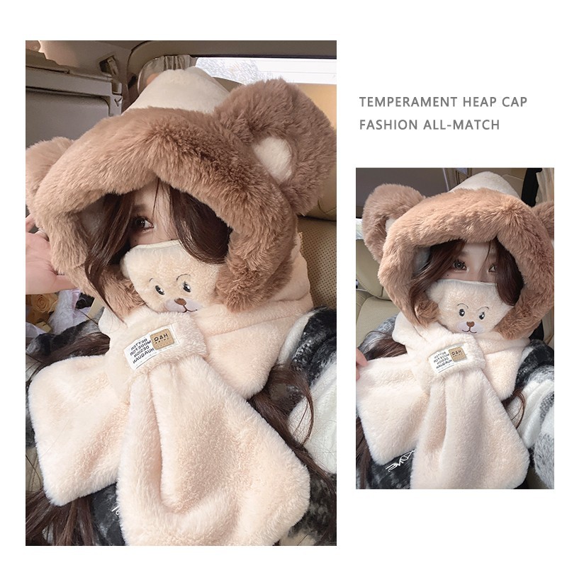 可爱小熊帽子围巾围脖一体女冬季护耳罩雷锋帽毛绒骑车保暖滑雪帽