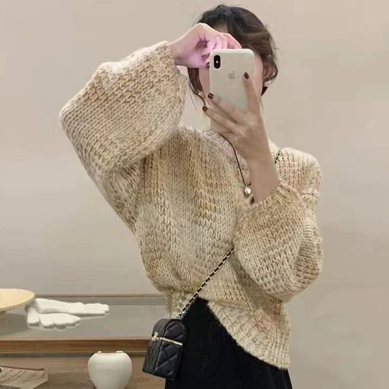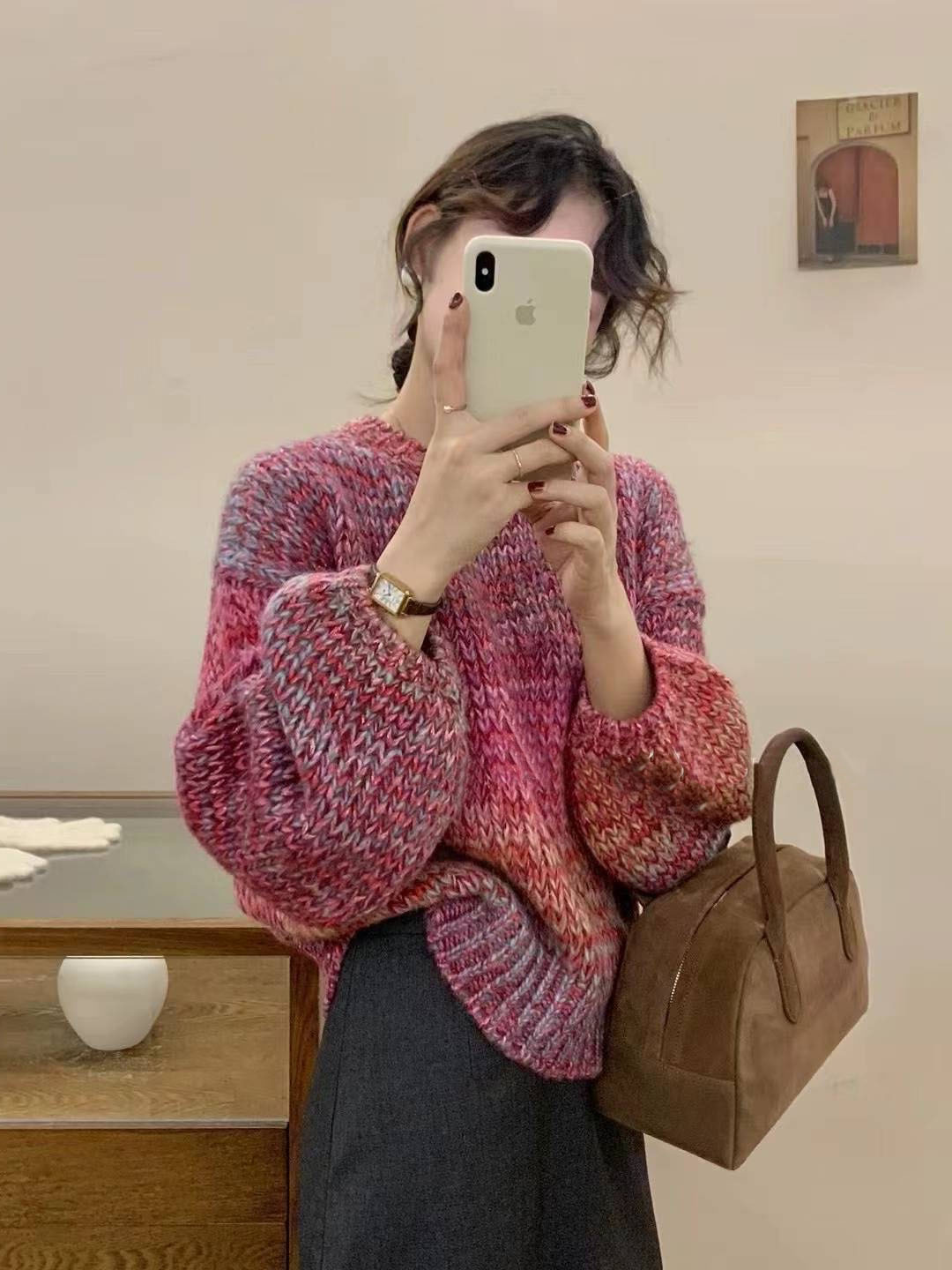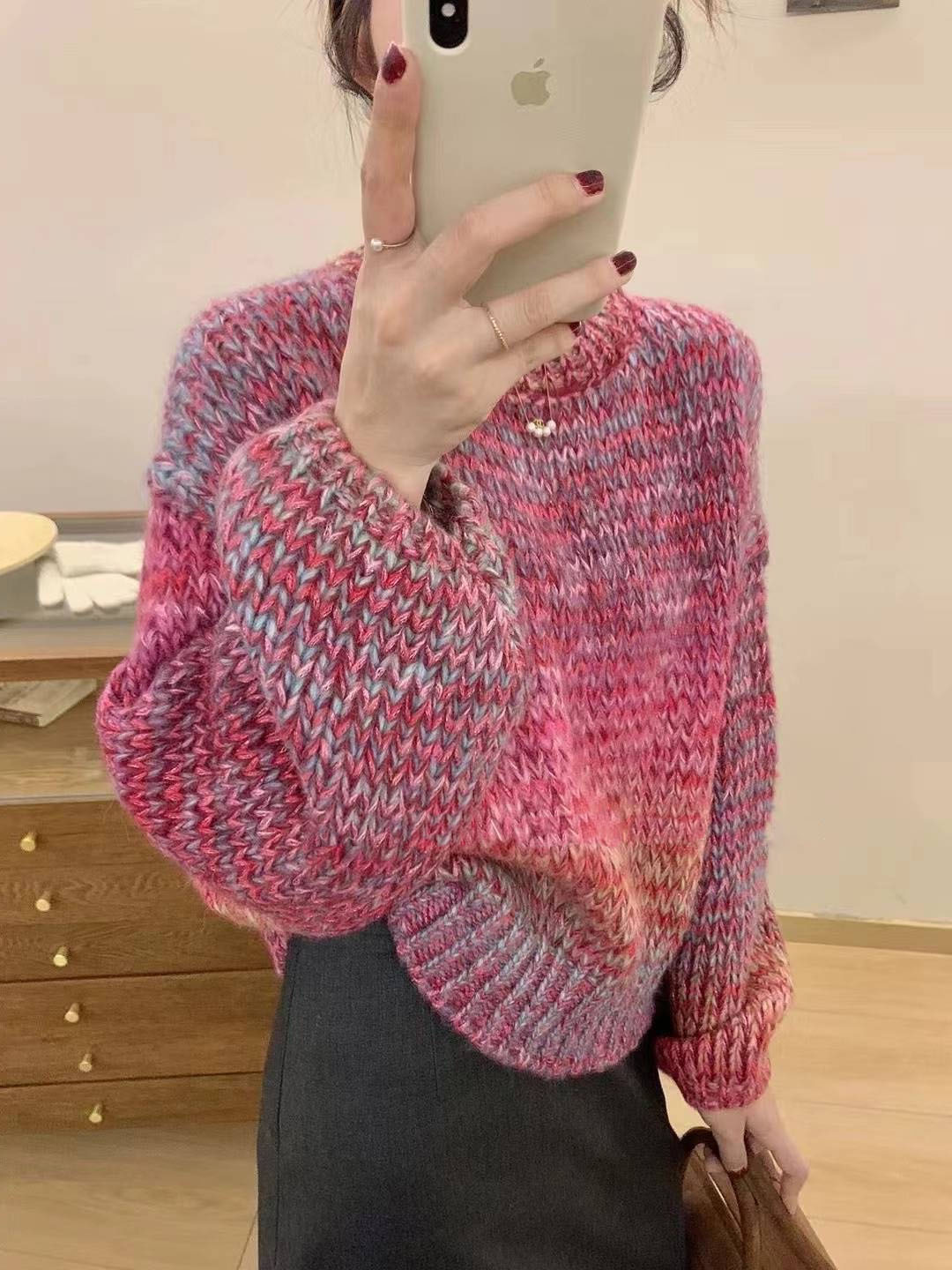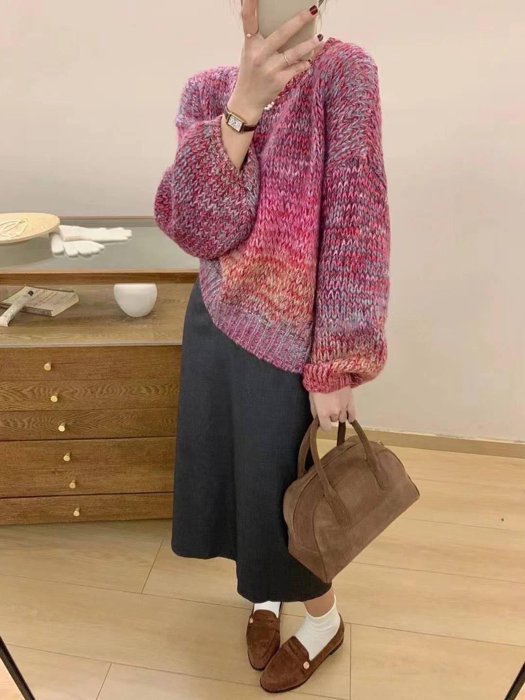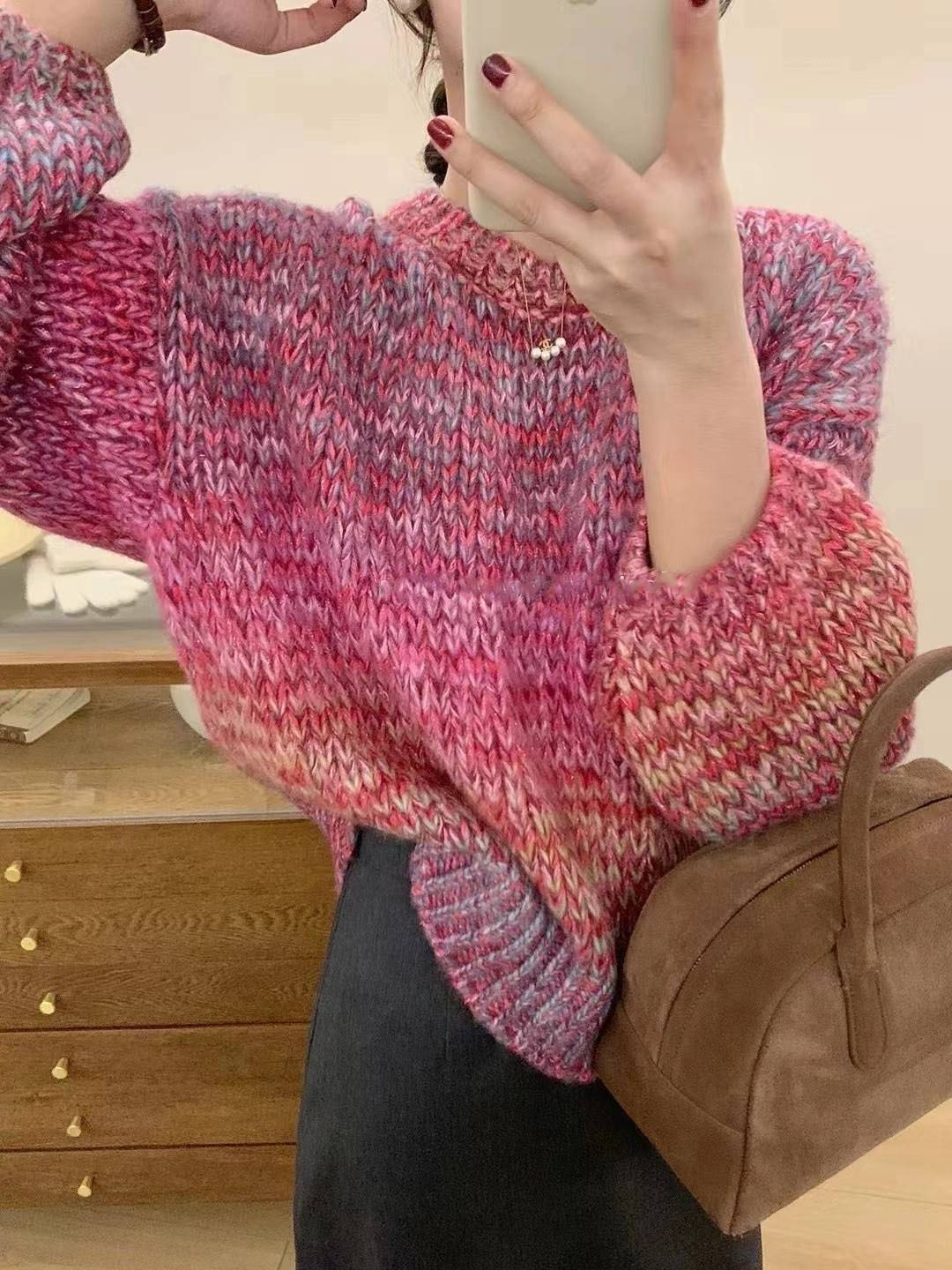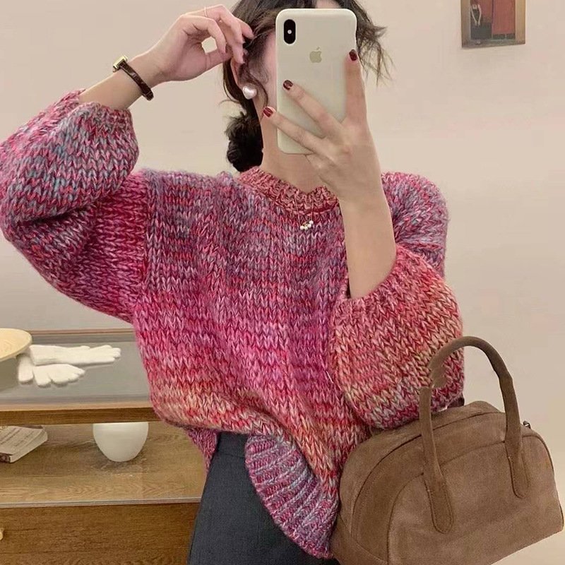 慵懒风渐变色圆领套头针织衫女秋冬新款软糯长袖宽松针织衫上衣潮