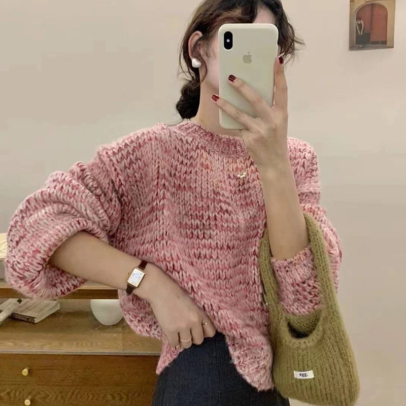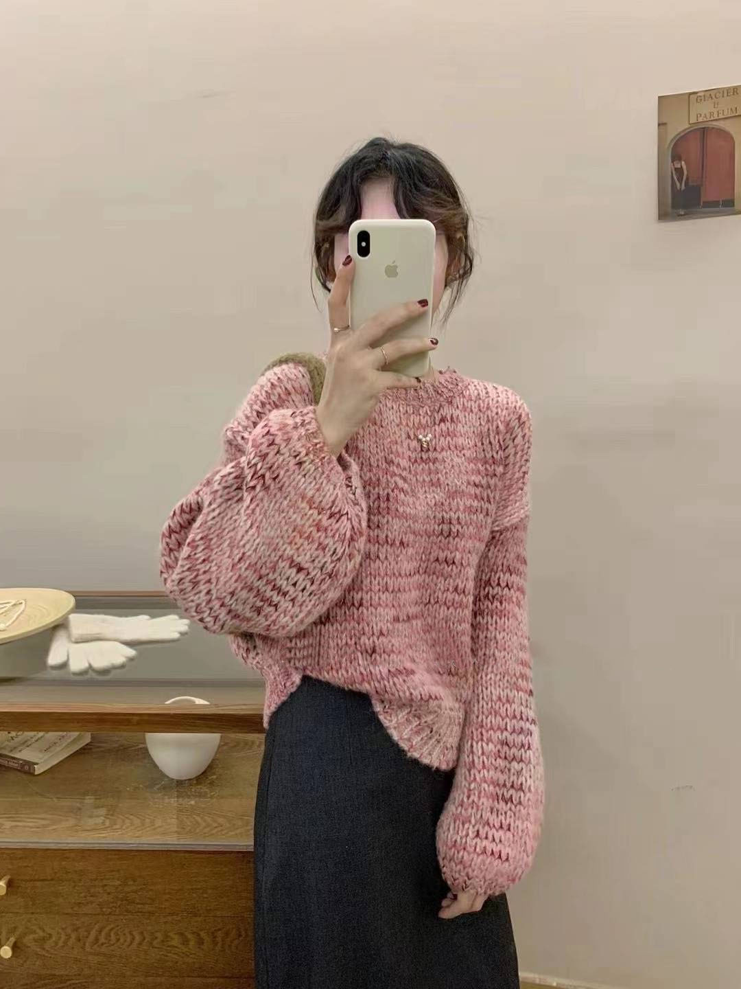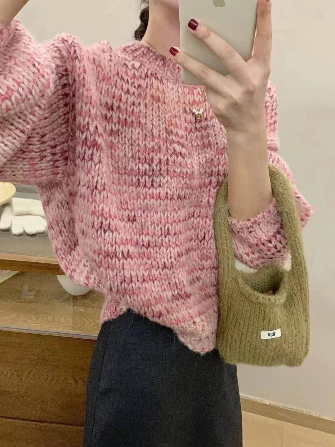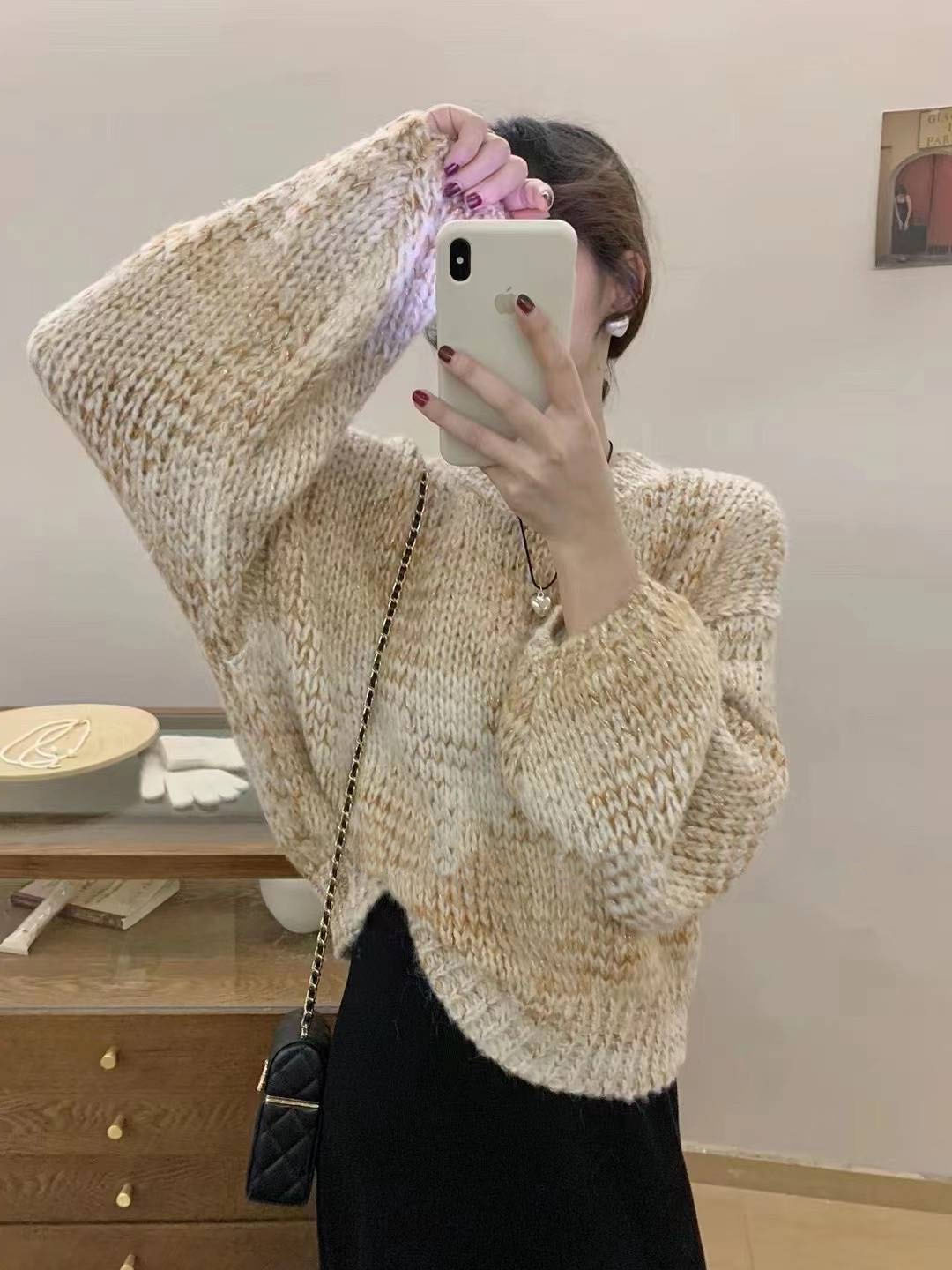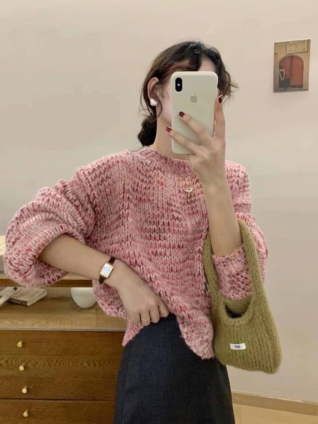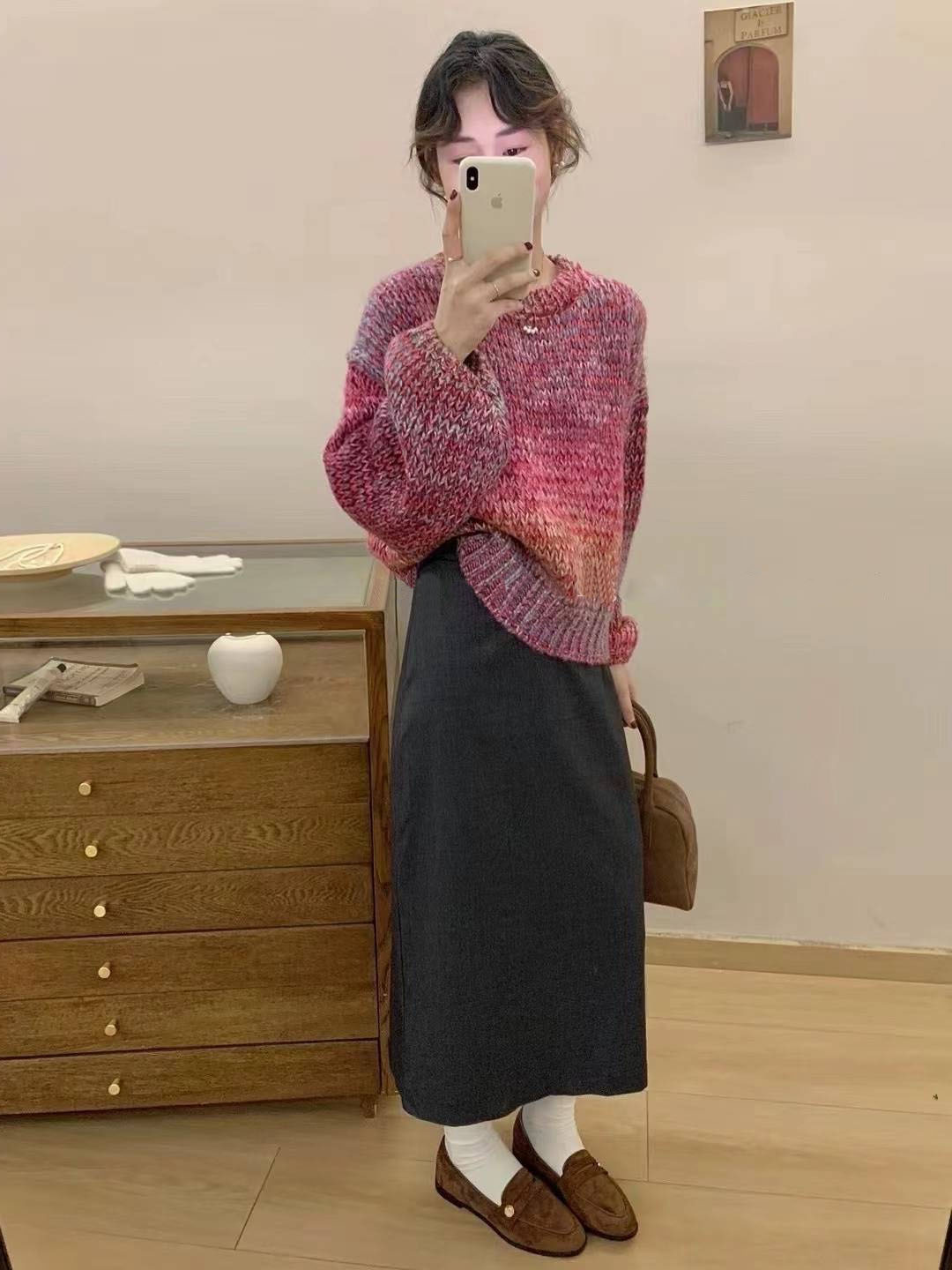 慵懒风渐变色圆领套头针织衫女秋冬新款软糯长袖宽松针织衫上衣潮