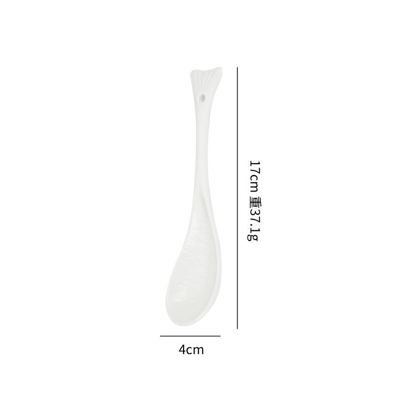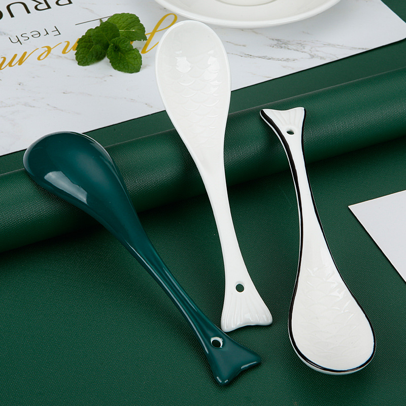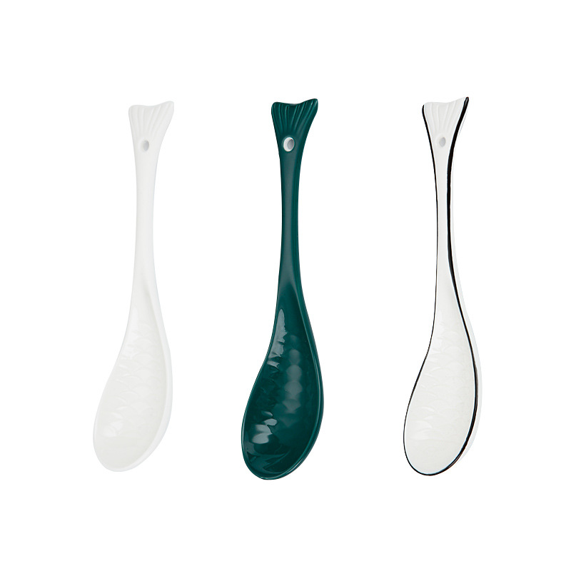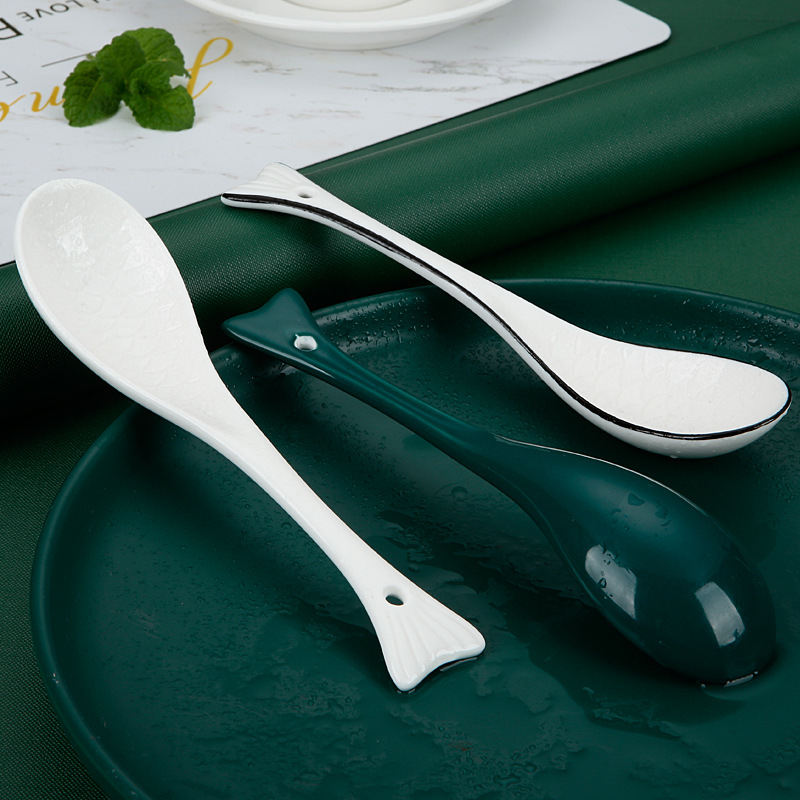 新款创意陶瓷勺子鱼勺纯白汤勺家用饭勺墨绿色勺餐厅酒店勺子批发