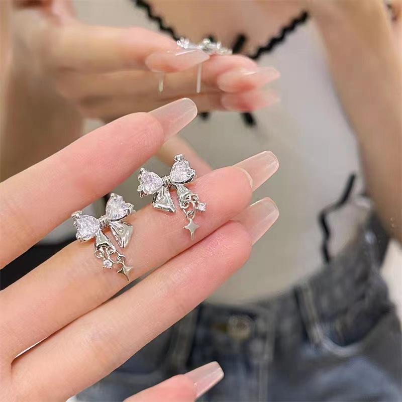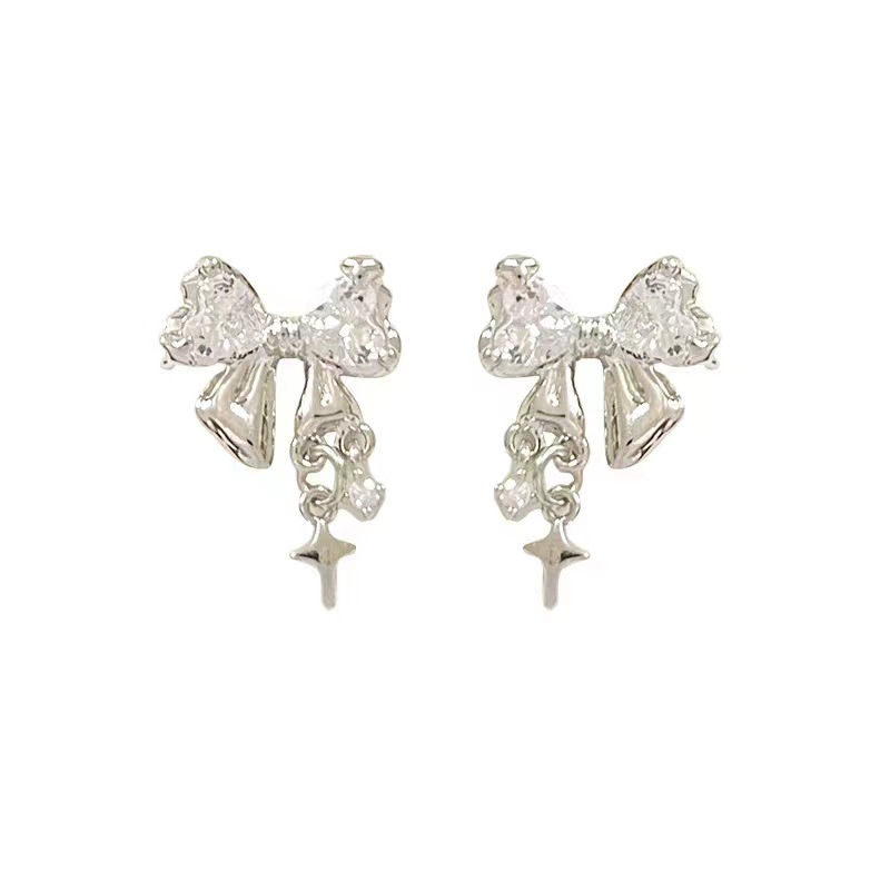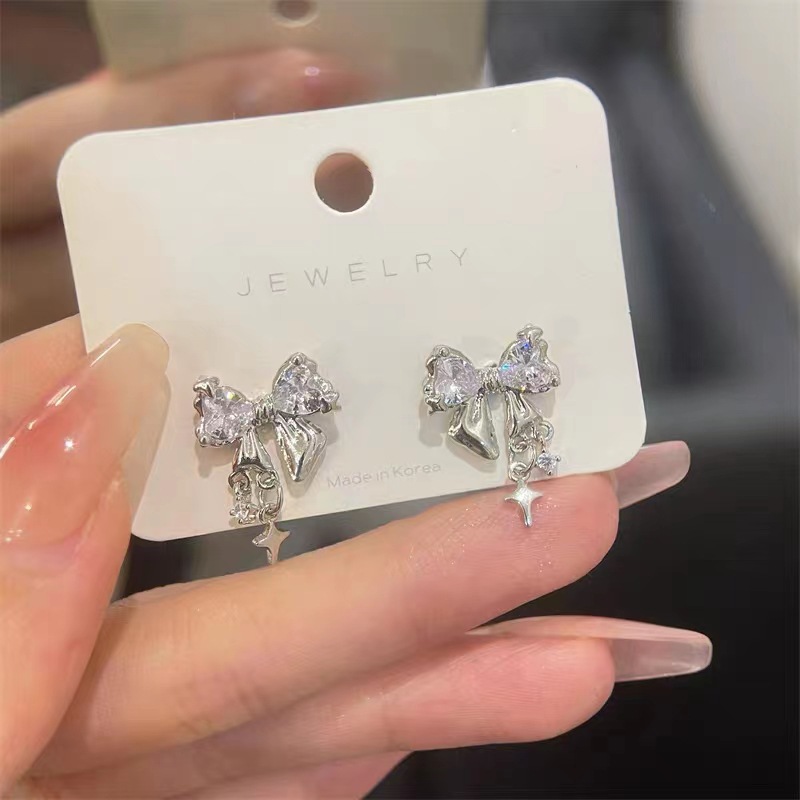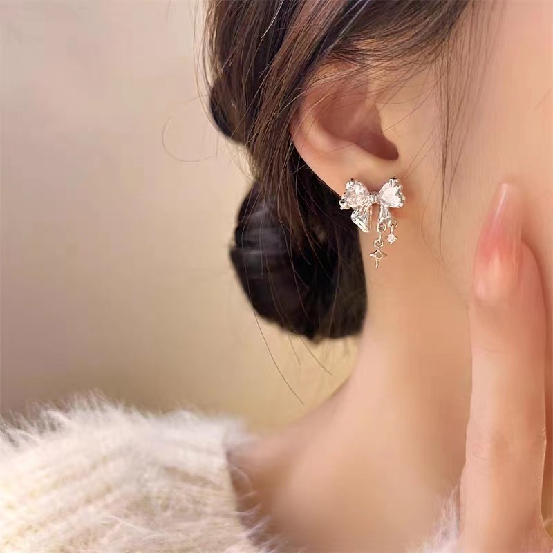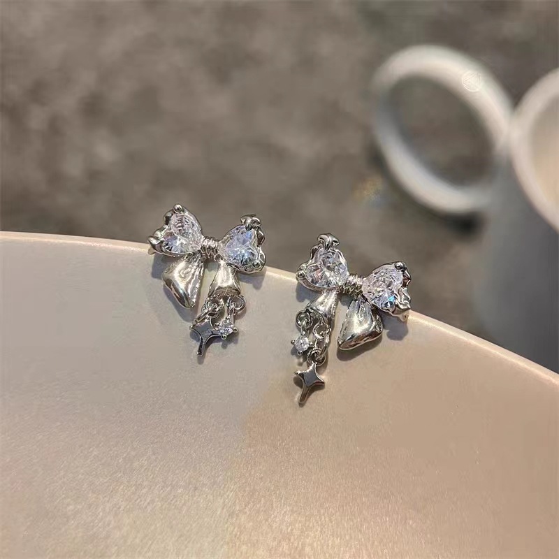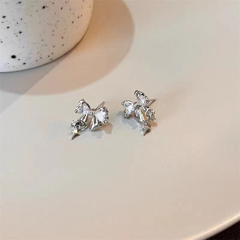 S925银针星光璀璨蝴蝶结锆石耳钉女小众设计感高级时尚气质耳环