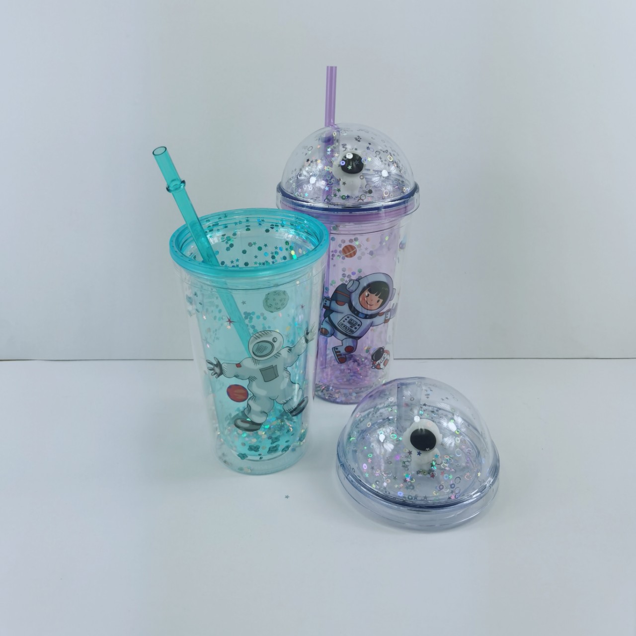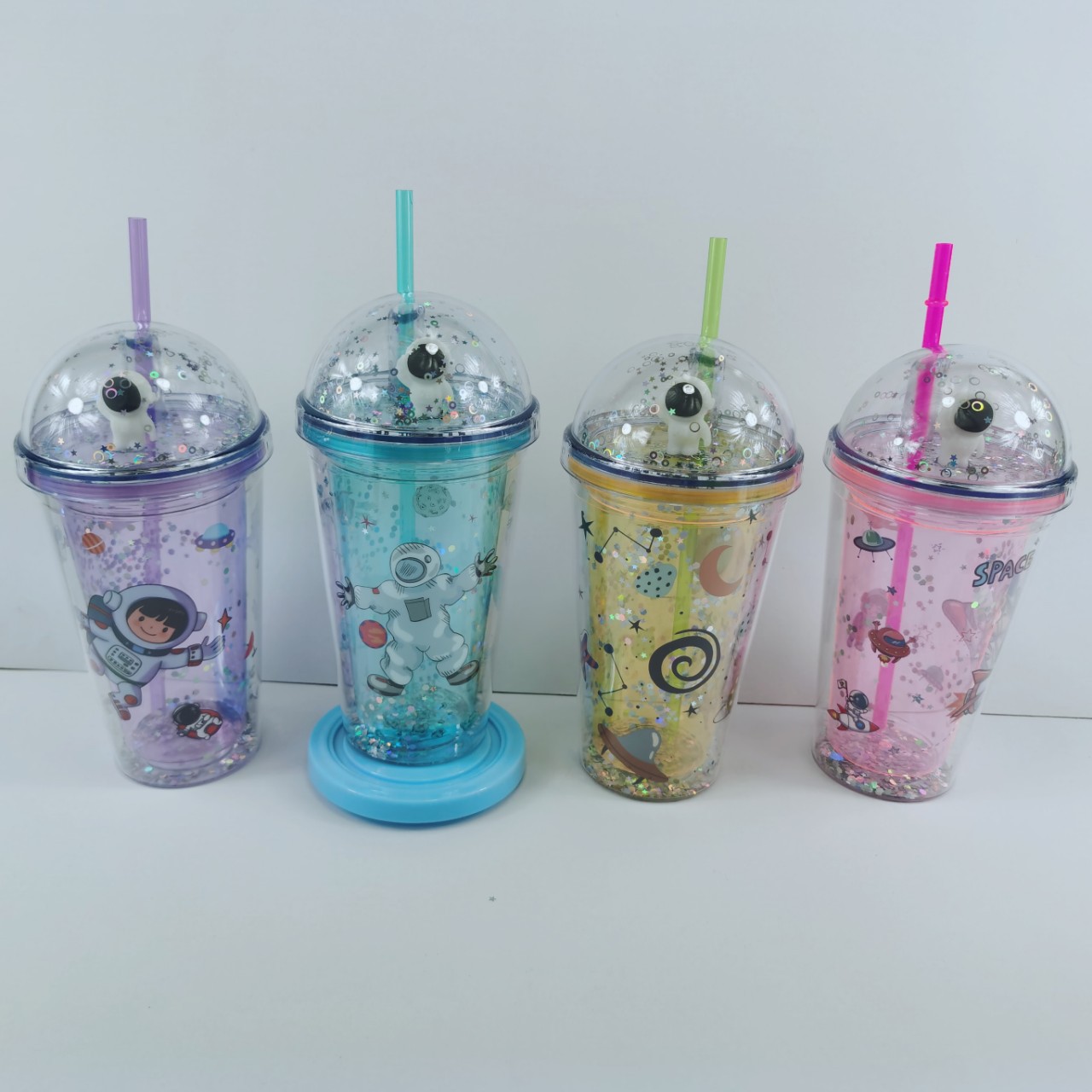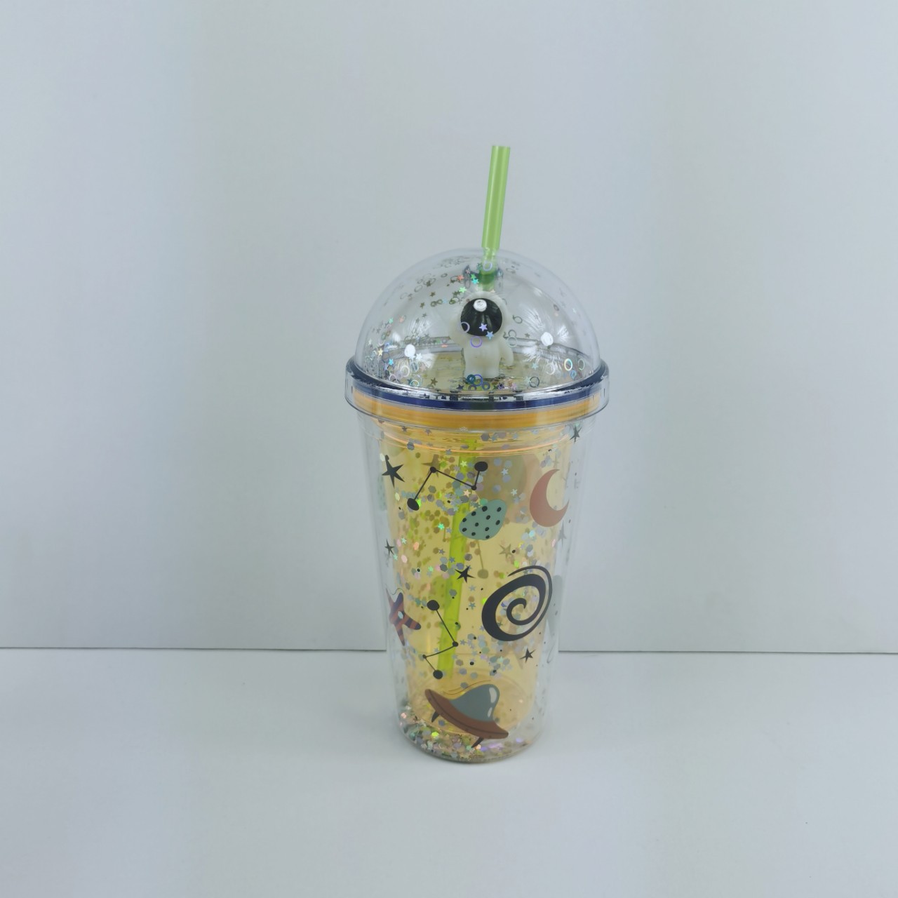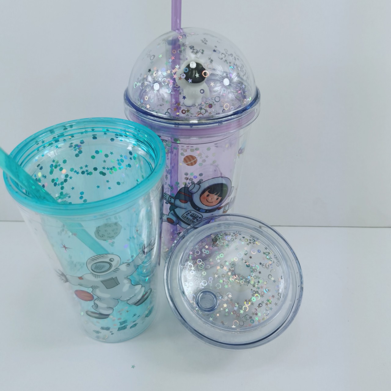 新款太空人双层透明吸管塑料杯卡通宇航员公仔水杯冰杯礼品杯批发