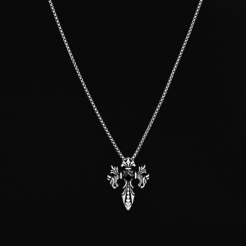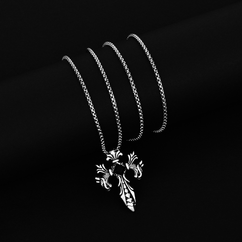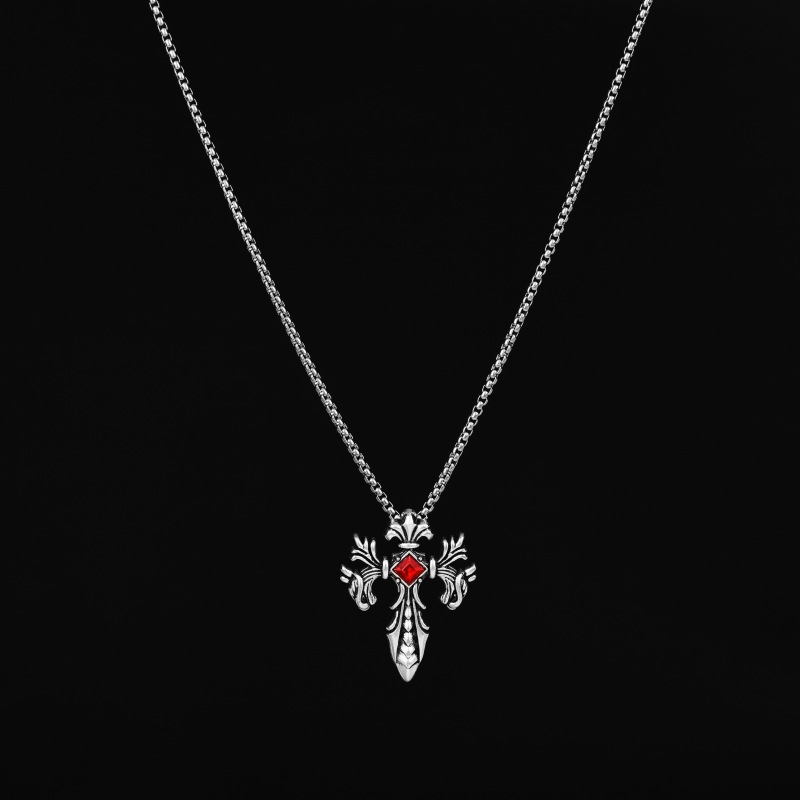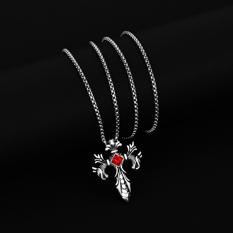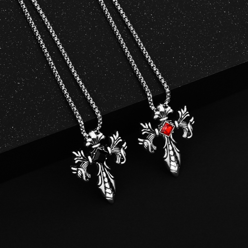 跨境亚马逊欧美风红宝石十字架钛钢项链潮酷爆款新款双龙吊坠饰品
