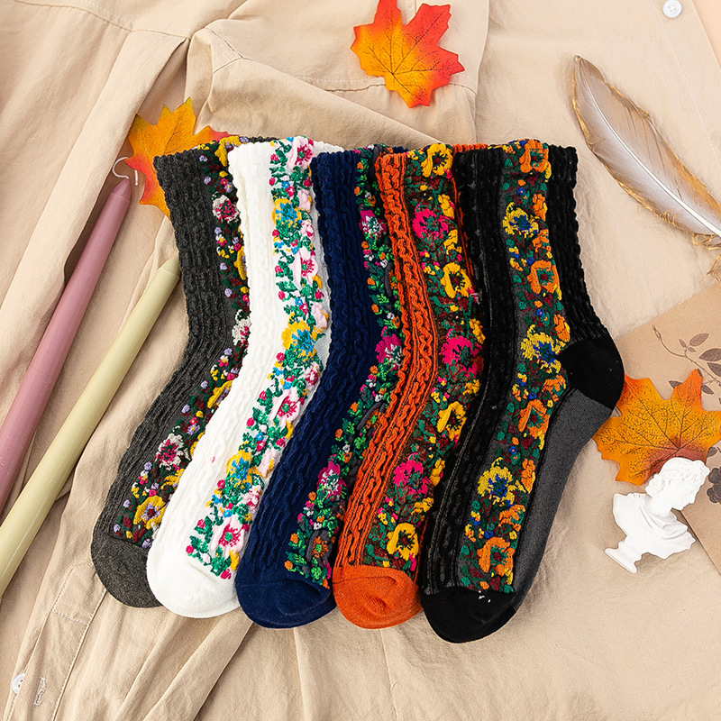 新疆棉袜子冬天批发女复古民族风袜子潮流女士碎花中筒条纹纯棉袜