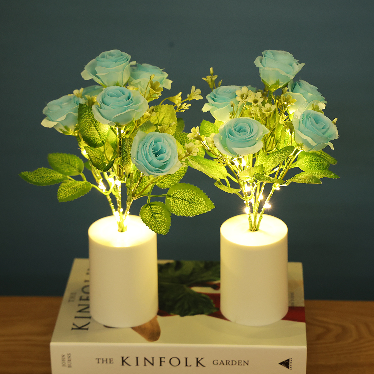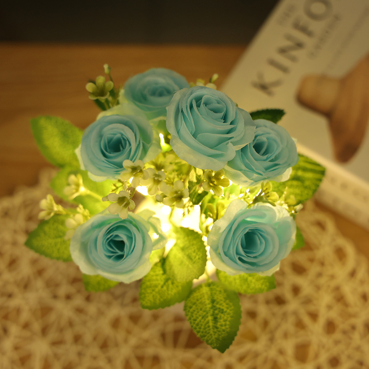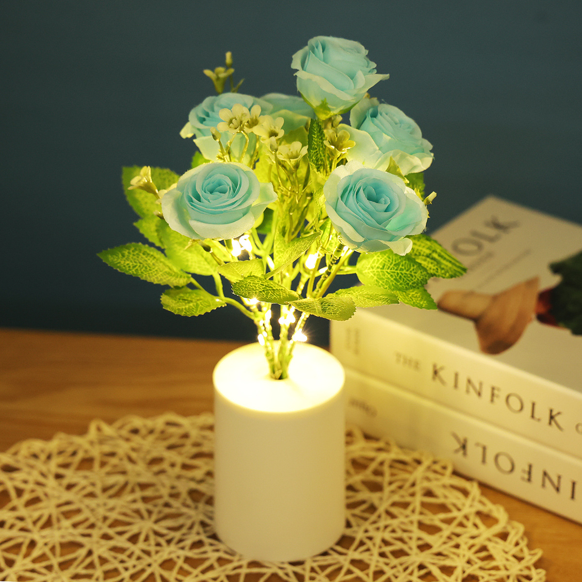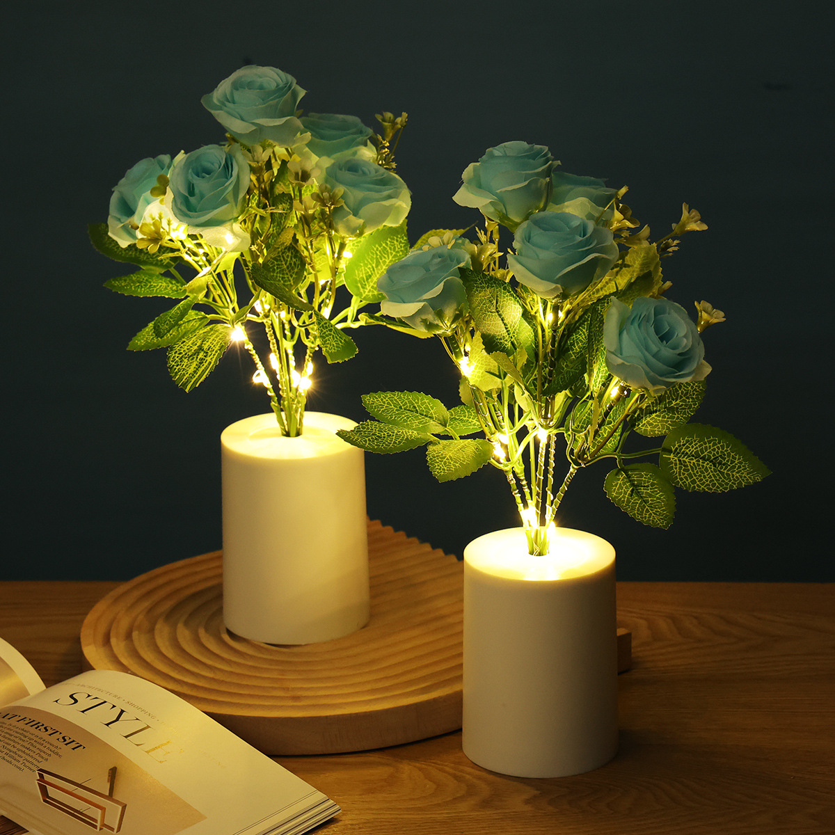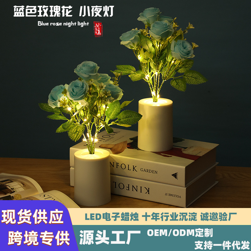 跨境专供蓝色玫瑰花小夜灯LED蜡烛灯仿真花束家居装饰婚庆摆件