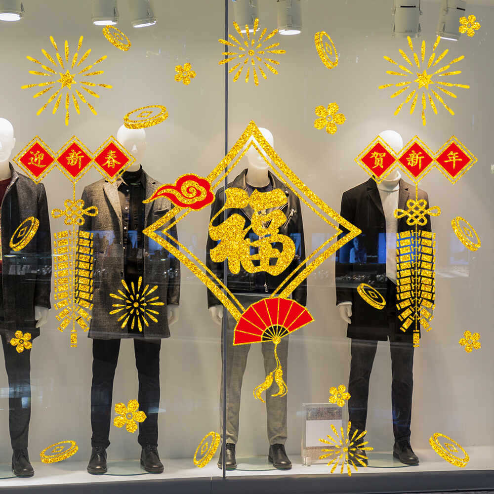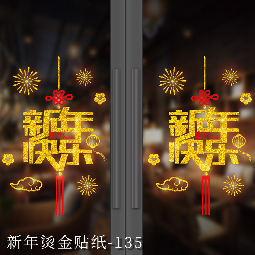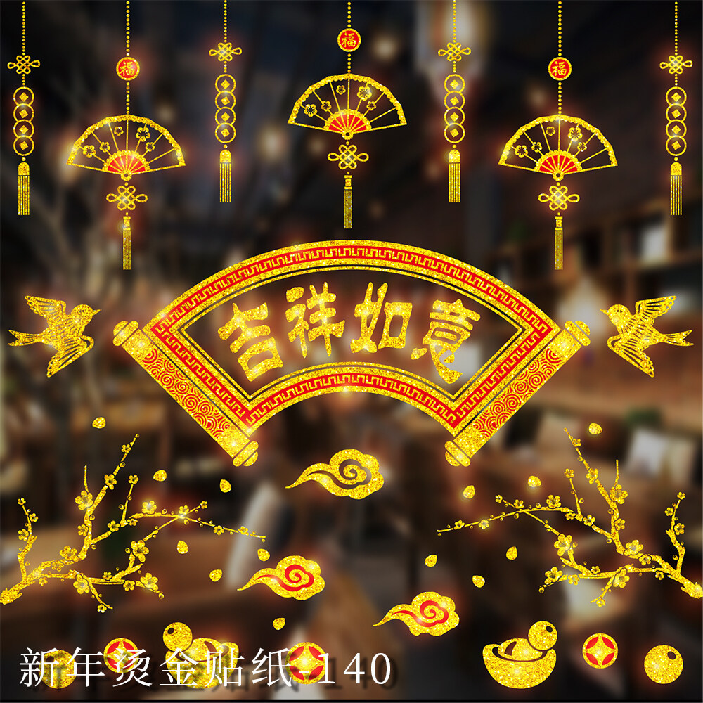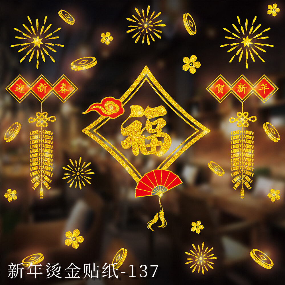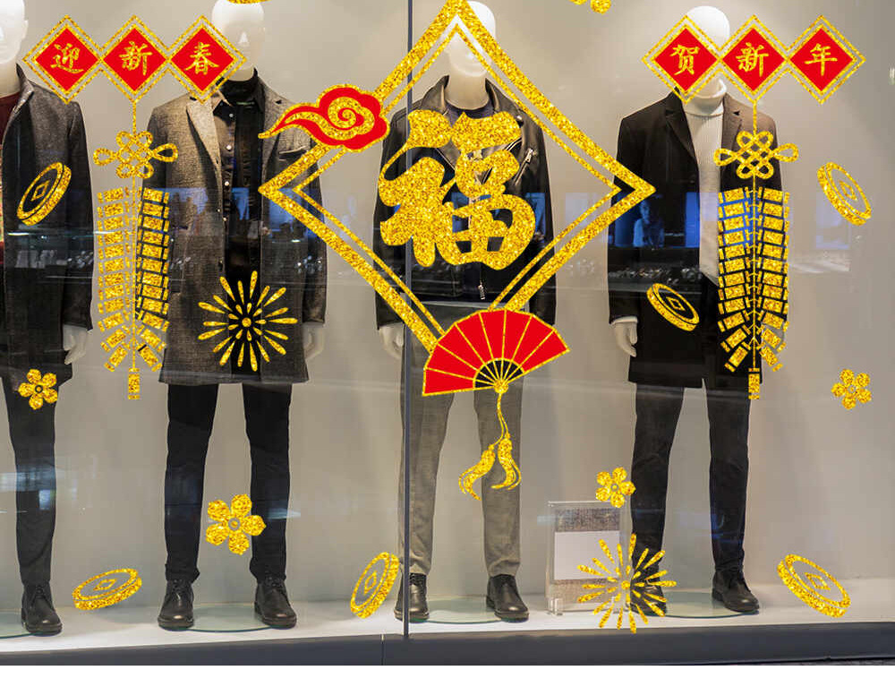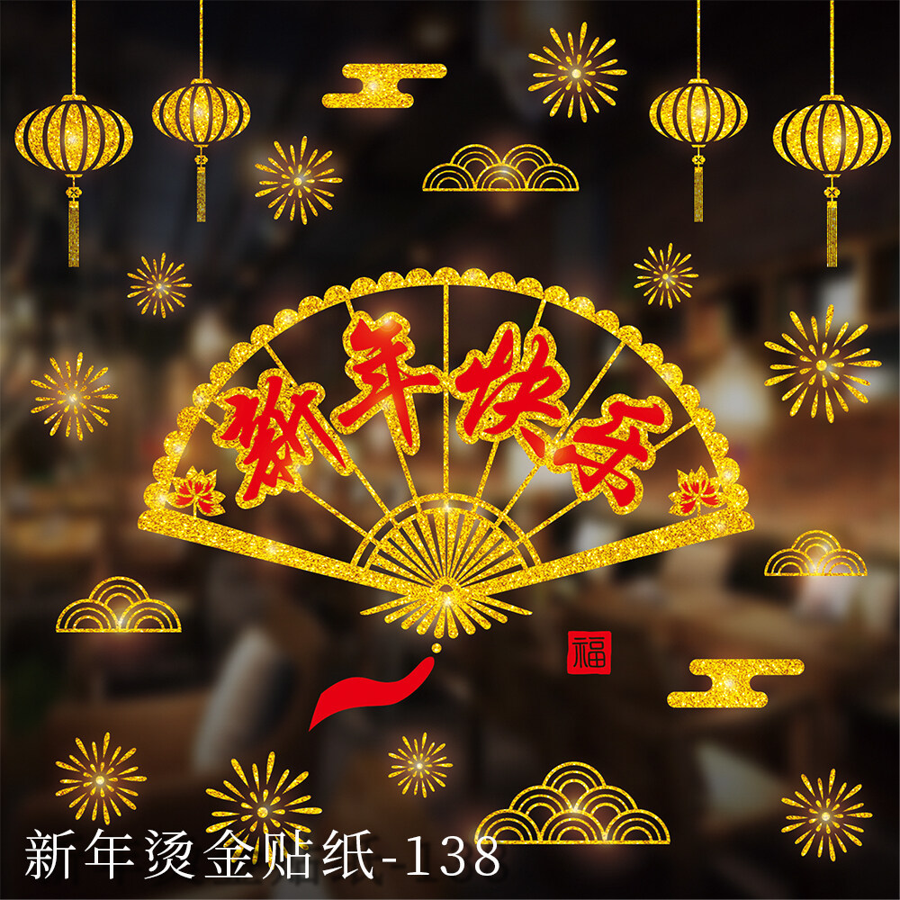 2025春节新年彩色金粉静电贴窗贴橱窗装饰商场酒元旦装饰玻璃窗贴