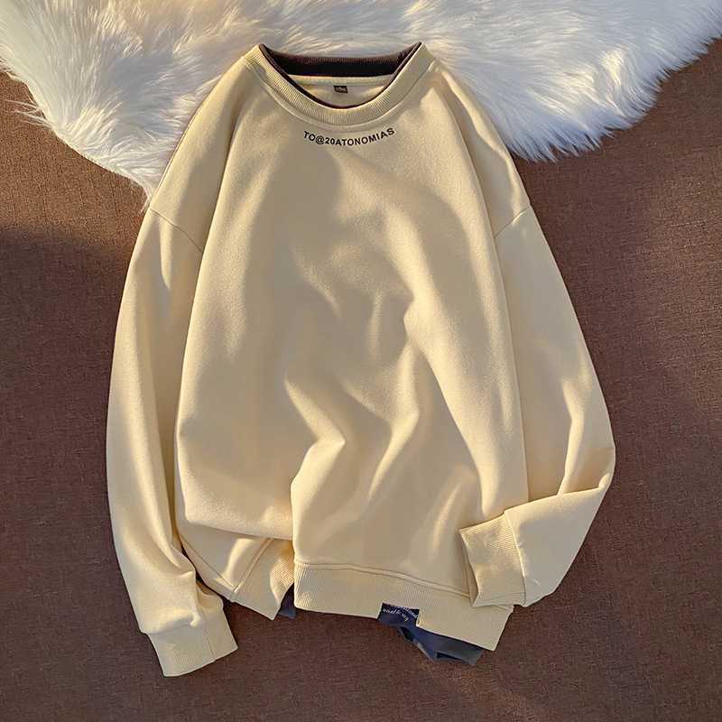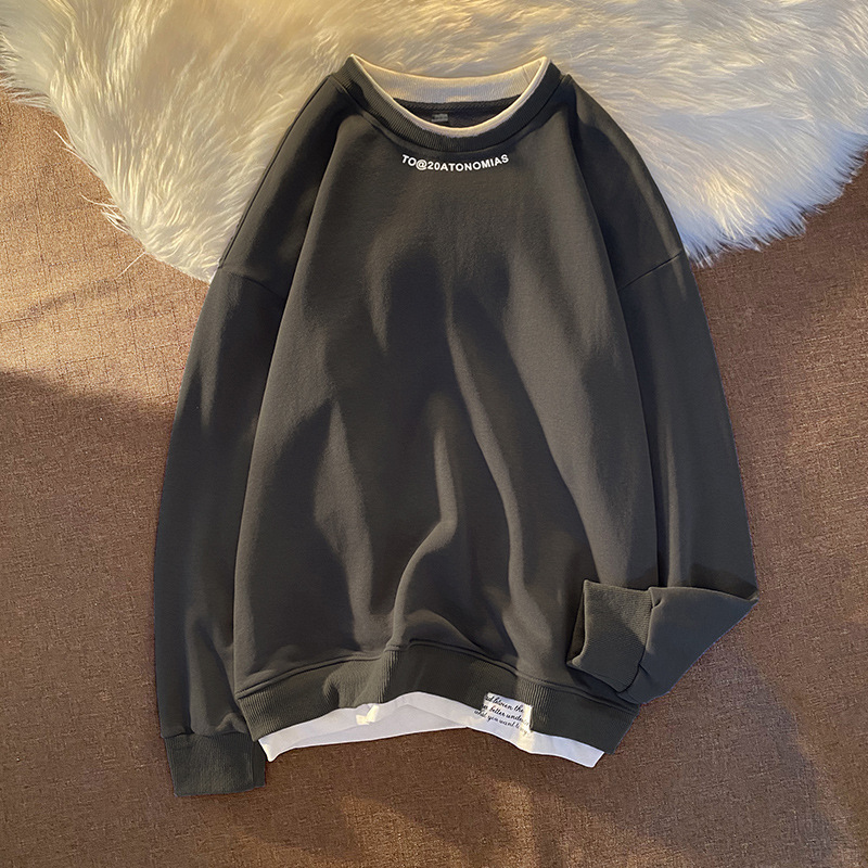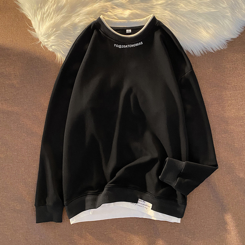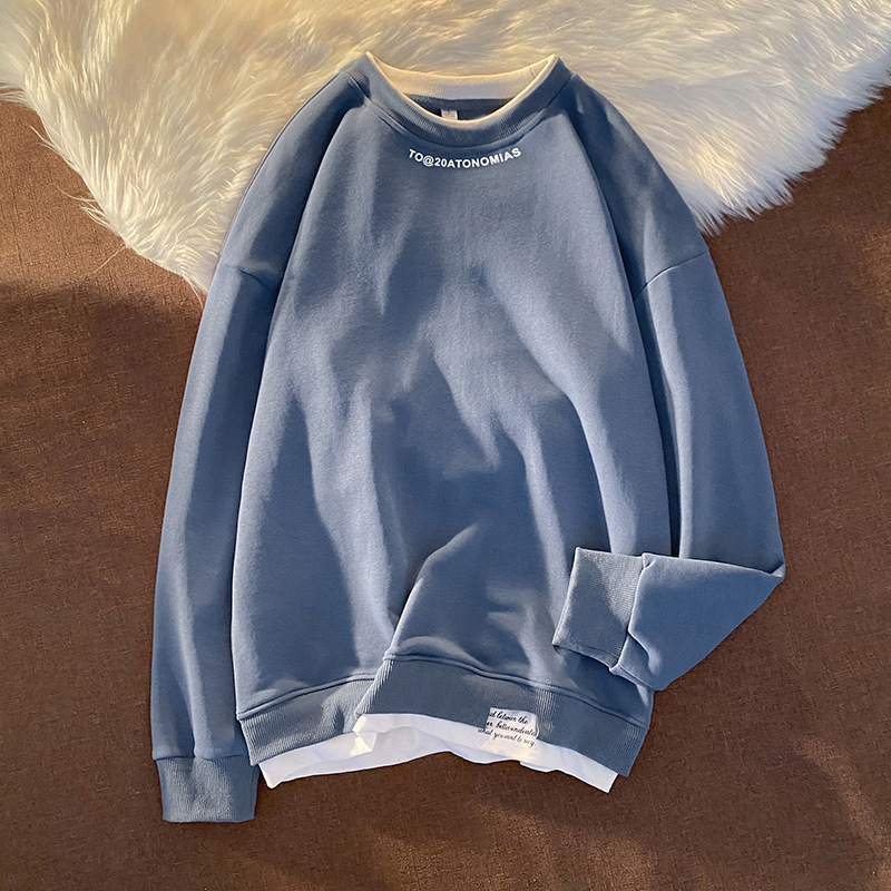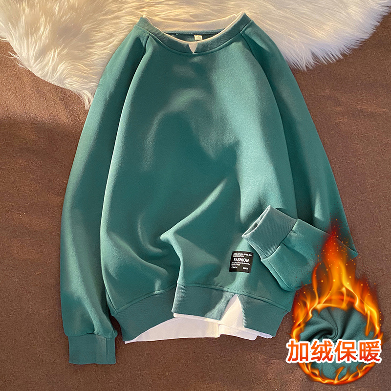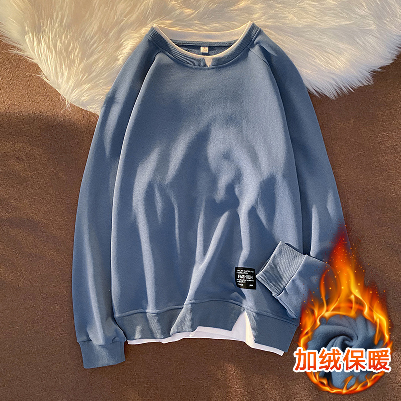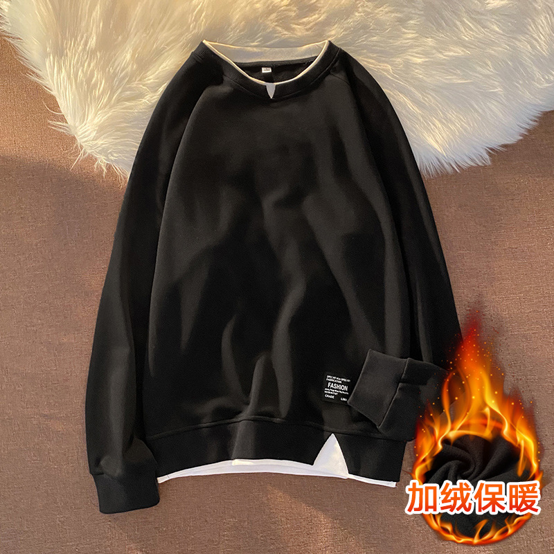 假两件加绒卫衣男士秋冬新款圆领休闲宽松长袖上衣打底衫男生潮牌