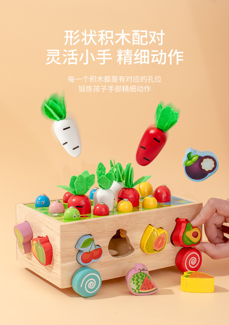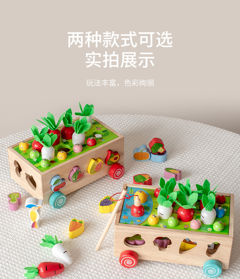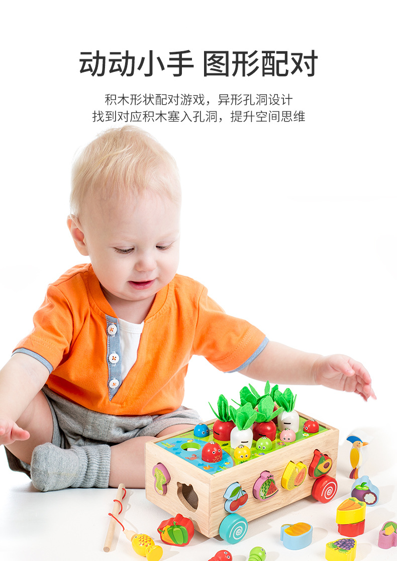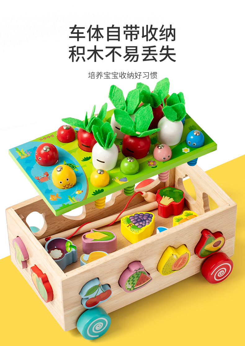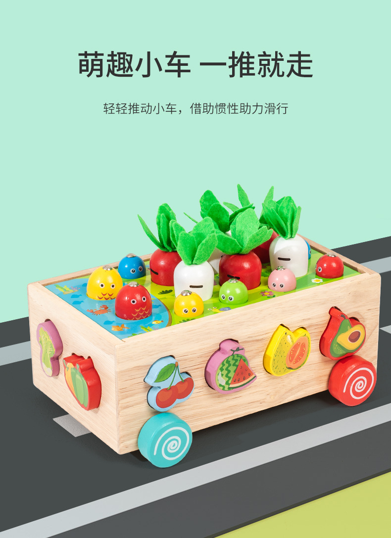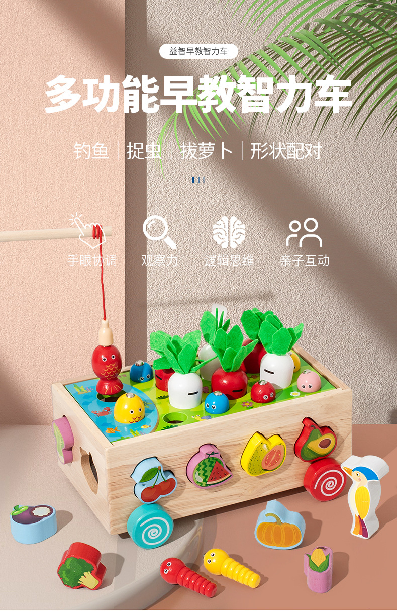跨境木制儿童智力车形状积木配对趣味钓鱼拔萝卜拆装早教益智玩具