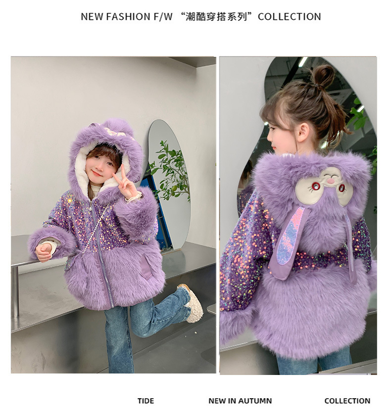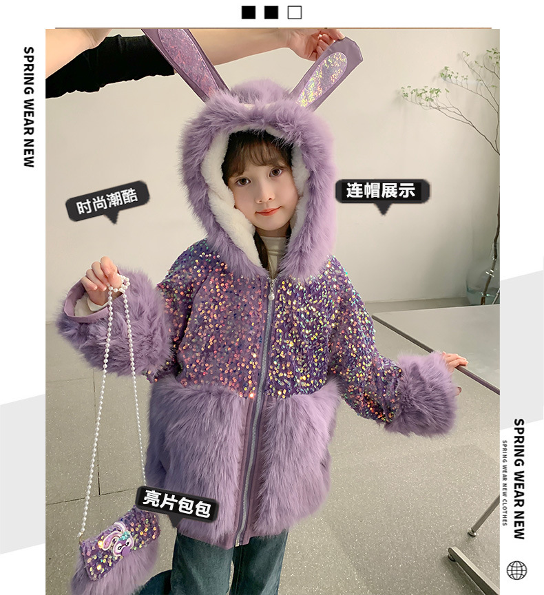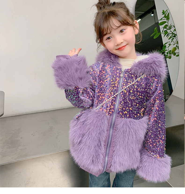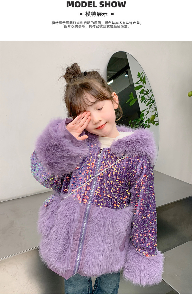女童重工亮片皮草毛毛衣2023冬装儿童轻奢风加绒加厚连帽毛大衣潮