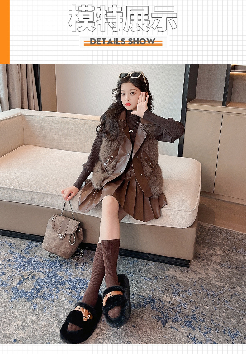 女童套装秋冬装时髦洋气仿皮草马甲三件套中大儿童宝宝加厚皮裙潮