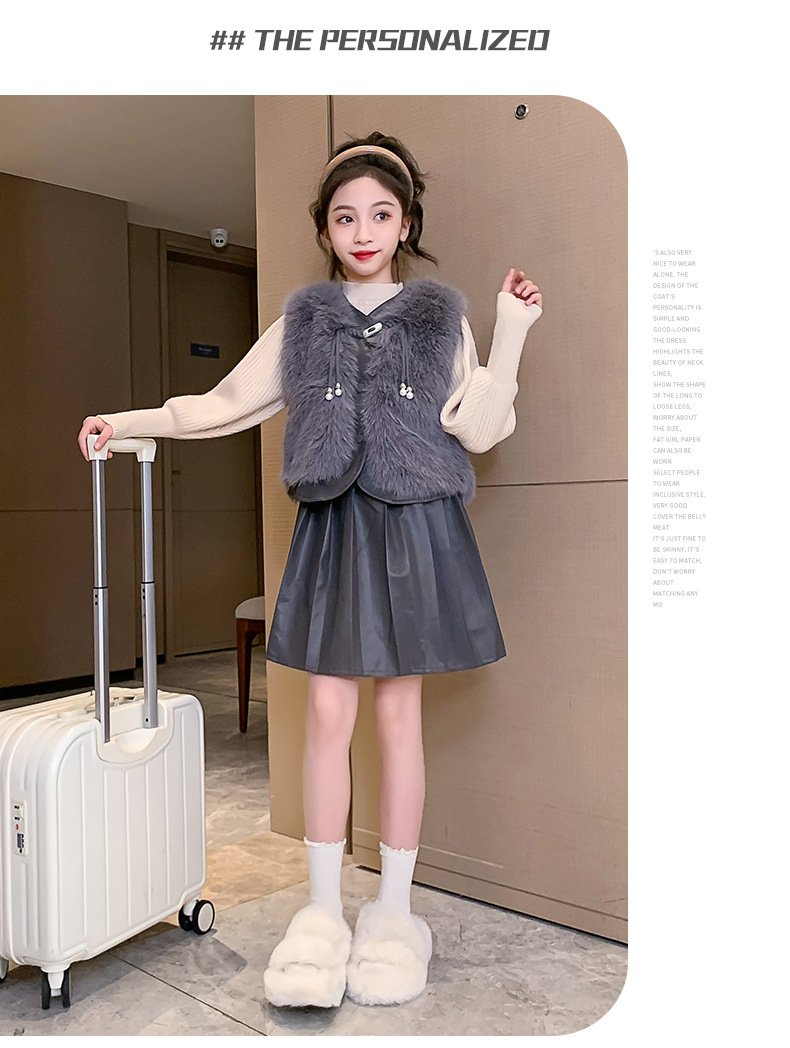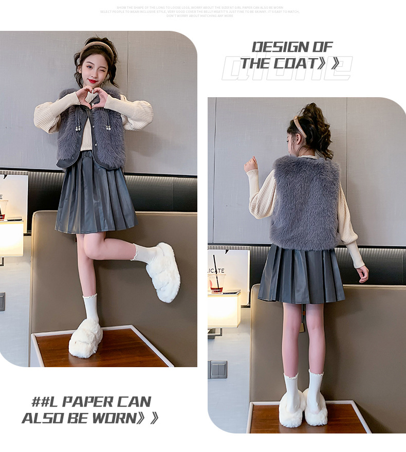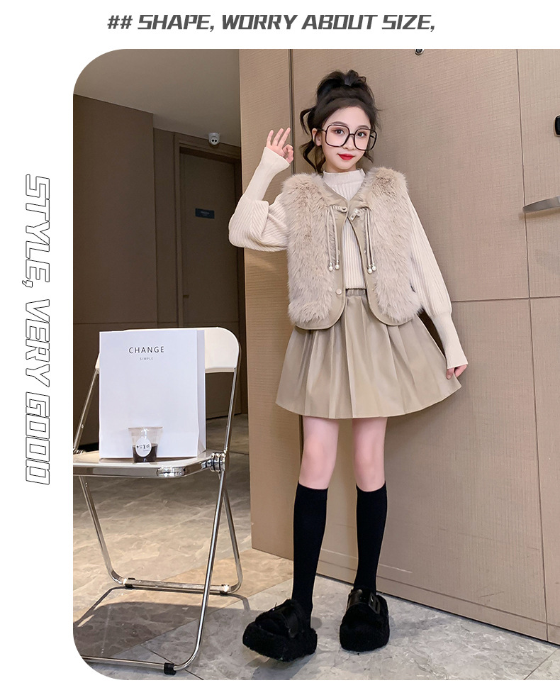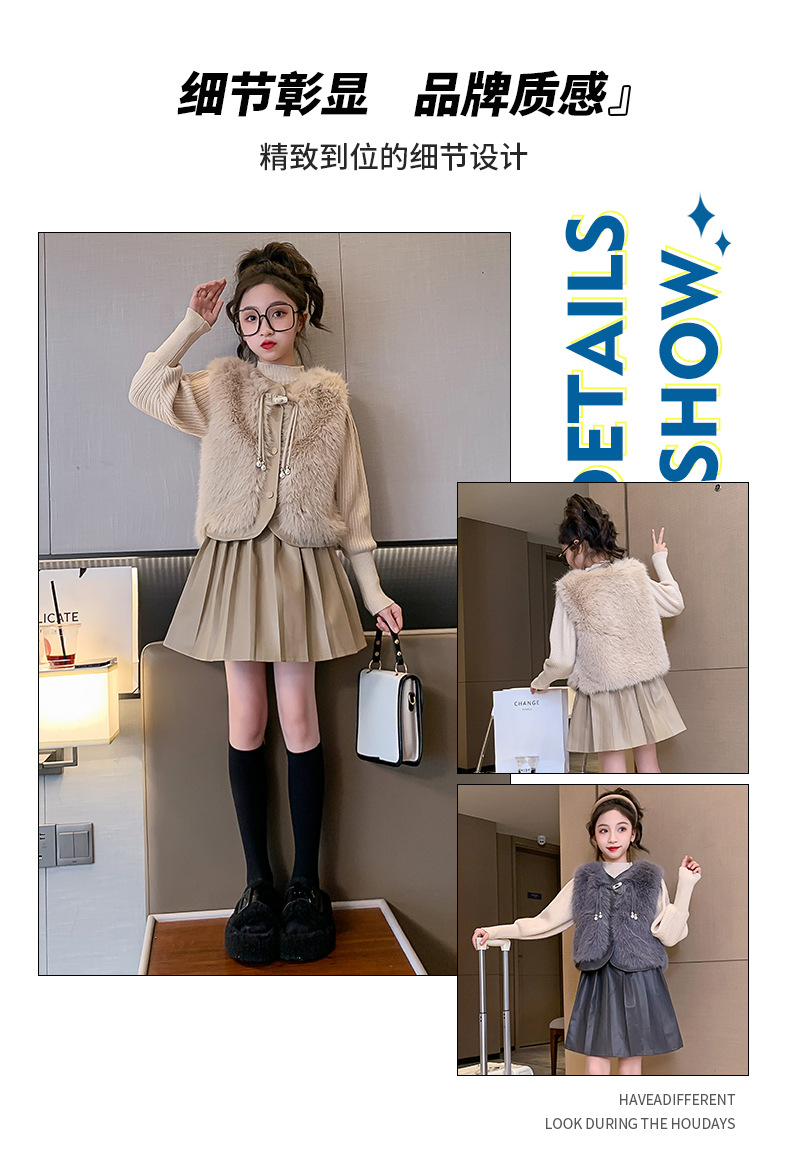 女童皮草马甲套装2023新款女孩小香风秋冬装儿童百褶半身裙三件套
