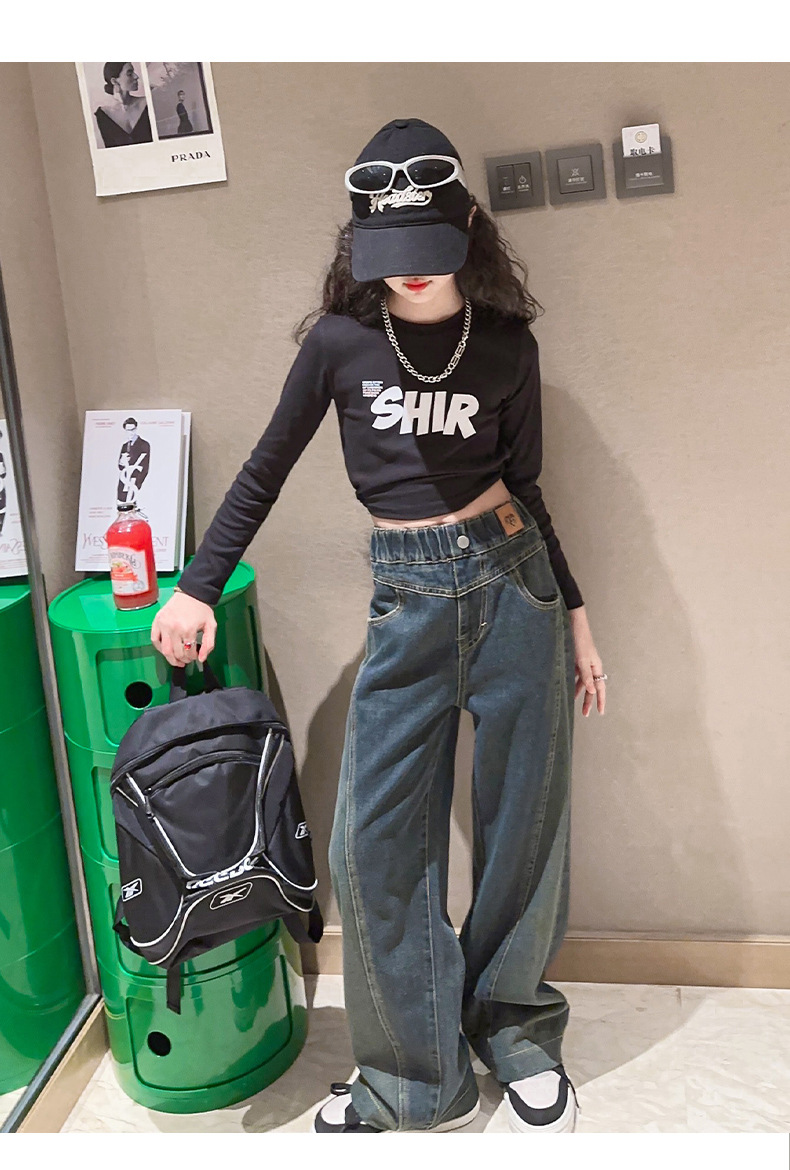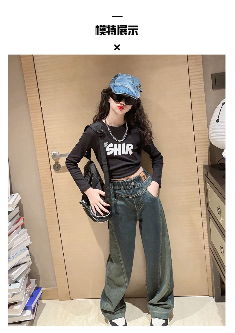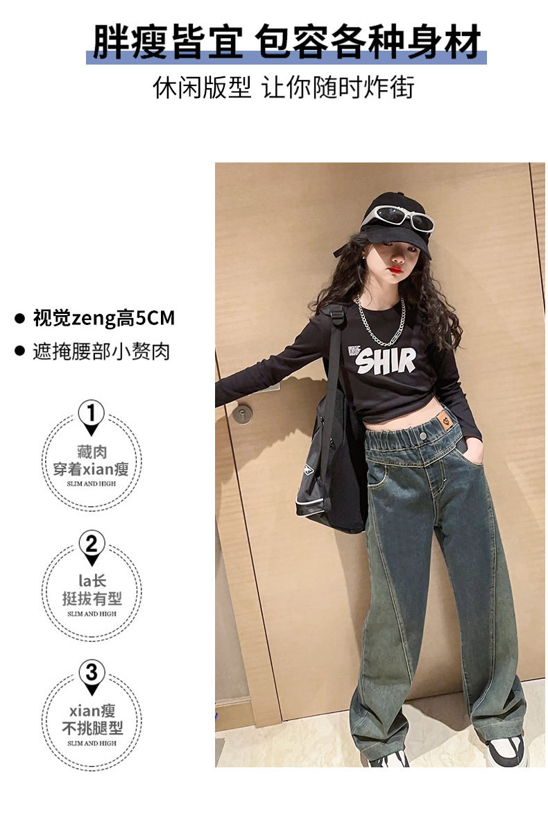 女童黑色牛仔裤春秋款2023新款儿童直筒长裤女大童秋装阔腿裤宽松