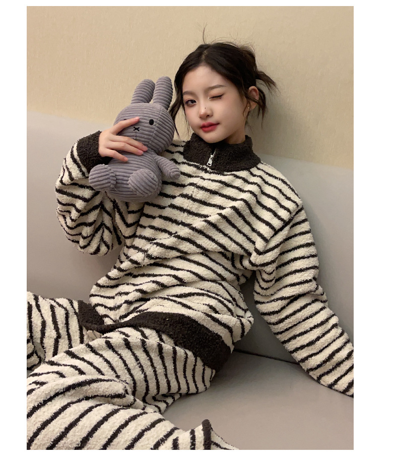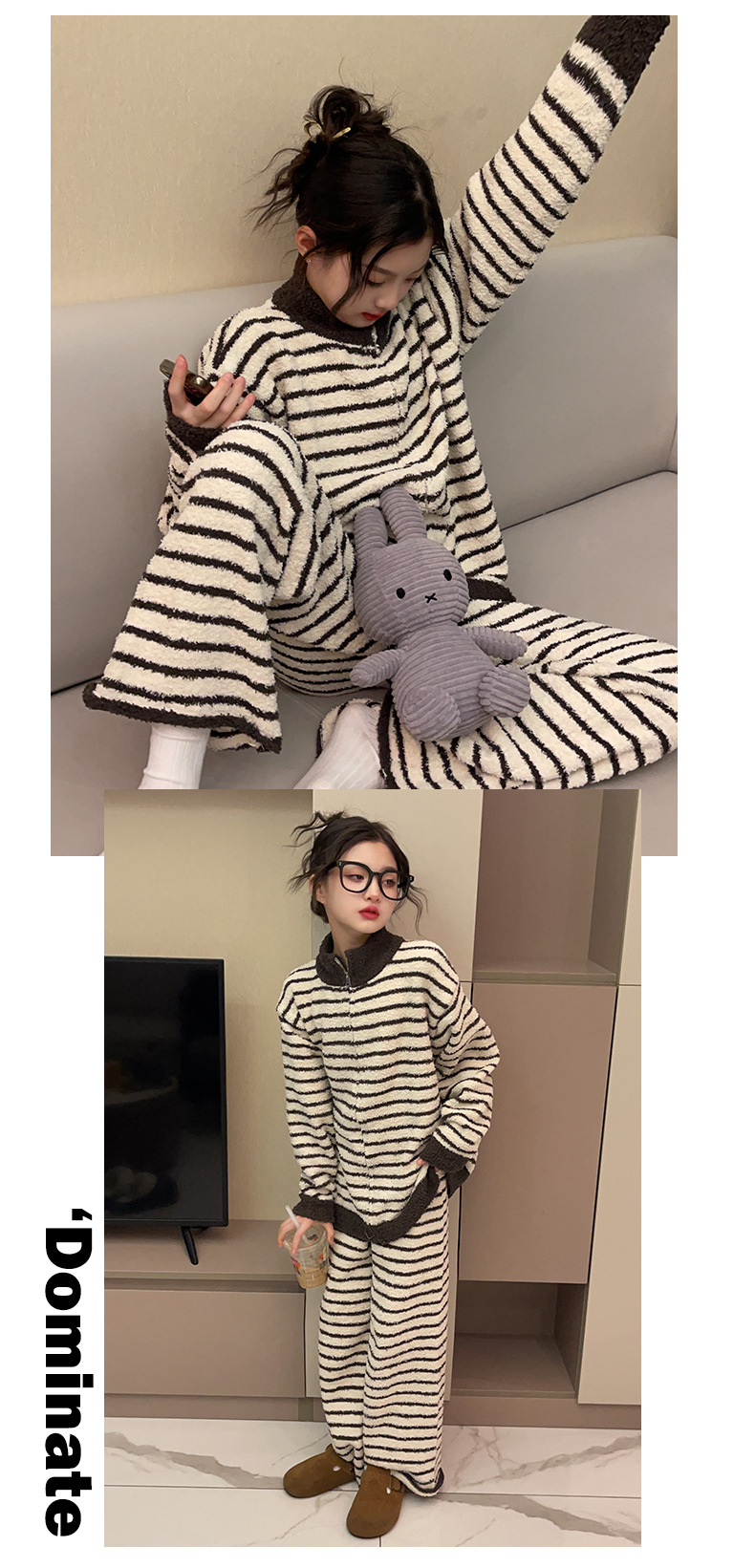 女童条纹家居服套装2023秋冬款儿童时髦保暖内衣珊瑚绒加厚睡衣潮