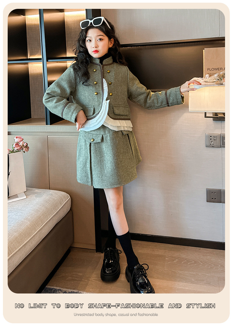 女童套装2023新款高端小香风秋冬两件套夹棉加厚外套上衣半身裙潮