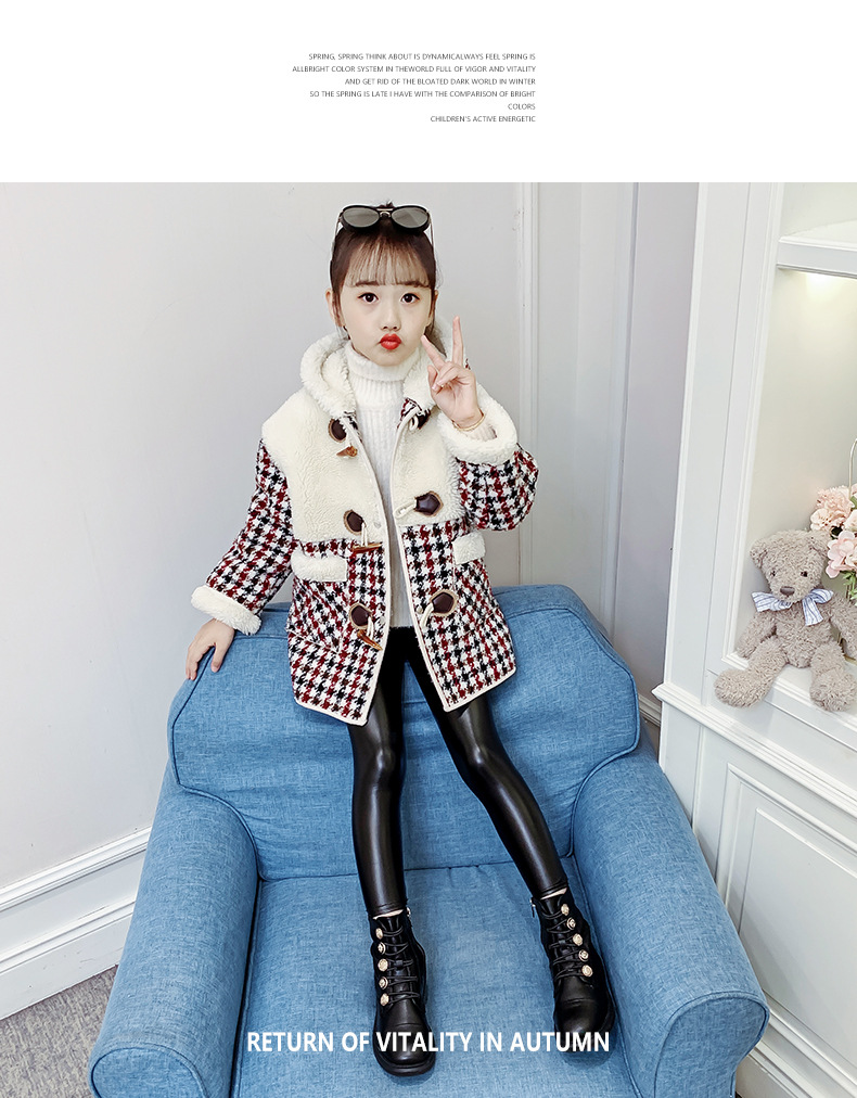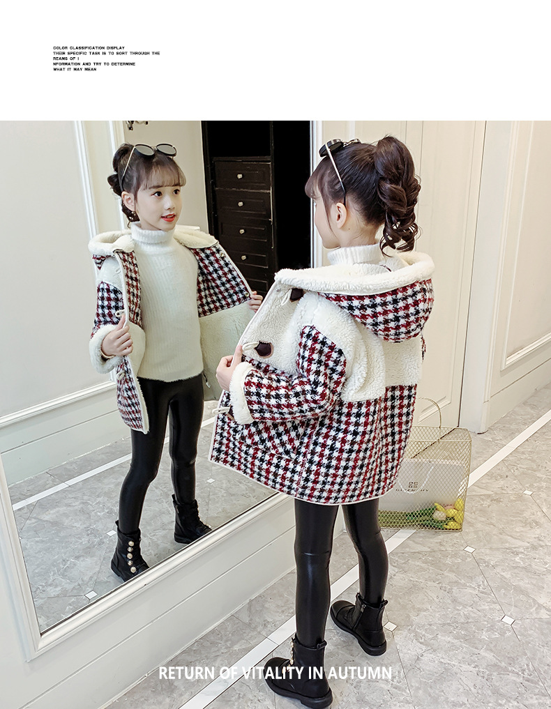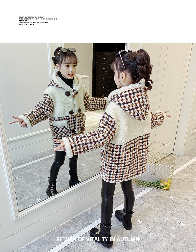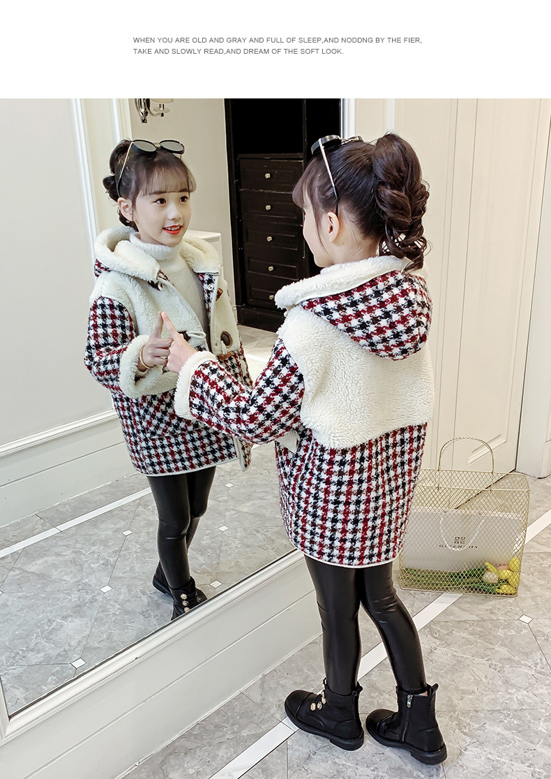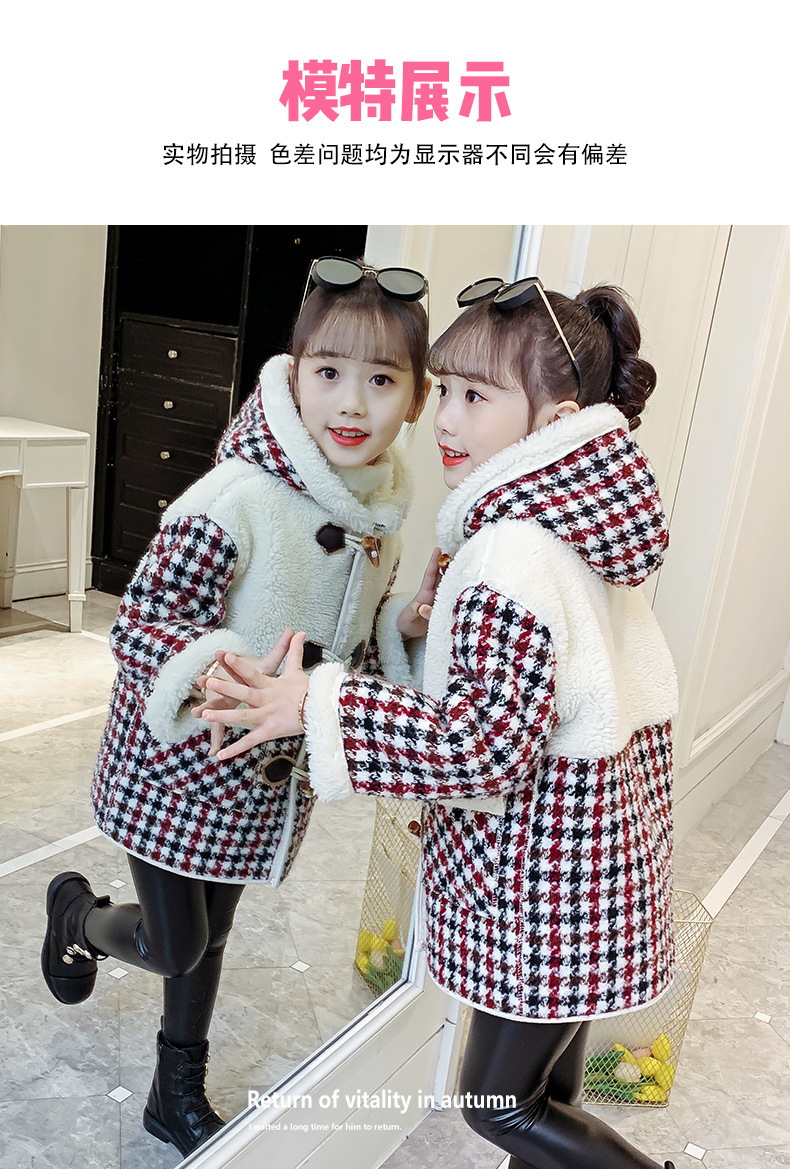 女童秋冬装外套2023新款儿童女孩冬季加绒加厚中长款格子羊羔大衣