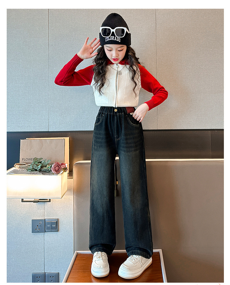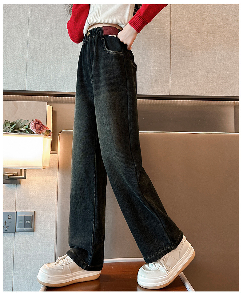 女童牛仔阔腿裤秋冬季2023新款儿童女大童加绒加厚直筒裤黑色裤子