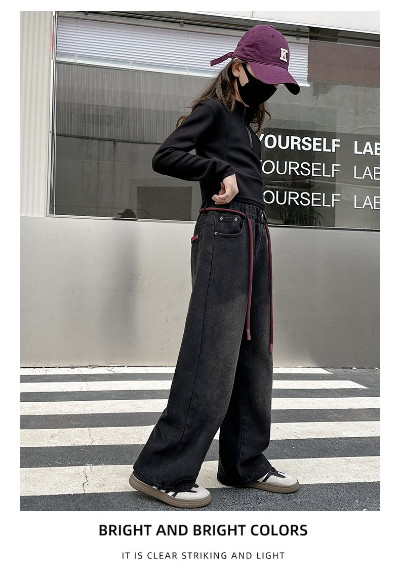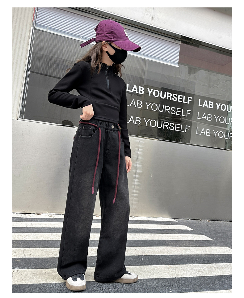 女童黑色加绒牛仔裤秋冬季2023新款大童女孩宽松直筒阔腿儿童裤子