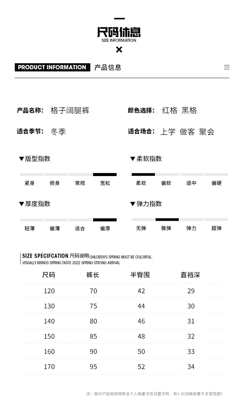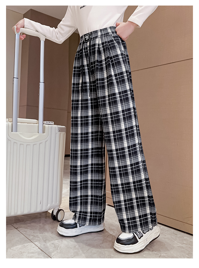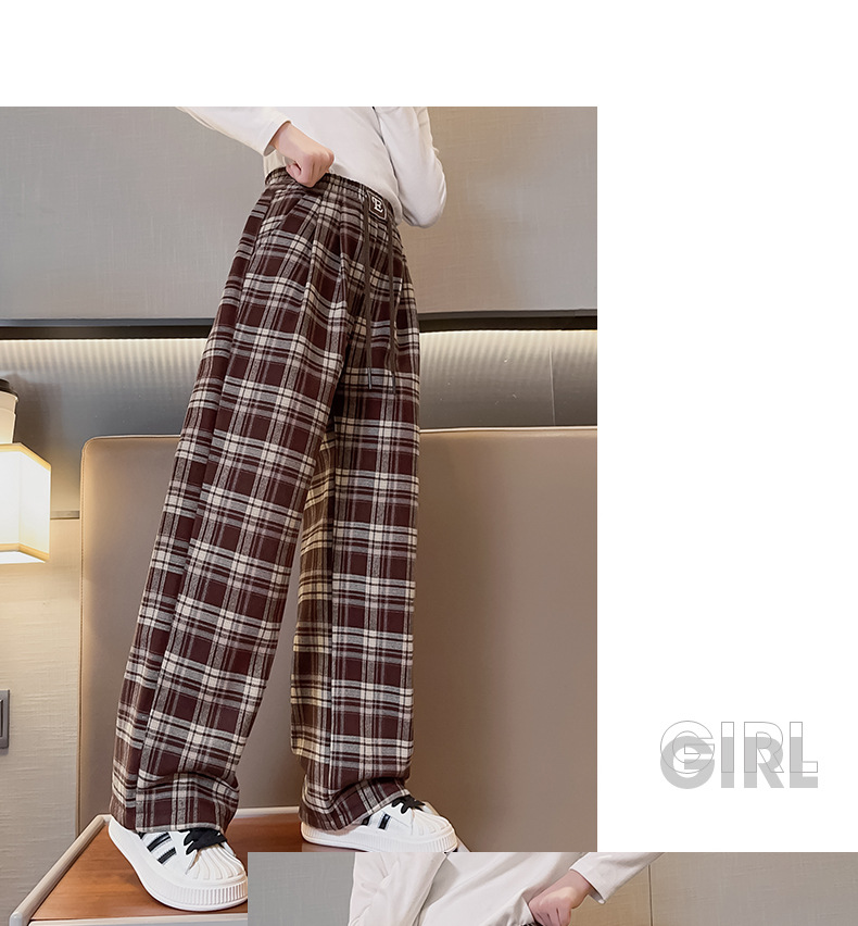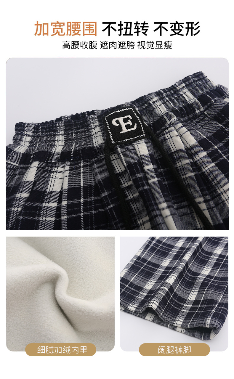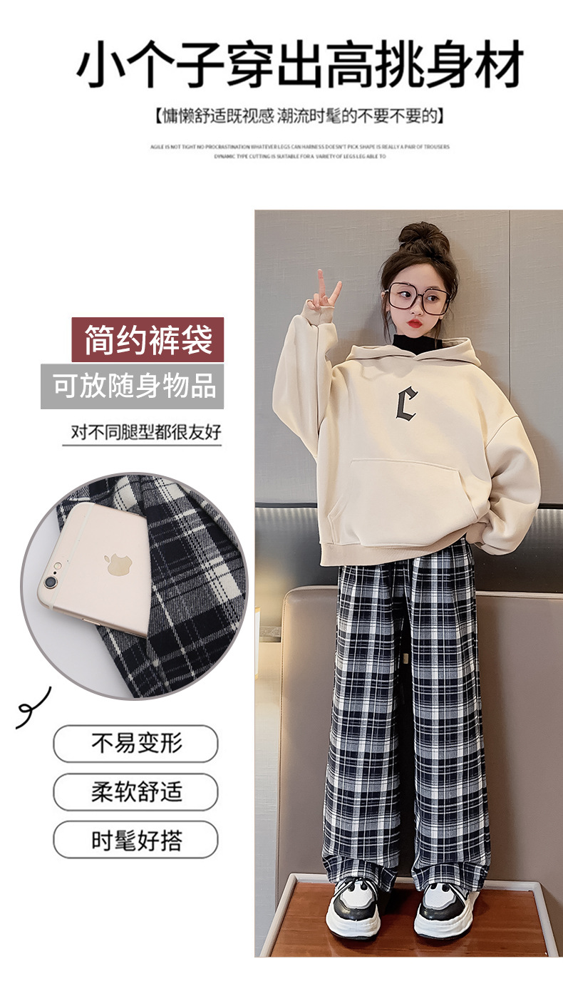 女童加绒阔腿裤2023新款大童女孩洋气格子加厚一体绒儿童时髦裤子